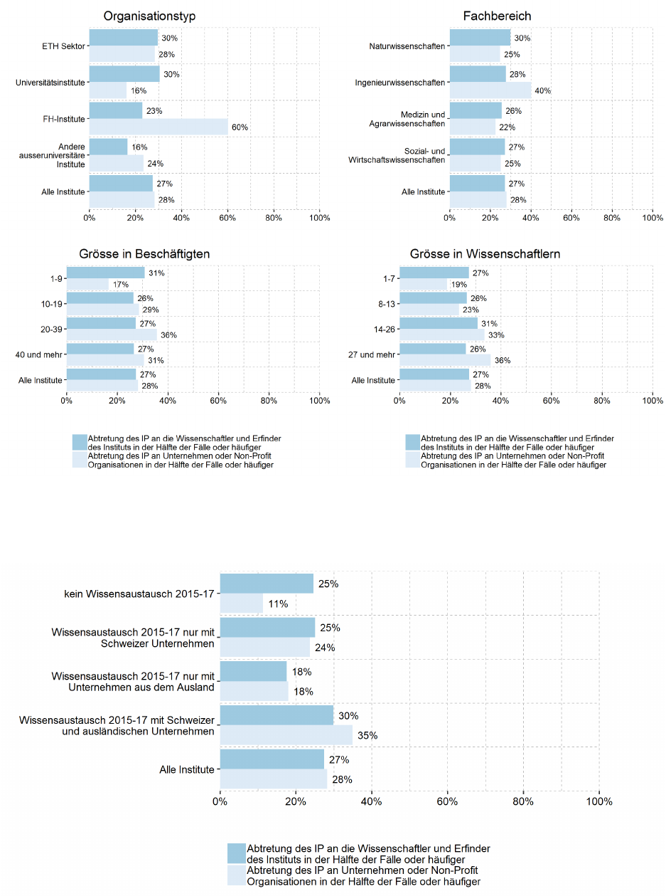 Wissens- und Technologietransfer der Wissenschaftsorganisationen in der Schweiz 121 Abbildung 46: Abtretung des Eigentums am Wissen und Technologien in der Hälfte der Fälle oder häufiger nach Empfängern und Organisationstypen, Grösse in Beschäftigten, Grösse in Wissen- schaftlern und Fachgebiet, 2015–17 Quelle: FHNW-Wissenschaftserhebung (2018). Abbildung 47: Anteil der Institute, die das Eigentum am Wissen und Technologien in der Hälfte der Fälle oder häufiger abtreten nach Empfängern und Partnern im Wissensaustausch, 2015–17 Quelle: FHNW-Wissenschaftserhebung (2018). Wissens- und Technologietransfer der Wissenschaftsorganisationen in der Schweiz 122 4.2.4 Unterstützung durch intermediäre Organisationen Der Wissens- und Technologietransfer wird schweizweit durch eine Vielzahl von intermediären Or- ganisationen (IO) unterstützt, die im Auftrag von Bund, Kantonen, Gemeinden, Hochschulen und Forschungsorganisationen, Wirtschaftsverbänden, Branchenverbänden, Banken oder anderen Or- ganisationen aktiv werden. Abstrahierend von der einzelnen Organisation wird nachfolgend ein Überblick darüber gegeben, a) welche Organisationstypen in den Instituten bekannt sind, b) wie ihre Bedeutung eingeschätzt wird, und c) welche Eigenschaften die als bedeutend eingestuften Organi- sationen aufweisen. a) Verfügbarkeit. Die öffentliche Innovationsförderung steht grundsätzlich allen zur Verfügung – ex- plizit sehen dies auch knapp zwei Drittel der Befragten so. Immerhin noch von etwas mehr als der Hälfte der Institute gibt an, dass die für die Organisation zuständige WTT-Stelle zu ihrer Verfügung steht. Alle anderen Organisationstypen sind jeweils bei deutlich weniger Instituten in der Wahrneh- mung präsent (Abbildung 48). Circa 12% der Befragten oder 105 Institute geben an, dass ihnen keine der aufgelisteten Organisationen zur Verfügung stand. In den offenen Antworten wurde dabei deutlich, dass die Befragten sich i.d.R. bislang nicht mit dem Wissensaustausch bzw. solchen Orga- nisationen befasst und deshalb keinen Bedarf für Unterstützung hatten. Abbildung 48: Angaben der Institute zu den zur Verfügung stehenden intermediären Organisationen 2015–17 Quelle: FHNW-Wissenschaftserhebung (2018). b) Bedeutung. Zusätzlich zur Verfügbarkeit wurde auch die Bedeutung eines jeden Organisations- typs für den Wissensaustausch und die Zusammenarbeit mit Unternehmen erfragt (Abbildung 49). Damit kann die Intensität der Nutzung und die Wirkung der IO auf den Wissensaustausch approxi- miert werden. Die mit Abstand grösste Bedeutung für den Wissensaustausch wird den Einrichtungen der öffentlichen Innovationsförderung zugewiesen: ca. 40% der Institute stufen diese als bedeutend Wissens- und Technologietransfer der Wissenschaftsorganisationen in der Schweiz 123 oder sehr bedeutend ein. Wissens- und Technologietransferstellen werden von rund einem Viertel der Institute als bedeutend bezeichnet. Für alle weiteren erfragten Organisationstypen sind die Un- terschiede gering und jeweils 80% der Institute oder mehr geben ihnen keine oder nur sehr geringe Bedeutung und weniger als 10% geben ihnen grosse oder sehr grosse Bedeutung. Die Breitenwir- kung der intermediären Organisationen ist damit mit Ausnahme der Innovationsförderung und punk- tuell der WTT-Stellen recht gering. Abbildung 49: Bedeutung der zur Verfügung stehenden intermediären Organisationen für den Wis- sensaustausch der Institute, 2015–17 Quelle: FHNW-Wissenschaftserhebung (2018). Unterscheidet man im nächsten Schritt die Institute wiederum nach ihrem Organisationstyp, dem Fachgebiet und der Grösse (gemessen in Beschäftigten und in Wissenschaftlern), so ergeben sich einige signifikante Unterschiede in der Bedeutung der intermediären Organisationen (Abbildung 50): • Organisationstyp. Insbesondere die ETH-Einrichtungen und die Fachhochschulen weisen spezifische Muster auf: im ETH-Sektor stufen immerhin 45% der Institute die öffentliche Inno- vationsförderung als bedeutend oder sehr bedeutend ein und 31% äussern dies im Hinblick auf die WTT-Stellen. In den FH geben sogar mehr als drei Viertel aller Institute der Innovati- onsförderung eine grosse oder sehr grosse Bedeutung. Immerhin je 22% der FH-Institute und damit prozentual deutlich mehr als in den anderen Organisationstypen bewerten auch koope- rative Forschungsinstitute und Kompetenzzentren und thematische Netzwerke und Clusteror- ganisationen als bedeutend. Bei den Universitätsinstituten fällt auf, dass sie praktisch allen IO seltener Bedeutung zuordnen, als Institute der anderen Organisationstypen. Wissens- und Technologietransfer der Wissenschaftsorganisationen in der Schweiz 124 • Fachgebiet. Ein grösserer Anteil der Institute in den Ingenieurwissenschaften gibt jeweils den IO Bedeutung für ihren Wissensaustausch, als in den anderen Fachgebieten. Dies reflektiert ohne Zweifel die grössere Beteiligung der Ingenieurinstitute am WTT bzw. im Umkehrschluss die geringere Beteiligung der anderen Fachgebiete. Auch die Institute der Medizin und Agrar- wissenschaften geben den WTT-Stellen überdurchschnittlich häufig hohe Bedeutung. Für wirtschafts- und sozialwissenschaftliche Institute scheinen kooperative Forschungsinstitute und Kompetenzzentren ein leicht stärkeres Gewicht zu haben. • Grösse. Grössere Institute geben jeweils allen IO häufiger eine grosse oder sehr grosse Be- deutung, als kleinere Institute. Auch dies spiegelt wiederum die mit der Grösse zunehmende Beteiligung am Wissensaustausch wider. Abbildung 50: Anteil der als bedeutend oder sehr bedeutend bewerteten intermediären Organisatio- nen für den Wissensaustausch der Institute nach Organisationstyp, Fachgebiet und Grösse Quelle: FHNW-Wissenschaftserhebung (2018). Wissens- und Technologietransfer der Wissenschaftsorganisationen in der Schweiz 125 Die Bedeutung intermediärer Organisationen korreliert teilweise mit der Nutzung und Bedeutung von Wissenstransfermechanismen. 