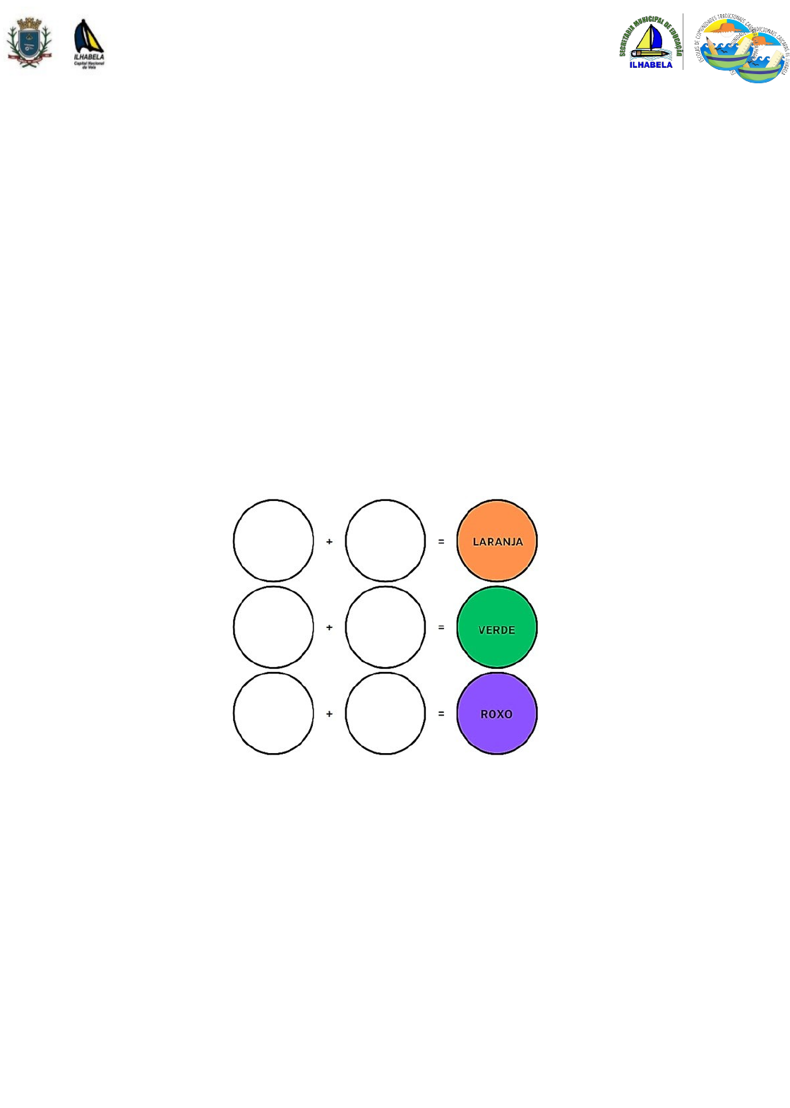 PREFEITURA MUNICIPAL DA ESTÃNCIA BALNEÁRIA DE ILHABELA SECRETARIA MUNICIPAL DE EDUCAÇÃO DE ILHABELA E. M. JORNALISTA NIVALDO SIMÕES Nome: ______________________ Série: _________ Data: ____/____/____ ARTES 1) Há algum tempo atrás, os livros, as revistas, os jornais, as fotografias, o cinema e a televisão eram em preto e branco. Hoje as cores fazem parte das nossas vidas, pois os meios de comunicação se utilizam delas para transmitir mensagens. Há três tipos, quais são: a) ( ) cores primárias, secundária e terciárias; b) ( ) cores primária, secundárias, terciárias e quaternárias; c) ( ) cores primária, terciárias e quaternária ; d) ( ) cores quente e frias 2) Pinte a imagem abaixo conforme a mistura das cores citadas no texto para formar novas cores. 3) Assinale a combinação correta da mistura de uma cor primaria com uma cor secundária: a) ( ) amarela + azul = vermelho; b) ( ) azul + verde = azul esverdeado; c) ( ) vermelho + laranja =amarelo alaranjado; d) ( ) vermelho + roxo = marrom. 4) Cores terciárias são resultado da mistura de uma cor primária com uma cor secundária. Marque a alternativa abaixo que corresponde a uma cor terciária a) amarelo esverdeado, b) amarelado; c) azulado; d) alaranjado. 5) Pinte a figura abaixo começando com as cores primárias, depois secundárias e finalize com as terciárias. Boa prova! Professora Tâmara Guimarães image1.png image2.png image3.jpeg image4.png image5.png