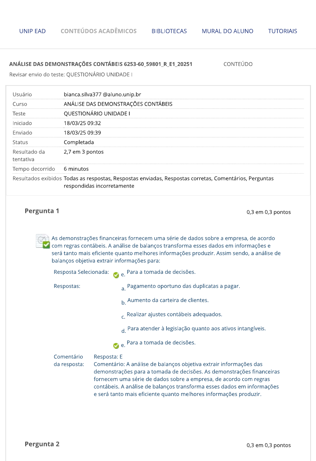 UNIP EAD CONTEÚDOS ACADÊMICOS BIBLIOTECAS MURAL DO ALUNO TUTORIAIS ANÁLISE DAS DEMONSTRAÇÕES CONTÁBEIS 6253-60_59801_R_E1_20251 CONTEÚDO Revisar envio do teste: QUESTIONÁRIO UNIDADE Usuário Curso ANÁLISE DAS DEMONSTRAÇÕES CONTÁBEIS Teste QUESTIONÁRIO UNIDADE Iniciado 18/03/25 09:32 Enviado 18/03/25 09:39 Status Completada Resultado da 2,7 em 3 pontos tentativa Tempo decorrido 6 minutos Resultados exibidos Todas as respostas, Respostas enviadas, Respostas corretas, Comentários, Perguntas respondidas incorretamente Pergunta 1 0,3 em 0,3 pontos As demonstrações financeiras fornecem uma série de dados sobre a empresa, de acordo com regras contábeis. A análise de balanços transforma esses dados em informações e será tanto mais eficiente quanto melhores informações produzir. Assim sendo, a análise de balanços objetiva extrair informações para: Resposta Selecionada: Para a tomada de decisões. e. Respostas: a. Pagamento oportuno das duplicatas a pagar. b. Aumento da carteira de clientes. C. Realizar ajustes contábeis adequados. d. Para atender à legislação quanto aos ativos intangíveis. Para a tomada de decisões. e. Comentário Resposta: E da resposta: Comentário: A análise de balanços objetiva extrair informações das demonstrações para a tomada de decisões. As demonstrações financeiras fornecem uma série de dados sobre a empresa, de acordo com regras contábeis. A análise de balanços transforma esses dados em informações e será tanto mais eficiente quanto melhores informações produzir. Pergunta 2 0,3 em 0,3 pontosA contabilidade financeira, e/ou de custos, também pode ser útil para liberação de crédito? Resposta Selecionada: Sim, as demonstrações contábeis podem ser usadas para esse objetivo. Respostas: a. Sim, além de servir também para remanufaturar máquinas industriais. b. Sim, mas somente quando o banco também for o investidor, para que não haja conflito de interesses. Não, a menos que a CVM autorize, o que é muito raro. C. d. Sim, as demonstrações contábeis podem ser usadas para esse objetivo. Jamais, a contabilidade é exclusiva para fins societários. e. Comentário da Resposta: D resposta: Comentário: Entre os vários objetivos, a liberação de crédito é uma das finalidades que pode ser atendida com o emprego das demonstrações Pergunta 3 0,3 em 0,3 pontos A mensagem, ou relatório aos acionistas, faz parte das demonstrações contábeis? Por quê? Resposta e. Selecionada: Sim, porque se entende que trazem informações relevantes aos usuários externos. Respostas: Não fazem parte porque são essencialmente opcionais. a. b. Não fazem parte conforme os regulamentos, mas são uma tradição desde o século XVIII. C. Não, porque apenas tabelas e informações quantitativas podem ser consideradas demonstrações contábeis oficiais. d. Sim, porque nesse relatório o principal executivo realiza uma análise de Upsalla. e. Sim, porque se entende que trazem informações relevantes aos usuários externos. Comentário da Resposta: E resposta: Comentário: Entende-se que as demonstrações contábeis são formadas de informações quantitativas e qualitativas e a mensagem, ou relatório,aos acionistas é extremamente relevante no conjunto das demonstrações contábeis. Pergunta 4 0,3 em 0,3 pontos É possível afirmar que a análise de balanços quantitativamente terá maior efetividade se realizada comparativamente, ou seja, fazendo-se a comparação de dois ou mais períodos (mais de um ano)? Resposta Selecionada: Sim, pois tal ação implica em um estudo que vislumbra o passado, o presente e pode ainda visualizar projeções futuras. Respostas: a. Sim, pois tal ação implica em um estudo que vislumbra o passado, o presente e pode ainda visualizar projeções futuras. b. Não, pois quanto maior a quantidade de informações, mais dificultosa fica a comparação. C. Sim, pois tal ação implica em um estudo que vislumbra o passado, para identificar o que realmente ocorreu. d. Não, pois o passado é um período em que nada pode ser modificado pela contabilidade. e. Sim, pois tal ação implica em um estudo que vislumbra nitidamente o que acontecerá no futuro. Comentário da Resposta: A resposta: Comentário: A ação comparativa na análise de balanços resulta em uma visualização assertiva pelas informações sobre o passado e o presente, podendo ainda possibilitar cálculos de projeção futura, em busca de decisões acertadas diante dos cenários existentes. Pergunta 5 0,3 em 0,3 pontos A característica do balanço patrimonial é ser uma demonstração: Resposta Selecionada: C. Estática. Respostas: a. Simplificada. Densa. b. C. Estática.d. Especulativa. Dinâmica. e. Comentário da Resposta: C resposta: Comentário: O balanço patrimonial é comparado por muitos teóricos a "uma foto", que demonstra a situação da empresa em um determinado momento. Pergunta 6 0 em 0,3 pontos relatório da administração deve evidenciar diversos aspectos relevantes pertinentes à empresa, com exceção de: Resposta d. De reinvestimento de lucros e outras informações relevantes. Selecionada: Respostas: a. Os negócios sociais e principais fatos administrativos ocorridos no exercício. b. Os investimentos em outras empresas. A política de distribuição de dividendos. C. d. De reinvestimento de lucros e outras informações relevantes. e. Ações realizadas pelos concorrentes. Pergunta 7 0,3 em 0,3 pontos As demonstrações contábeis são rigorosamente iguais? Resposta Em estrutura sim, mas em conteúdo pode variar. a. Selecionada: Respostas: Em estrutura sim, mas em conteúdo pode variar. a. b. Sim, em conteúdo e estrutura. Não, nem em conteúdo, nem em estrutura. C. d. Depende de interpretação. e. Depende do ramo de negócio da empresa, há, por exemplo, balanço especial para empresas do ramo hospitalar. Comentário Resposta: A da resposta: Comentário: As demonstrações contábeis devem atender às estruturas