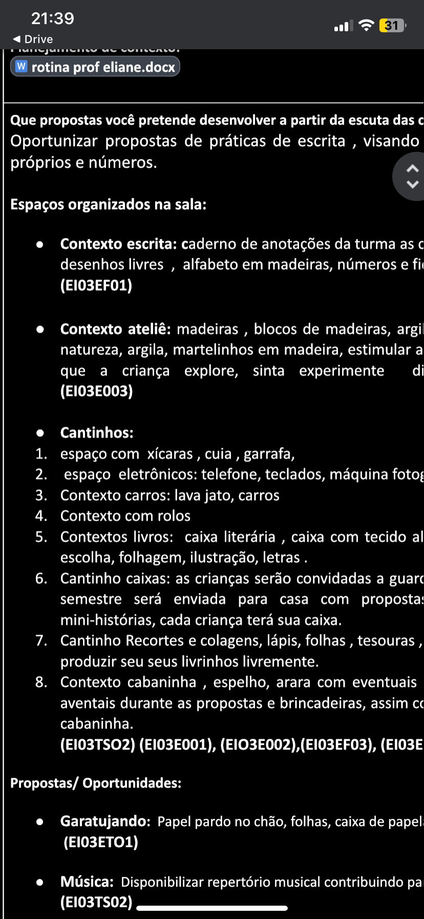 21:39 31 Drive W rotina prof eliane.docx Que propostas você pretende desenvolver a partir da escuta das Oportunizar propostas de práticas de escrita , visando próprios e números. Espaços organizados na sala: Contexto escrita: caderno de anotações da turma as C desenhos livres , alfabeto em madeiras, números e fi (EI03EF01) Contexto madeiras , blocos de madeiras, argil natureza, argila, martelinhos em madeira, estimular a que a criança explore, sinta experimente di (EI03E003) Cantinhos: 1. espaço com xícaras , cuia , garrafa, 2. espaço eletrônicos: telefone, teclados, máquina foto 3. Contexto carros: lava jato, carros 4. Contexto com rolos 5. Contextos livros: caixa literária , caixa com tecido al escolha, folhagem, ilustração, letras 6. Cantinho caixas: as crianças serão convidadas a guard semestre será enviada para casa com mini-histórias, cada criança terá sua caixa. 7. Cantinho Recortes e colagens, lápis, folhas , tesouras , produzir seu seus livrinhos livremente. 8. Contexto cabaninha , espelho, arara com eventuais aventais durante as propostas e brincadeiras, assim CC cabaninha. (EI03E001), (EI03E Propostas/ Oportunidades: Garatujando: Papel pardo no chão, folhas, caixa de Música: Disponibilizar repertório musical contribuindo pa (EI03TS02)