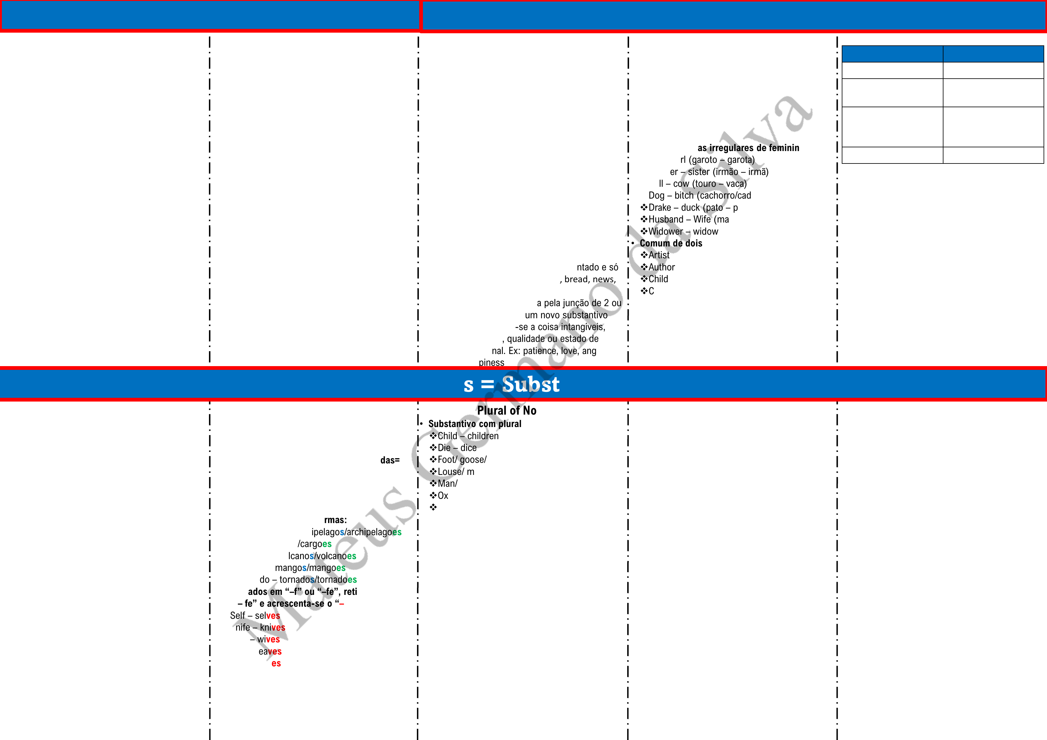 Indefinites: An/ A • Antes de algo que ainda não foi mencionado. Não usar antes de substantivos no plural e nem incontáveis • A: antes de substantivos cuja a grafia inicie por uma consoante ou por um som de consoante; Atenção: Palavra cuja vogal tem som de consoante: ❖“u” ou “eu” com som de “y”: university, unique, union, useful, unit. - “eu” tem sempre som de “y” ❖“o” com som de w: once, once • An: antes de substantivos cuja a grafia inicie por uma vogal ou por um som de vogal. Atenção: a letra “h” pode silenciosa: honor, hour, honest, heir • Em caso se Substantivos no Plural ❖Some: Antes de substantivos incontáveis ❖Many: Antes de substantivos contáveis Definite: The • Quando usar: ❖Antes de algo que já foi mencionado; ❖Substantivos que podem ser precedidos ou não por adjetivos; ❖Nomes de instrumentos musicais ou ritmos; ❖Nomes de famílias ou grupo de pessoas ; ❖Substantivo único na espécie; Definite: The • Quando usar: ❖Coisas ou pessoas específicas; ❖Nacionalidades; ❖Nomes geográficos de um rio, um mar, canais, polos, desertos, golfos, ilhas e montanhas ❖Números ordinais ❖Adjetivos usados como substantivos no plural • Quando não usar: Antes de ... ❖Generalizações ❖Nome próprio ou de pessoas (exceção: se já tiver o “the” em sua estrutura) ❖Nome de línguas ❖Nome de esportes ❖Nome de ciências/ disciplinas escolares ❖Substantivos comuns ou incontáveis ❖Nomes cidades, estados, países (exceto nome composto) ou continentes ❖Dias da semana ou meses ❖Expressões de tempo como Last(passado) e Next(próximo). ❖Substantivos no plural e em sentido genérico ❖Cargos Acompanhados dos nomes ❖pronomes possessivos e etc... • Pode ser ocultado quando for sucedido por um substantivo incontável ou abstrato Gender • Acrescenta-se o sufixo –ess para formar o feminino de alguns substantivos: ❖Actor – Actress ❖Duke – duchess ❖God – goddess ❖Lion – lioness ❖Prince – princess ❖Poet – poetess • Possuem formas irregulares de feminino ❖Boy – girl (garoto – garota) ❖Brother – sister (irmão – irmã) ❖Bull – cow (touro – vaca) ❖Dog – bitch (cachorro/cadela) ❖Drake – duck (pato – pata) ❖Husband – Wife (marido – esposa) ❖Widower – widow ( viúvo – viúva) • Comum de dois gêneros: ❖Artist ❖Author ❖Child ❖Cousin ❖Doctor ❖Friend ❖Neighbor ❖Scientist ❖Student ❖Teacher Types • Proper Noun: refere-se a uma pessoa, lugar ou coisa em específico. Geralmente, vem com a primeira letra em maiúsculo. • Commom Noun: refere-se a uma generalização. Ex: teacher, dog, house, car e book • Concrete Noun: refere-se a algo que pode ser percebido através dos sentidos. Ex: desk, pencil, book, student • Appositive Noun: renomear ou identifica outro substantitvo. • Collective Noun: representa um grupo de pessoas, animais ou coisas. Ex: A group/ crowd (of people), A board (of directors), A bunch (of flowers, bananas), A shoal (of fish), A flock ( of birds, sheep) • Countable Noun: pode ser contado e possui forma no singular e no plural. Ex: people, teacher, pen, bag • Uncountable Noun: não poder ser contado e só possui singular. Ex: coffe, tea, air, bread, news, music • Compound Noun: é formada pela junção de 2 ou mais palavras para criar um novo substantivo • Abstract Noun: refere-se a coisa intangíveis, como um conceito, qualidade ou estado de espirito/ emocional. Ex: patience, love, anger, wisdom, happiness Countable × Uncountable • Líquido, grãos e pó são incontáveis, pode ser contabilizado pela medida, mas, não a quantidade em números; • Tudo que é conjunto é incontável; • “Hair” é uma exceção, quando falamos em conjunto ele é incontável, se for falar de fios de cabelo ele se torna contável; • “Money” é incontável porque não se quantifica a quantidade de cédulas ou moedas, mas, sim o valor • “Music” é incontável, faixas de musica “song” são contáveis • tudo que é material (papel, madeira, vidro, ferro e aço) é incontável • “time” é incontável como tempo, se tiver no sentido de frequência (vezes) ele se torna contável Articles = Artigos Plural of Nouns I • Regra geral: acrescenta-se “–s” ❖Girls ❖Windows ❖Chairs • É necessário acrescentar “–es” quando o substantivo terminar com o som de S, Z, SH, CH e X: ❖Bus – buses ❖Quis – quizzes ❖Box – boxes ❖Brush – brushes ❖Church – churches ❖Exceções: pois terminam com som de “K” - Monarch – monarchs - Stomach – stomachs - Epoch – epochs • Quando o substantivo termina em Y ❖Vogal + Y = acresenta-se “–s” - Play – plays - Day – days ❖Consoante + Y = retira o Y e coloca o “– ies” - Lady – ladies - Family – families • Quando o substantivo termina em O ❖Vogal + O = acrescenta-se “–s” - Radio – rádios - Studio – studios Plural of Nouns II ❖Consoante + O = acrescenta-se “– es” - Echo – echoes - Hero – Heroes ❖Consoante + O que são formas reduzidas= acrescenta-se “–s” - Disco – discos - Memo – memos - Photo – photos ❖Que aceitam as duas formas: - Archipelago – archipelagos/archipelagoes - Cargo – cargos/cargoes - Volcano – volcanos/volcanoes - Mango – mangos/mangoes - Tornado – tornados/tornadoes • Terminados em “–f” ou “–fe”, retira-se o “–f” ou “– fe” e acrescenta-se o “–ves” ❖Self – selves ❖Knife – knives ❖Wife – wives ❖Leaf – leaves ❖Half – halves ❖Calf – calves ❖Life – lives ❖Loaf – loaves ❖Shelf – shelves ❖Thief – thieves ❖Wolf – wolves Quantificadores Para Countable Nouns • Substantivo no plural após o quantificador • Many = muito(s), muita(s) ❖Em frases afirmativas, aparece no começo • Few = poucos ou poucas. Ideia de insuficiência/ poderia ser mais = sentido negativo