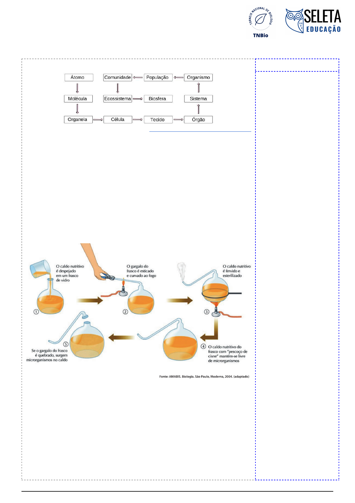 TNBio 2023 Nível: 8º e 9º anos 01. A imagem a seguir representa os níveis de organização dos seres vivos. (Disponível em https://brasilescola.uol.com.br/biologia/niveis-organizacao-biologia.htm) De acordo com a imagem acima e seus conhecimentos sobre os níveis de organização dos seres vivos, assinale a alternativa correta: a) Um neurônio é um exemplo de organela responsável pela condução de impulsos nervosos em nosso organismo. b) O sangue é um tipo especial de tecido conjuntivo responsável por conduzir nutrientes, transportar gases e outras substâncias. c) A água é considerada um dos átomos mais importantes responsável por dissolver substâncias e regular a temperatura do nosso corpo. d) Um gato, um cachorro e o ser humano constituem um exemplo de população, pois são seres da mesma espécie em uma determinada área. e) O pâncreas é um exemplo de órgão, pois é formado por vários sistemas que desempenham a mesma função em nosso organismo. 02. Em 1862, o cientista francês Louis Pasteur realizou um experimento conforme apresentado na imagem a seguir: A respeito do experimento realizado por Pasteur, assinale a alternativa correta: a) O experimento de Pasteur não teve força contra as ideias propostas por John Needhan, que na época defendia que os seres vivos originavam-se de outro ser vivo. b) Opondo-se à teoria defendida por Francesco Redi, Pasteur comprovou em seu experimento que os microorganismos originavam-se do ar em contato com o caldo nutritivo. c) Aristóteles e Pasteur eram defensores da mesma teoria sobre a origem dos seres vivos, por isso, Pasteur realizou um experimento comprovando a teoria da geração espontânea. d) Em seu experimento, Pasteur refuta a abiogênese comprovando que os microorganismos não se originavam do caldo nutritivo, fortalecendo a teoria da biogênese. e) O experimento de Pasteur foi realizado antes do experimento de Francesco Redi, comprovando que a força vital era necessária para originar todos os seres vivos. Anotações e Comentários 1 https://brasilescola.uol.com.br/biologia/niveis-organizacao-biologia.htm TNBio 2023 Nível: 8º e 9º anos 03. O perigoso método usado por lutadores de MMA para perder 7 kg em um dia Deitado sobre uma toalha no chão, ao lado de uma balança, o lutador inglês Dean Garnett agoniza. Pálido e encharcado de suor, está em um processo radical de desidratação. "É provavelmente a coisa mais perigosa que faço em todo o ano", afirma. Ele se refere ao método que lutadores de MMA usam para perder cerca de 7 kg em menos de um dia. O sacrifício ao qual Garnett se submete é conhecido como corte de peso e virou rotina para atletas que querem competir em categorias que exigem peso mais leve que o deles. E o processo é perigoso, uma vez que prevê uma perda acelerada de peso por desidratação extrema. (Disponível em: https://www.bbc.com/portuguese/internacional-39280340) A reportagem acima relata sobre os perigos do organismo humano quando se encontra em estado de desidratação severa. Assim, entendemos que a água desempenha papéis fundamentais para o bom desenvolvimento do nosso organismo e de todos os seres vivos. Relacionando a reportagem acima com a importância da água para fisiologia humana, assinale a alternativa correta: a) Os riscos de uma desidratação severa limitam-se a prejuízos relacionados à propriedade de coesão da água, impossibilitando o organismo de dissolver nutrientes importantes no interior da célula. b) A desidratação extrema é perigosa ao nosso organismo, já que ao perder água o nosso organismo também perde monossacarídeos por meio do suor o que prejudica a regulação da homeostase. c) As propriedades de coesão e capilaridade são prejudicadas pela baixa taxa de ebulição da água em condições de desidratação severa do corpo, impossibilitando que os nutrientes sejam transportados pelo sangue. d) Como a água apresenta um baixo calor específico, essa propriedade garante que o nosso organismo não realize algumas reações químicas em condições de desidratação extrema, aumentando a temperatura interna do corpo. e) A água desempenha papel fundamental em nosso corpo, não só por dissolver substâncias e transportar nutrientes, bem como regula a temperatura do nosso corpo e mantém a homeostase, já que, em desidratação, o corpo perde água e sais minerais. 04. Além de fundamental para diversas funções em nosso organismo, a água é indispensável para a manutenção dos seres vivos. A água, porém, apresenta-se em quantidades diferentes a depender do organismo, conforme apresentado na tabela a seguir. Quantidade de água em relação à massa total Ser vivo % de água pepino 96 tomate 94 melancia 92 ovo 74 milho 70 galinha 65 cevada (grão) 10 amendoim 5 (Disponível em https://planetabiologia.com/a-importancia-da-agua-para-os-seres-vivos/) A partir da análise da tabela, podemos inferir que 2 https://planetabiologia.com/a-importancia-da-agua-para-os-seres-vivos/ TNBio 2023 Nível: 8º e 9º anos a) O menor percentual de água encontrado no amendoim é justificado por ele ser uma parte da planta, a raiz, com baixa capacidade de retenção de água. b) Dentre os frutos citados, melancia, tomate e pepino, a melancia é o fruto que apresenta o maior percentual de água em relação à sua massa total. c) Conforme a tabela, comparando o grão de milho e o grão de cevada, o milho apresenta maior percentual de água em seu interior. d) O percentual de água nos animais é maior que nos vegetais, conforme descrito nos exemplos da tabela, fato justificado pela maior complexidade dos animais. e) Conforme demonstrado na tabela, a quantidade no interior dos seres vivos varia conforme a idade, quanto mais jovem, menor é a quantidade de água no interior do ser vivo. 05. Assim como as vitaminas, os sais minerais são nutrientes que apresentam diversas funções em nosso organismo. Sobre as funções desempenhadas pelos sais minerais no se