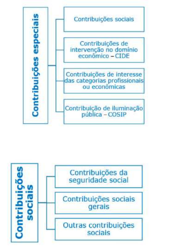 CONTRIBUIÇÕES ESPECIAIS 1) Contribuições Especiais As contribuições especiais representam um tributo de arrecadação vinculada, pois a destinação do seu recurso é elemento essencial para caracterizá-lo como espécie tributária e para diferenciá-las dos demais tipos de tributo. Esta espécie de tributo está prevista nos art. 149 e 149-A da CF/88 e é subdividida em grupos: a) Contribuições Sociais Contribuições da Seguridade Social Com o intuito de conceituar a seguridade social, o legislador constituinte, por intermédio do art. 194 da CF/88, destaca que ela “compreende um conjunto integrado de ações de iniciativa dos Poderes Públicos e da sociedade, destinadas a assegurar os direitos relativos à saúde, à previdência e à assistência social”. Nesse sentido, a receita arrecada a título de contribuições para a seguridade social são vinculadas a gastos do Poder Público com saúde, previdência e assistência social. Para o financiamento da seguridade social, o art. 195 da CF/88 prevê que são utilizados recursos provenientes dos entes políticos (financiamento indireto) e das contribuições sociais cobradas (financiamento direto) conforme tabela seguinte: • Do empregador, da empresa e da entidade a ela equiparada na forma da lei, que incidem sobre: − a folha de salários e demais rendimentos do trabalho pagos ou creditados, a qualquer título, à pessoa física que lhe preste serviço, mesmo sem vínculo empregatício; − a receita ou o faturamento; − o lucro; • Do trabalhador e dos demais segurados da previdência social; • Sobre a receita de concursos de prognósticos; • Do importador de bens ou serviços do exterior, ou de quem a lei a ele equiparar. Regimes Previdenciários e Contribuições Previdenciárias A seguridade social é composta pela saúde, pela assistência social e pela previdência social. No que se refere ao último grupo apresentado, ele é composto por dois regimes: o Regime Geral de Previdência Social – RGPS e o Regime Próprio de Previdência Social – RPPS. O RGPS refere-se ao regime aplicável à iniciativa privada, enquanto o RPPS refere-se a regime aplicável ao serviço público. Para custeio desses regimes são cobradas contribuições da seguridade social, também conhecidas como contribuições previdenciárias. No que se refere ao RGPS, ele é financiado por contribuições previdenciárias federais, enquanto o RPPS é financiado por contribuição previdenciária federal, estadual, municipal ou distrital: depende do ente que o servidor faz parte. Contribuições Sociais Gerais As contribuições sociais gerais são instituídas para financiamento de área social distinta daquela compreendida como seguridade social e podem ser criadas por lei ordinária. Ex. (SESC), do Serviço Social da Indústria (SESI) ou do Serviço Nacional de Aprendizagem Comercial (SENAC). Esses são exemplos de empresas privadas que prestam os conhecidos serviços sociais autônomos e fazem parte do “Sistema S”, conforme art. 240 da CF/88: Contribuições de Intervenção no Domínio Econômico – CIDE A CIDE, tributo de competência exclusiva da União, assim como as outras contribuições especiais, tem a sua natureza jurídica tributária determinada por meio da destinação legal da sua receita, sendo, por isso, um tributo de arrecadação vinculada. A CIDE é um tributo marcadamente extrafiscal, pois, como o seu próprio nome diz, ela é instituída pela União com o intuito de intervir no “domínio econômico”. Por intermédio da instituição de tributo com finalidade extrafiscal o Poder Público visa estimular ou desestimular determinadas atitudes dos contribuintes que impactam social ou economicamente. No caso da CIDE, ela é uma contribuição que é arrecadada e destinada para incentivo a determinado setor da economia. Ex. CIDE combustível; Adicional de Tarifa Portuária; Adicional de Frete para Renovação da Marinha Mercante (AFRMM); • Contribuição ao INCRA Contribuição de Iluminação Pública – COSIP A COSIP foi inserida em nosso ordenamento jurídico em 2002, por intermédio da Emenda Constitucional de n. 39 que acrescentou o art. 149-A à Constituição Federal de 1988: Art. 149-A Os Municípios e o Distrito Federal poderão instituir contribuição, na forma das respectivas leis, para o custeio do serviço de iluminação pública, observado o disposto no art. 150, I e III. (Incluído pela Emenda Constitucional n. 39, de 2002) Parágrafo único. É facultada a cobrança da contribuição a que se refere o caput, na fatura de consumo de energia elétrica. (Incluído pela Emenda Constitucional n. 39, de 2002) Antes da sua previsão, o serviço de iluminação era remunerado mediante instituição de taxa. Quem tem competência para as instituir são os municípios e o DF. Contribuições Corporativas As contribuições de interesse das categorias profissionais ou econômicas, também chamadas de contribuições profissionais ou corporativas, são de competência privativa da União e estão previstas no art. 149, CF. Tendo em vista a sua característica de tributo de arrecadação vinculada, o produto da sua arrecadação deve ser destinado a beneficiar determinada categoria. Exemplos clássicos de contribuição corporativa são as anuidades cobradas pelos Conselhos de Fiscalização Profissionais, como o Conselho Regional de Medicina (CRM), Conselho Regional de Engenharia e Agronomia (CREA), Conselho Regional de Medicina Veterinária (CRMV. Outras Contribuições Sociais de Seguridade Social O legislador constituinte faculta à União a instituição de outras contribuições da seguridade social, distintas das já expressamente previstas na Constituição, conforme art. 195, par. 4º: Art. 195, § 4º A lei poderá instituir outras fontes destinadas a garantir a manutenção ou expansão da seguridade social, obedecido o disposto no art. 154, I. Como se vê da parte final do dispositivo, esse a