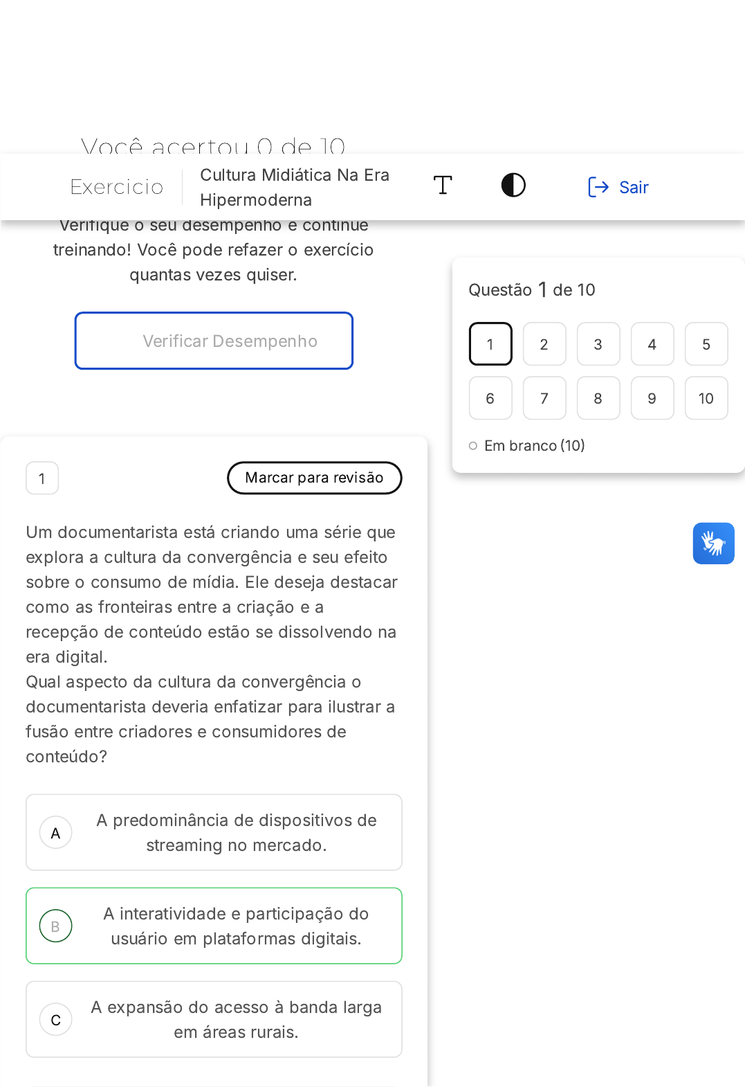 14/09/2024 08:17 https://estacio.saladeavaliacoes.com.br/exercicio/66e570de6bf5bf269bbb5e53/gabarito/ https://estacio.saladeavaliacoes.com.br/exercicio/66e570de6bf5bf269bbb5e53/gabarito/ 1/15 Você acertou 0 de 10 questões Verifique o seu desempenho e continue treinando! Você pode refazer o exercício quantas vezes quiser. Verificar Desempenho A B C 1 Marcar para revisão Um documentarista está criando uma série que explora a cultura da convergência e seu efeito sobre o consumo de mídia. Ele deseja destacar como as fronteiras entre a criação e a recepção de conteúdo estão se dissolvendo na era digital. Qual aspecto da cultura da convergência o documentarista deveria enfatizar para ilustrar a fusão entre criadores e consumidores de conteúdo? A predominância de dispositivos de streaming no mercado. A interatividade e participação do usuário em plataformas digitais. A expansão do acesso à banda larga em áreas rurais. Questão 1 de 10 Em branco �10� 1 2 3 4 5 6 7 8 9 10 Exercicio Cultura Midiática Na Era Hipermoderna Sair 14/09/2024 08:17 https://estacio.saladeavaliacoes.com.br/exercicio/66e570de6bf5bf269bbb5e53/gabarito/ https://estacio.saladeavaliacoes.com.br/exercicio/66e570de6bf5bf269bbb5e53/gabarito/ 2/15 D E A influência das redes sociais no jornalismo tradicional. A transição do cinema para formatos digitais de distribuição. Questão não respondida Opa! A alternativa correta é a letra B. Confira o gabarito comentado! Gabarito Comentado O documentarista deveria enfatizar a interatividade e a participação do usuário em plataformas digitais. Esse aspecto demonstra como os consumidores estão cada vez mais envolvidos na criação de conteúdo, um fenômeno central na cultura da convergência, conforme discutido por Henry Jenkins. A participação ativa do público nos processos de mídia reflete a erosão das barreiras tradicionais entre produtores e consumidores. As outras alternativas não abordam diretamente essa interação criativa que define a cultura da convergência. 2 Marcar para revisão As novas tecnologias permitiram o estabelecimento de uma comunicação em rede e a emergência do ciberespaço. Nesse novo ambiente, surge a cibercultura, definida por Pierre Lévy como: 14/09/2024 08:17 https://estacio.saladeavaliacoes.com.br/exercicio/66e570de6bf5bf269bbb5e53/gabarito/ https://estacio.saladeavaliacoes.com.br/exercicio/66e570de6bf5bf269bbb5e53/gabarito/ 3/15 A B C D E Espaço digital de alta conectividade para onde concorrem sujeitos simbólicos e suas manifestações culturais. Conjunto de redes digitais (computadores e HDTV) que pela interação entre os indivíduos desenvolve valores e novas potencialidades da inteligência coletiva. Conjunto de técnicas (materiais e intelectuais), de práticas, de atitudes, de modos de pensamento e de valores que se desenvolve juntamente com o crescimento do ciberespaço. Conjunto de pensamentos e produtos intelectuais (blogs e e-books) que se caracteriza pela preponderância do imaginário frente às referencialidades reais. Manifestações socioeconômicas proporcionadas pela comunicação via internet e guiadas pelos princípios da globalização. Questão não respondida Opa! A alternativa correta é a letra C. Confira o gabarito comentado! Gabarito Comentado Pierre Lévy define a cibercultura como um conjunto de técnicas (materiais e intelectuais), de práticas, de atitudes, de 14/09/2024 08:17 https://estacio.saladeavaliacoes.com.br/exercicio/66e570de6bf5bf269bbb5e53/gabarito/ https://estacio.saladeavaliacoes.com.br/exercicio/66e570de6bf5bf269bbb5e53/gabarito/ 4/15 A B C D E modos de pensamento e de valores que se desenvolvem juntamente com o crescimento do ciberespaço. Esta definição engloba não apenas a tecnologia em si, mas também as mudanças comportamentais e culturais que ocorrem em paralelo ao avanço tecnológico. Portanto, a alternativa correta é a letra C. 3 Marcar para revisão A era hipermoderna sublinha a saturação de estímulos e a superabundância de ofertas culturais. Neste contexto, o indivíduo enfrenta o desafio de escolher em um mar de opções, onde a capacidade de seleção se torna uma habilidade crucial. Qual fenômeno da hipermodernidade reflete a sobrecarga de escolhas que os indivíduos experimentam diariamente? Escassez de informação. Paralisia decisória. Simplificação das opções. Uniformidade de preferências. Desinteresse cultural. Questão não respondida 14/09/2024 08:17 https://estacio.saladeavaliacoes.com.br/exercicio/66e570de6bf5bf269bbb5e53/gabarito/ https://estacio.saladeavaliacoes.com.br/exercicio/66e570de6bf5bf269bbb5e53/gabarito/ 5/15 A B Opa! A alternativa correta é a letra B. Confira o gabarito comentado! Gabarito Comentado A paralisia decisória é um fenômeno da hipermodernidade que reflete a dificuldade dos indivíduos em fazer escolhas diante de uma superabundância de opções. Este conceito captura a ansiedade e a indecisão que podem surgir quando se é confrontado com muitas possibilidades, o que pode levar a uma paralisação no processo de tomada de decisão. As outras alternativas desviam-se dessa noção, sugerindo uma realidade simplificada ou uma reação diferente à multiplicidade de escolhas. 4 Marcar para revisão O estudo das mídias digitais, conforme abordado por Pierre Lévy, ressalta a necessidade de compreender a cibercultura dentro das transformações sociais contemporâneas. Sua pesquisa ilumina como as redes computacionais remodelam interações humanas, destacando um novo paradigma cultural. Qual foi a contribuição significativa de Pierre Lévy para o campo da cibercultura? Desenvolvimento de algoritmos de criptografia para redes sociais. Teorização sobre a inteligência coletiva na era digital. 14/09/2024 08:17 https://estacio.saladeavaliacoes.com.br/exercicio/66e570de6bf5bf269bbb5e53/gabarito/ https://estacio.saladeavaliacoes.com.br/exercicio/66e570de6bf5bf269bbb5e53/gabarito/ 6/15 C D E Criação de pla