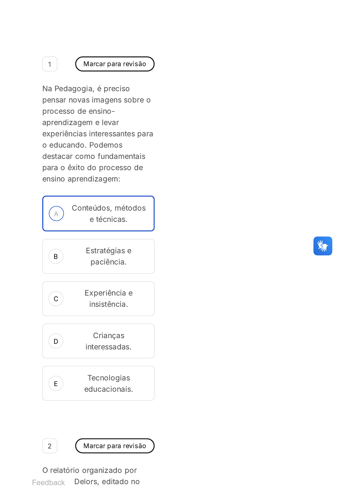 17/09/2024 14:54 https://estacio.saladeavaliacoes.com.br/prova/66e9b8ed61b8959658aa38a3/ https://estacio.saladeavaliacoes.com.br/prova/66e9b8ed61b8959658aa38a3/ 1/15 A B C D E 1 Marcar para revisão Na Pedagogia, é preciso pensar novas imagens sobre o processo de ensino- aprendizagem e levar experiências interessantes para o educando. Podemos destacar como fundamentais para o êxito do processo de ensino aprendizagem: Conteúdos, métodos e técnicas. Estratégias e paciência. Experiência e insistência. Crianças interessadas. Tecnologias educacionais. 2 Marcar para revisão O relatório organizado por Jacques Delors, editado noFeedback 17/09/2024 14:54 https://estacio.saladeavaliacoes.com.br/prova/66e9b8ed61b8959658aa38a3/ https://estacio.saladeavaliacoes.com.br/prova/66e9b8ed61b8959658aa38a3/ 2/15 A B C D E Brasil como livro intitulado Educação: um tesouro a descobrir �1998�, caracteriza a proposta para UNESCO e os projetos educacionais que deveriam servir de base para uma Educação para o século XXI. Apesar de uma obra complexa, um aspecto - denominado Os Pilares da Educação - ficou fortemente conhecido, talvez porque represente os anseios de uma educação contemporânea. Assinale a alternativa que apresenta estes Pilares: Aprender a Conhecer, Aprender a Fazer. Aprender a Conhecer, Aprender a Fazer, Aprender a Conviver, Aprender a Ser. Aprender a Fazer, Aprender a Conviver. Aprender a Fazer, Aprender a Conviver, Aprender a Ser. Aprender a Conviver, Aprender a Ser, Aprender a Fazer. 17/09/2024 14:54 https://estacio.saladeavaliacoes.com.br/prova/66e9b8ed61b8959658aa38a3/ https://estacio.saladeavaliacoes.com.br/prova/66e9b8ed61b8959658aa38a3/ 3/15 3 Marcar para revisão "Blog é sinônimo de conteúdo. Se o seu projeto pessoal ou mesmo sua empresa contar com um portal como esse, também terá diversos benefícios agregados à sua marca" �Fabio Ricotta, em AGÊNCIA MESTRE, 20/12/2019�. A primeira afirmativa da citação é fundamental para entendermos porque, cada vez mais, professores - das diversas modalidades, áreas e níveis de ensino - estão optando pelo blog como um recurso de criação de conteúdo digital para seus alunos. Porém, para que haja condições de sucesso na utilização desse recurso, é importante que o profissional de educação assuma algumas precauções básicas. Sobre essas precauções, assinale a afirmativa que não corresponde ao coreto uso do blog: 17/09/2024 14:54 https://estacio.saladeavaliacoes.com.br/prova/66e9b8ed61b8959658aa38a3/ https://estacio.saladeavaliacoes.com.br/prova/66e9b8ed61b8959658aa38a3/ 4/15 A B C Necessidade de investir em plataformas pagas, já que ainda não é possível conseguir plataformas gratuitas que tenham estabilidade digital. É fundamental planejamento desta ação: definição de público-alvo, conteúdo abordado, estrutura etc. A identidade visual é um fator importante para que haja harmonia da apresentação do conteúdo, apresentando layout agradável ao aprendizado. 17/09/2024 14:54 https://estacio.saladeavaliacoes.com.br/prova/66e9b8ed61b8959658aa38a3/ https://estacio.saladeavaliacoes.com.br/prova/66e9b8ed61b8959658aa38a3/ 5/15 D E Conteúdos digitais necessitam de espaço de interação: troca de experiências, dúvidas, proposta de ideias. Integrar-se às redes sociais é bom caminho. A multiplicidade de mídias utilizadas - vídeos, podcasts, aplicativos... - permitirá atingir público ainda maior, valorizando suas especificidades. 4 Marcar para revisão Didática também pode ser entendida tanto como ciência quanto como arte do ensino. É um ato pedagógico essencial para a docência em todos os níveis educacionais. Ela é de maneira geral, um conjunto de conteúdos, métodos e técnicas para a instrução do ensino. Esse conjunto é fundamentalmente alinhado a aplicação do(a): 17/09/2024 14:54 https://estacio.saladeavaliacoes.com.br/prova/66e9b8ed61b8959658aa38a3/ https://estacio.saladeavaliacoes.com.br/prova/66e9b8ed61b8959658aa38a3/ 6/15 A B C D E Formação de professores. Pedagogia. Processo de ensino aprendizagem. Planejamneto e treinamento. Planejamento e reflexão. 5 Marcar para revisão Uma determinada Escola de Ensino Médio tem como objetivo explícito, e bem definido em seu Projeto Pedagógico, a preparação dos alunos para concorrer a cargos eletivos das Forças Armadas. Levemos em conta que o concurso tem edital com conteúdo bem definido, especialmente na área de ciências exatas. Assim, para cumprir seu papel, esta Escola deve optar por uma ênfase na Tendência Pedagógica: 00 hora : 09 min : 37 seg Ocultar Prova AV Didatica 17/09/2024 14:54 https://estacio.saladeavaliacoes.com.br/prova/66e9b8ed61b8959658aa38a3/ https://estacio.saladeavaliacoes.com.br/prova/66e9b8ed61b8959658aa38a3/ 7/15 A B C D E Liberal Renovadora Liberal Tradicional Liberal Libertadora Progressista Libertária Progressista Crítico- social 6 Marcar para revisão Observe a situação hipotética abaixo: Quando a professora chegou em sala percebeu que, pela terceira vez naquela semana, os alunos tinham pegado as tintas que ela havia separado para a aula de Educação Artística e misturado todas elas! Apesar de permitir com frequência que as crianças tivessem autonomia para utilizar os materiais disponíveis em sala, naquela situação específica precisava das tintas - devidamente dispostas em seus potes - para uma atividade também específica. Decidiu, então, que seria necessário que os novos potes de tinta não estivessem mais em sala de aula; e sim Questão 10 de 10 Respondidas �10� Em branco �0� Finalizar prova 1 2 3 4 5 6 7 8 9 10 17/09/2024 14:54 https://estacio.saladeavaliacoes.com.br/prova/66e9b8ed61b8959658aa38a3/ https://estacio.saladeavaliacoes.com.br/prova/66e9b8ed61b8959658aa38a3/ 8/15 A B C D E sob sua guarda. Conseguiu, enfim, realizar sua atividade, após optar por aquele reforço negativo: retirar as tintas do alcance das crianças a fim de que elas não as utilizassem an