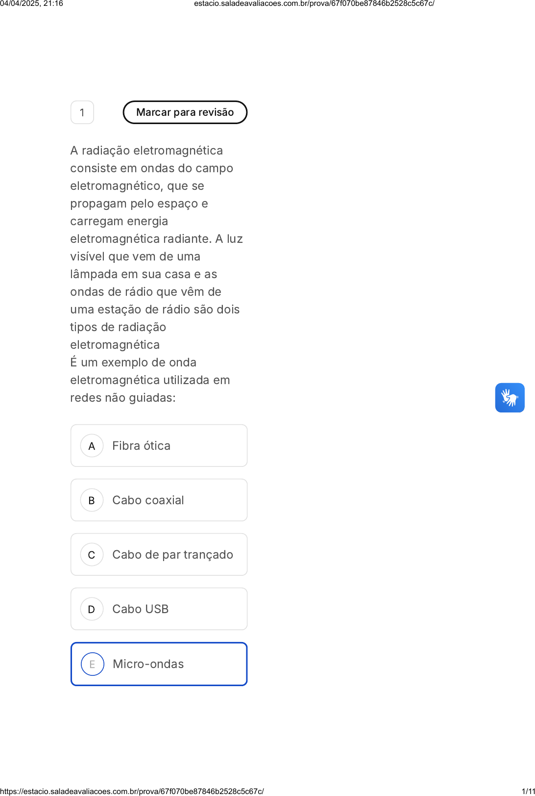 A B C D E 1 Marcar para revisão A radiação eletromagnética consiste em ondas do campo eletromagnético, que se propagam pelo espaço e carregam energia eletromagnética radiante. A luz visível que vem de uma lâmpada em sua casa e as ondas de rádio que vêm de uma estação de rádio são dois tipos de radiação eletromagnética É um exemplo de onda eletromagnética utilizada em redes não guiadas: Fibra ótica Cabo coaxial Cabo de par trançado Cabo USB Micro-ondas 04/04/2025, 21:16 estacio.saladeavaliacoes.com.br/prova/67f070be87846b2528c5c67c/ https://estacio.saladeavaliacoes.com.br/prova/67f070be87846b2528c5c67c/ 1/11 A B C D E 2 Marcar para revisão Um sistema de comunicação é um conjunto de entidades (ou partes) coordenadas, que concorrem para a realização de um determinado objetivo - que, usualmente, dá nome ao sistema. Qual é o termo relacionado à definição: "Conjunto de módulos processadores interligados por um sistema de comunicação capazes de trocar informações e compartilhar recursos"? Unidade de processamento Redes de Computadores Fluxo de Dados Redes Isoladas Elementos desconexos 3 Marcar para revisão Todas as atividades na Internet que envolvem duas ou mais 04/04/2025, 21:16 estacio.saladeavaliacoes.com.br/prova/67f070be87846b2528c5c67c/ https://estacio.saladeavaliacoes.com.br/prova/67f070be87846b2528c5c67c/ 2/11 A B C D E entidades remotas que se comunicam são governadas por um elemento que define o formato e a ordem das mensagens trocadas entre duas ou mais entidades comunicantes, bem como as ações realizadas na transmissão e/ou no recebimento de uma mensagem ou outro evento. O nome desse elemento é: Encapsulamento Interface Serviço Protocolo Link 4 Marcar para revisão O modelo em camadas de redes é um framework conceitual usado para entender e projetar a infraestrutura de comunicação em redes de computadores. A ideia principal por trás desse modelo é dividir o processo de comunicação em 04/04/2025, 21:16 estacio.saladeavaliacoes.com.br/prova/67f070be87846b2528c5c67c/ https://estacio.saladeavaliacoes.com.br/prova/67f070be87846b2528c5c67c/ 3/11 A B C D E diferentes camadas, cada uma responsável por realizar uma função específica. No modelo em camadas de uma arquitetura de rede, como é definida a relação entre camadas adjacentes? Camadas adjacentes não interagem entre si. Cada camada é independente e opera sem influência das outras. A camada superior oferece serviços para a camada imediatamente superior. A camada inferior fornece serviços para a camada imediatamente superior. Todas as camadas se comunicam diretamente entre si. 5 Marcar para revisão 04/04/2025, 21:16 estacio.saladeavaliacoes.com.br/prova/67f070be87846b2528c5c67c/ https://estacio.saladeavaliacoes.com.br/prova/67f070be87846b2528c5c67c/ 4/11 A B C D E As redes de computadores são estruturadas utilizando o conceito de camadas, com o objetivo de facilitar a manutenção e evolução dos serviços de redes. Acerca do conceito de camadas de rede, podemos dizer que: Uma camada utiliza o serviço da camada inferior e oferece para a camada superior. Permitiu a diminuição no volume de dados a ser transmitido pelo meio de comunicação. Uma camada utiliza o serviço da camada superior e oferece para a camada inferior. Tornou o problema de transmissão de dados mais complexo do que se fosse desenvolvido em uma camada única. Todas as alternativas estão incorretas. 04/04/2025, 21:16 estacio.saladeavaliacoes.com.br/prova/67f070be87846b2528c5c67c/ https://estacio.saladeavaliacoes.com.br/prova/67f070be87846b2528c5c67c/ 5/11 A B C D E 6 Marcar para revisão (UFMG/2021 - Adaptada) A camada de aplicação é a camada mais alta do modelo de referência TCP/IP e é responsável por fornecer serviços para os aplicativos que rodam em dispositivos conectados à rede. Ela permite que diferentes aplicativos se comuniquem de forma eficiente e padronizada, independentemente do sistema operacional, plataforma ou hardware utilizados. Dentro desse contexto, qual é o protocolo que faz o mapeamento de endereço URL para endereço IP? ARP. DNS. IP. Stringle. RIP. 7 Marcar para revisão 00 hora : 26 min : 04 seg Ocultar Questão 10 de 10 Respondidas (10) Em branco (0) Finalizar prova 1 2 3 4 5 6 7 8 9 10 SM1 Comunicações De Dados e Redes De… 04/04/2025, 21:16 estacio.saladeavaliacoes.com.br/prova/67f070be87846b2528c5c67c/ https://estacio.saladeavaliacoes.com.br/prova/67f070be87846b2528c5c67c/ 6/11 A B C D E (UFRJ/2021) Marque a alternativa que apresenta uma função dos números de porta incluídos nos segmentos TCP e UDP. Identificar o default gateway. Permitir que o host ordene os pacotes corretamente. Identificar aplicações em um mesmo host permitindo que os dados sejam encaminhados à aplicação correta. Realizar o controle de fluxo. Identificar se o protocolo da camada de transporte é TCP ou UDP. 8 Marcar para revisão (TRE-PI/2016 - Adaptada) A camada de aplicação é a camada mais alta e fornece serviços para os aplicativos que rodam em dispositivos conectados à rede. Ela inclui 04/04/2025, 21:16 estacio.saladeavaliacoes.com.br/prova/67f070be87846b2528c5c67c/ https://estacio.saladeavaliacoes.com.br/prova/67f070be87846b2528c5c67c/ 7/11 A B C D E protocolos como HTTP, FTP, SMTP e DNS, entre outros. O serviço de multiplexação provido pela camada de transporte da Internet é responsável por Evitar que o hospedeiro transmita em taxa superior à capacidade do receptor. Garantir a escalabilidade das aplicações na arquitetura par-a-par. Fornecer mecanismo de detecção e correção de erros na transmissão. Receber os dados dos processos aplicativos, encapsulá-los em segmentos e encaminhá-los para a camada de redes. Particionar datagramas com tamanhos superiores à MTU do enlace antes de sua transmissão. 04/04/2025, 21:16 estacio.saladeavaliacoes.com.br/prova/67f070be87846b2528c5c67c/ https://estacio.saladeavaliacoes.com.br/prova/67f070be87846b2528c5c67c/ 8/11 A B C 9