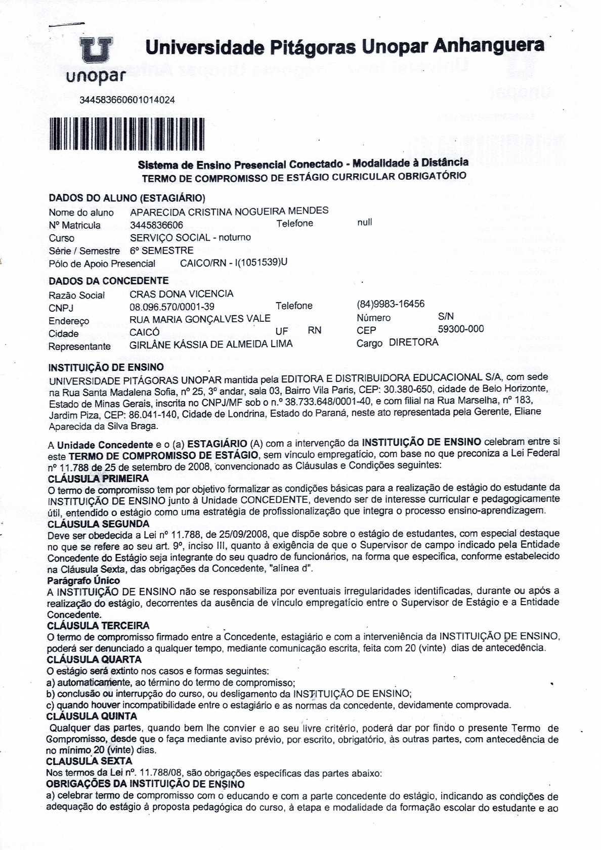 U Universidade Pitágoras Unopar Anhanguera unopar 344583660601014024 Sistema de Ensino Presencial Conectado Modalidade à Distância TERMO DE COMPROMISSO DE ESTÁGIO CURRICULAR OBRIGATÓRIO DADOS DO ALUNO (ESTAGIÁRIO) Nome do aluno APARECIDA CRISTINA NOGUEIRA MENDES N° Matricula 3445836606 Telefone null Curso SERVIÇO SOCIAL noturno Série / Semestre 6° SEMESTRE Pólo de Apoio Presencial CAICO/RN I(1051539)U DADOS DA CONCEDENTE Razão Social CRAS DONA VICENCIA CNPJ 08.096.570/0001-39 Telefone (84)9983-16456 Endereço RUA MARIA GONÇALVES VALE Número S/N Cidade CAICÓ UF RN CEP 59300-000 Representante GIRLÂNE KÁSSIA DE ALMEIDA LIMA Cargo DIRETORA INSTITUIÇÃO DE ENSINO UNIVERSIDADE PITÁGORAS UNOPAR mantida pela EDITORA E DISTRIBUIDORA EDUCACIONAL S/A, com sede na Rua Santa Madalena Sofia, 25, 3° andar, sala 03, Bairro Vila Paris, CEP: 30.380-650, cidade de Belo Horizonte, Estado de Minas Gerais, inscrita no CNPJ/MF sob o e com filial na Rua Marselha, n° 183, Jardim Piza, CEP: 86.041-140, Cidade de Londrina, Estado do Paraná, neste ato representada pela Gerente, Eliane Aparecida da Silva Braga. A Unidade Concedente e o (a) ESTAGIÁRIO (A) com a intervenção da INSTITUIÇÃO DE ENSINO celebram entre si este TERMO DE COMPROMISSO DE ESTÁGIO, sem vínculo empregatício, com base no que preconiza a Lei Federal n° 11.788 de 25 de setembro de 2008, convencionado as Cláusulas e Condições seguintes: CLÁUSULA PRIMEIRA termo de compromisso tem por objetivo formalizar as condições básicas para a realização de estágio do estudante da INSTITUIÇÃO DE ENSINO junto à Unidade CONCEDENTE, devendo ser de interesse curricular e pedagogicamente útil, entendido o estágio como uma estratégia de profissionalização que integra o processo ensino-aprendizagem. CLÁUSULA SEGUNDA Deve ser obedecida a Lei n° 11.788, de 25/09/2008, que dispõe sobre o estágio de estudantes, com especial destaque no que se refere ao seu art. 9°, inciso III, quanto à exigência de que o Supervisor de campo indicado pela Entidade Concedente do Estágio seja integrante do seu quadro de funcionários, na forma que especifica, conforme estabelecido na Cláusula Sexta, das obrigações da Concedente, "alínea d". Parágrafo Único A INSTITUIÇÃO DE ENSINO não se responsabiliza por eventuais irregularidades identificadas, durante ou após a realização do estágio, decorrentes da ausência de vínculo empregatício entre o Supervisor de Estágio e a Entidade Concedente. CLÁUSULA TERCEIRA o termo de compromisso firmado entre a Concedente, estagiário e com a interveniência da INSTITUIÇÃO DE ENSINO, poderá ser denunciado a qualquer tempo, mediante comunicação escrita, feita com 20 (vinte) dias de antecedência. CLÁUSULA QUARTA o estágio será extinto nos casos e formas seguintes: a) automaticamente, ao término do termo de compromisso; b) conclusão ou interrupção do curso, ou desligamento da INSTITUIÇÃO DE ENSINO; c) quando houver incompatibilidade entre o estagiário e as normas da concedente, devidamente comprovada. CLÁUSULA QUINTA Qualquer das partes, quando bem lhe convier e ao seu livre critério, poderá dar por findo o presente Termo de desde que o faça mediante aviso prévio, por escrito, obrigatório, às outras partes, com antecedência de no mínimo 20 (vinte) dias. CLAUSULA SEXTA Nos termos da Lei n°. 11.788/08, são obrigações específicas das partes abaixo: OBRIGAÇÕES DA INSTITUIÇÃO DE ENSINO a) celebrar termo de compromisso com o educando e com a parte concedente do estágio, indicando as condições de adequação do estágio à proposta pedagógica do curso, à etapa e modalidade da formação escolar do estudante e aoU Universidade Pitágoras Unopar Anhanguera unopar 344583660601014024 Sistema de Ensino Presencial Conectado Modalidade à Distância horário e calendário b) estabelecer Plano de Estágio que consubstancie as condições e requisitos a exigência legal de adequação à etapa e modalidade da formação escolar do estagiário; c) indicar professor orientador, da área a ser desenvolvida no estágio, como responsável pelo acompanhamento e avaliação das atividades do estagiário; d) zelar pelo cumprimento do termo de compromisso, reorientando o estagiário para outro local em caso de descumprimento de suas e) elaborar normas complementares e instrumentos de avaliação dos estágios de seus f) Disponibilizar no site da INSTITUIÇÃO DE ENSINO o início do letivo e o período destinado as avaliações g) contratar em favor do estagiário seguro contra acidentes pessoais. CONCEDENTE DO ESTÁGIO a) celebrar termo de compromisso com a INSTITUIÇÃO DE ENSINO e o educando, zelando por seu b) ofertar instalações que tenham condições de proporcionar ao educando atividades de aprendizagem profissional e cultural; c) fornecer condições físicas e materiais indispensáveis ao desempenho das atividades dos estagiários; d) indicar obrigatoriamente, funcionário-de seu quadro de pessoal, com formação ou experiência profissional na área de conhecimento desenvolvida no curso do estagiário, para orientar e supervisionar estagiário (s); e) por ocasião do desligamento do estagiário, entregar termo de realização do estágio com indicação resumida das atividades desenvolvidas, dos períodos e da avaliação de desempenho; f) manter à disposição da fiscalização documentos que comprovem a relação de estágio; g) comunicar a INSTITUIÇÃO DE ENSINO, através dos supervisores acadêmicos, qualquer irregularidade no desenvolvimento do estágio; ESTAGIÁRIO a) elaborar e cumprir fielmente o Plano de Estágio, fixado no Termo de Compromisso; b) responsabilizar-se pelas perdas e danos que venham a ser causadas, em da inobservância das normas internas da concedente e/ou condições constantes no presente termo de compromisso; c) apresentar e cumprir os prazos estabelecidos pela INSTITUIÇÃO DE ENSINO, sobre o relatório das atividades de estágio, cujas 