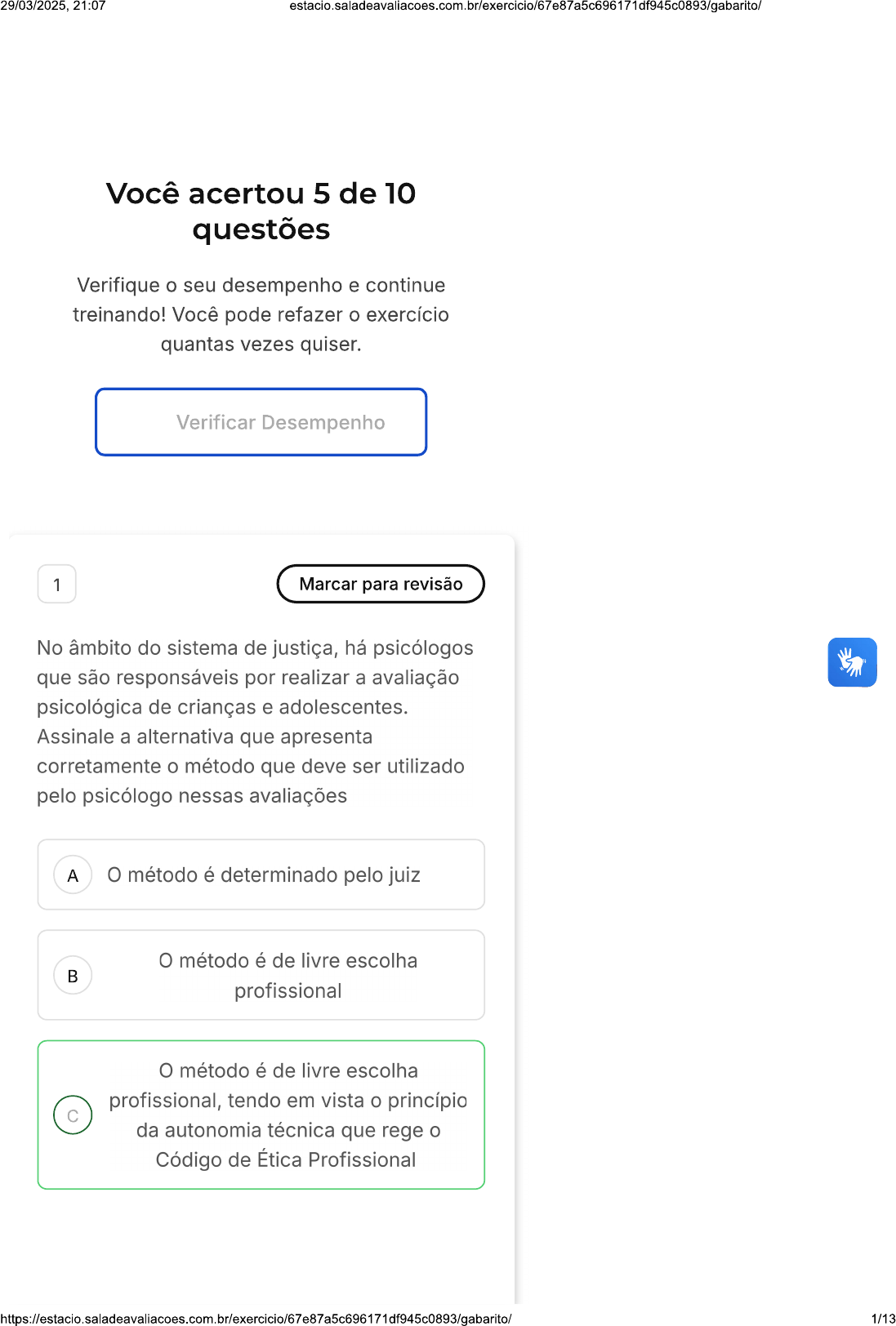 29/03/2025, 21:07 Você acertou 5 de 10 questões Verifique o seu desempenho e continue treinando! Você pode refazer o exercício quantas vezes quiser. Verificar Desempenho 1 Marcar para revisão No âmbito do sistema de justiça, há psicólogos que são responsáveis por realizar a avaliação psicológica de crianças e adolescentes. Assinale a alternativa que apresenta corretamente o método que deve ser utilizado pelo psicólogo nessas avaliações A método é determinado pelo juiz método é de livre escolha B profissional método é de livre escolha profissional, tendo em vista o princípio C da autonomia técnica que rege o Código de Ética Profissional 1/1329/03/2025, 21:07 método é de escolha das partes do D processo método é de escolha do Ministério E Público da Vara de Infância e Juventude Resposta correta Parabéns, você selecionou a alternativa correta. Confira o gabarito comentado! Gabarito Comentado método é de livre escolha profissional, tendo em vista o princípio da autonomia técnica que rege o Código de Ética Profissional 2 Marcar para revisão A doutrina especializada indica que quando se trata de avaliar uma criança, não se deve levá- la tão a sério. que isso significa? Significa que não se deve tomar como A realidade, num primeiro momento, as suas declarações literais Significa que o avaliador não precisa B ter o cuidado de buscar o contexto em que a declaração é emitida https://estacio.saladeavaliacoes.com.br/exercicio/67e87a5c696171df945c0893/gabarito/ 2/1329/03/2025, 21:07 Significa que o profissional que avalia a criança não precisa entender a C dinâmica familiar, incluindo toda a família na avaliação Significa que o profissional deve D avaliar apenas a criança, sem incluir sua família Significa que o avaliador deve se valer E do seu discurso literal para concluir a avaliação X Resposta incorreta Opa! A alternativa correta é a letra A. Confira o gabarito comentado! Gabarito Comentado Significa que não se deve tomar como realidade, num primeiro momento, as suas declarações literais 3 Marcar para revisão A Lei 13.431/2017 é responsável por estabelecer o sistema de garantia de direitos da criança e do adolescente vítima ou testemunha de violência e, em seu art. descreve três tipos de violência sexual. Analise as espécies de violência abaixo e, em seguida, assinale a alternativa que traz corretamente violências do tipo sexual. - Alienação parental. - Abuso sexual. III - Exploração sexual comercial. 3/1329/03/2025, 21:07 IV - Tráfico de pessoas. A II, III e IV B III e IV C I, e IV D e IV E I, e III Resposta correta Parabéns, você selecionou a alternativa correta. Confira o gabarito comentado! Gabarito Comentado II, III e IV 4 Marcar para revisão início do período republicano foi marcado pelo nascimento da política de atendimento, mas numa ótica de extirpar os males sociais em medidas de caridade ou higienistas, que pretendiam extirpar os males sociais, tendo sido criadas entidades assistenciais de caridade ainda aqui visão de segregar os e Nesse contexto, em 1926, foi criado o Código de Menores no Brasil. Sobre o referido diploma, analise os itens a 4/1329/03/2025, 21:07 seguir e, em seguida, assinale a alternativa correta. - A família era responsável por suprir as necessidades básicas das crianças. - - Ao Estado-juiz incumbia o exercício de autoridade descentralizadora sobre a infância pobre. III - - Ao Estado-juiz incumbia o exercício de autoridade protecionista sobre toda e qualquer infância. A e III B C e D e III E III X Resposta incorreta Opa! A alternativa correta é a letra B. Confira o gabarito comentado! Gabarito Comentado 5 Marcar para revisão paradigma menorista vigorou desde o Código de Menores do Brasil até o advento da 5/1329/03/2025, 21:07 Constituição da República em 1988. Sobre o período menorista, considere as afirmações abaixo. - O conceito estigmatizante "menor" acompanhou todo o período menorista - - Esse período foi marcado por internações com quebra de vínculos familiares, com o objetivo de recuperar o "menor". Sobre essas duas afirmativas, assinale a alternativa correta. A primeira é uma afirmativa A verdadeira; e a segunda, falsa A primeira é uma afirmativa falsa; e a B segunda, verdadeira As duas são verdadeiras, mas não C estabelecem relação entre si As duas são verdadeiras e se D complementam E As duas afirmativas são falsas Resposta correta Parabéns, você selecionou a alternativa correta. Confira o gabarito comentado! Gabarito Comentado As duas são verdadeiras e se complementam 6/1329/03/2025, 21:07 6 Marcar para revisão Estatuto da Criança e do Adolescente, Lei 8.069/90, consagra a mudança de paradigma representada pela Constituição de 1988. Sobre o ECA, analise as afirmativas abaixo e, em seguida, assinale a alternativa correta. - - É um microssistema que cuida de efetivar os direitos e implantar o sistema de garantias da área da infância e juventude. II - Representa a doutrina de proteção integral. III - - Se baseia nos princípios da Declaração Universal de Direitos Humanos, a Declaração Universal dos Direitos da Criança e a Convenção sobre os Direitos da Criança. IV - Contrapõe-se ao modelo da situação regular, antes vigente, e que tinha como fonte formal o Código de Menores de 1979. São corretas as afirmações: A B e C I, III, IV Lista de exercícios Psicologia T Sair E I, II, III, IV Questão 8 de 10 1 2 3 4 5 Resposta correta Parabéns, você selecionou a 6 7 8 9 10 alternativa correta. Confira o gabarito comentado! Corretas (5) Incorretas (5) 7/1329/03/2025, 21:07 Gabarito Comentado I, II e III 7 Marcar para revisão A Convenção dos Direitos da Criança, Decreto 99.710 promulgado em 21 de novembro de 1990, é um diploma legal que consagra diversos direitos às crianças e adolescentes. Assinale a alternativa que apresenta corretamente o texto expresso no importante art. 12. Os Estados-partes assegurarão 