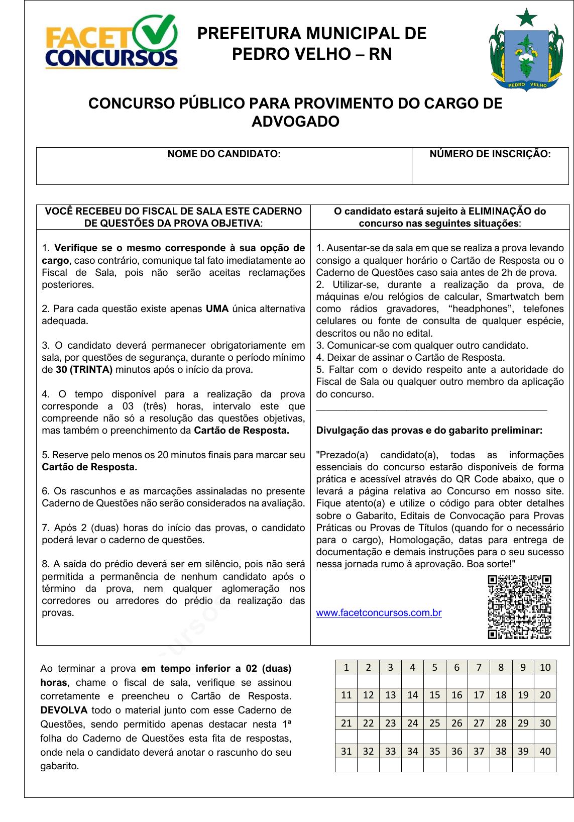 pcimarkpci MjgwNDowMmU4OjgwMjM6ODgwMDo3ODI5Ojk0YzQ6Yjk5NDoyZTVl:U2F0LCAwNSBBcHIgMjAyNSAwOToyNjoxNyAtMDMwMA== www.pciconcursos.com.br 1 PREFEITURA MUNICIPAL DE PEDRO VELHO – RN CONCURSO PÚBLICO PARA PROVIMENTO DO CARGO DE ADVOGADO NOME DO CANDIDATO: NÚMERO DE INSCRIÇÃO: VOCÊ RECEBEU DO FISCAL DE SALA ESTE CADERNO DE QUESTÕES DA PROVA OBJETIVA: O candidato estará sujeito à ELIMINAÇÃO do concurso nas seguintes situações: 1. Verifique se o mesmo corresponde à sua opção de cargo, caso contrário, comunique tal fato imediatamente ao Fiscal de Sala, pois não serão aceitas reclamações posteriores. 2. Para cada questão existe apenas UMA única alternativa adequada. 3. O candidato deverá permanecer obrigatoriamente em sala, por questões de segurança, durante o período mínimo de 30 (TRINTA) minutos após o início da prova. 4. O tempo disponível para a realização da prova corresponde a 03 (três) horas, intervalo este que compreende não só a resolução das questões objetivas, mas também o preenchimento da Cartão de Resposta. 5. Reserve pelo menos os 20 minutos finais para marcar seu Cartão de Resposta. 6. Os rascunhos e as marcações assinaladas no presente Caderno de Questões não serão considerados na avaliação. 7. Após 2 (duas) horas do início das provas, o candidato poderá levar o caderno de questões. 8. A saída do prédio deverá ser em silêncio, pois não será permitida a permanência de nenhum candidato após o término da prova, nem qualquer aglomeração nos corredores ou arredores do prédio da realização das provas. 1. Ausentar-se da sala em que se realiza a prova levando consigo a qualquer horário o Cartão de Resposta ou o Caderno de Questões caso saia antes de 2h de prova. 2. Utilizar-se, durante a realização da prova, de máquinas e/ou relógios de calcular, Smartwatch bem como rádios gravadores, “headphones”, telefones celulares ou fonte de consulta de qualquer espécie, descritos ou não no edital. 3. Comunicar-se com qualquer outro candidato. 4. Deixar de assinar o Cartão de Resposta. 5. Faltar com o devido respeito ante a autoridade do Fiscal de Sala ou qualquer outro membro da aplicação do concurso. ______________________________________________ Divulgação das provas e do gabarito preliminar: "Prezado(a) candidato(a), todas as informações essenciais do concurso estarão disponíveis de forma prática e acessível através do QR Code abaixo, que o levará a página relativa ao Concurso em nosso site. Fique atento(a) e utilize o código para obter detalhes sobre o Gabarito, Editais de Convocação para Provas Práticas ou Provas de Títulos (quando for o necessário para o cargo), Homologação, datas para entrega de documentação e demais instruções para o seu sucesso nessa jornada rumo à aprovação. Boa sorte!" www.facetconcursos.com.br 1 2 3 4 5 6 7 8 9 10 11 12 13 14 15 16 17 18 19 20 21 22 23 24 25 26 27 28 29 30 31 32 33 34 35 36 37 38 39 40 Ao terminar a prova em tempo inferior a 02 (duas) horas, chame o fiscal de sala, verifique se assinou corretamente e preencheu o Cartão de Resposta. DEVOLVA todo o material junto com esse Caderno de Questões, sendo permitido apenas destacar nesta 1ª folha do Caderno de Questões esta fita de respostas, onde nela o candidato deverá anotar o rascunho do seu gabarito. pcimarkpci MjgwNDowMmU4OjgwMjM6ODgwMDo3ODI5Ojk0YzQ6Yjk5NDoyZTVl:U2F0LCAwNSBBcHIgMjAyNSAwOToyNjoxNyAtMDMwMA== www.pciconcursos.com.br 2 CONCURSO PÚBLICO PREFEITURA MUNICIPAL DE PEDRO VELHO - RN ADVOGADO LÍNGUA PORTUGUESA 1. Leia o texto a seguir: Estudo realizado com 800 pares de gêmeos indica que DNA é o fator que mais influencia no bem-estar de uma pessoa – não o que ela vive durante a vida. O que mais influi na felicidade de uma pessoa? As experiências que ela tem durante a vida? Ou características previamente escritas em seu código genético? Essa discussão, que mobiliza a ciência há décadas, acaba de ser desequilibrada a favor de um lado: o DNA. Foi o que concluiu um estudo feito pela Universidade de Edimburgo, na Escócia, que analisou 837 pares de gêmeos. Cada par de gêmeos havia sido criado na mesma casa, pelos mesmos pais, e por isso teve experiências parecidas na vida. Metade dos gêmeos era univitelina, ou seja, com DNA idêntico, e a outra metade bivitelina, com DNA diferente. O objetivo do estudo foi comparar univitelinos e bivitelinos, e com isso identificar a influência do DNA sobre determinadas características do ser humano – inclusive de quem não é gêmeo. Os voluntários responderam a questionários que mediam vários aspectos do bem-estar psicológico, como o grau de autonomia da pessoa e sua capacidade de ter relacionamentos saudáveis. Os gêmeos univitelinos, de DNA igual, tiveram pontuação mais parecida que os bivitelinos – que têm DNA diferentes, mas cresceram no mesmo ambiente. Ou seja: na prática, o DNA influencia mais que o ambiente no grau de felicidade da pessoa. "Houve influências genéticas substanciais em todos os componentes", diz o psicólogo Timothy Bates, autor do estudo. "Já os efeitos do ambiente foram insignificantes". Em suma: cada pessoa tende a um nível natural de felicidade, que já vem programado no seu código genético. Lembre-se disso na próxima vez em que você estiver muito feliz – ou infeliz. Fonte: Superinteressante, Julho/2012. Após efetuar a leitura do texto, é correto afirmar que: I. O estudo realizado com gêmeos univitelinos e bivitelinos sugere que as experiências de vida têm um impacto significativo e indispensável no bem-estar psicológico dos indivíduos. II. A pesquisa conclui que a genética exerce uma influência preponderante sobre o grau de felicidade, em comparação ao ambiente em que a pessoa é criada. III. Os gêmeos univitelinos apresentaram pontuações de bem-estar psicológico mais similares entre si do que os gêmeos bivitelinos. IV. O estudo desconsidera a influência do ambiente na forma