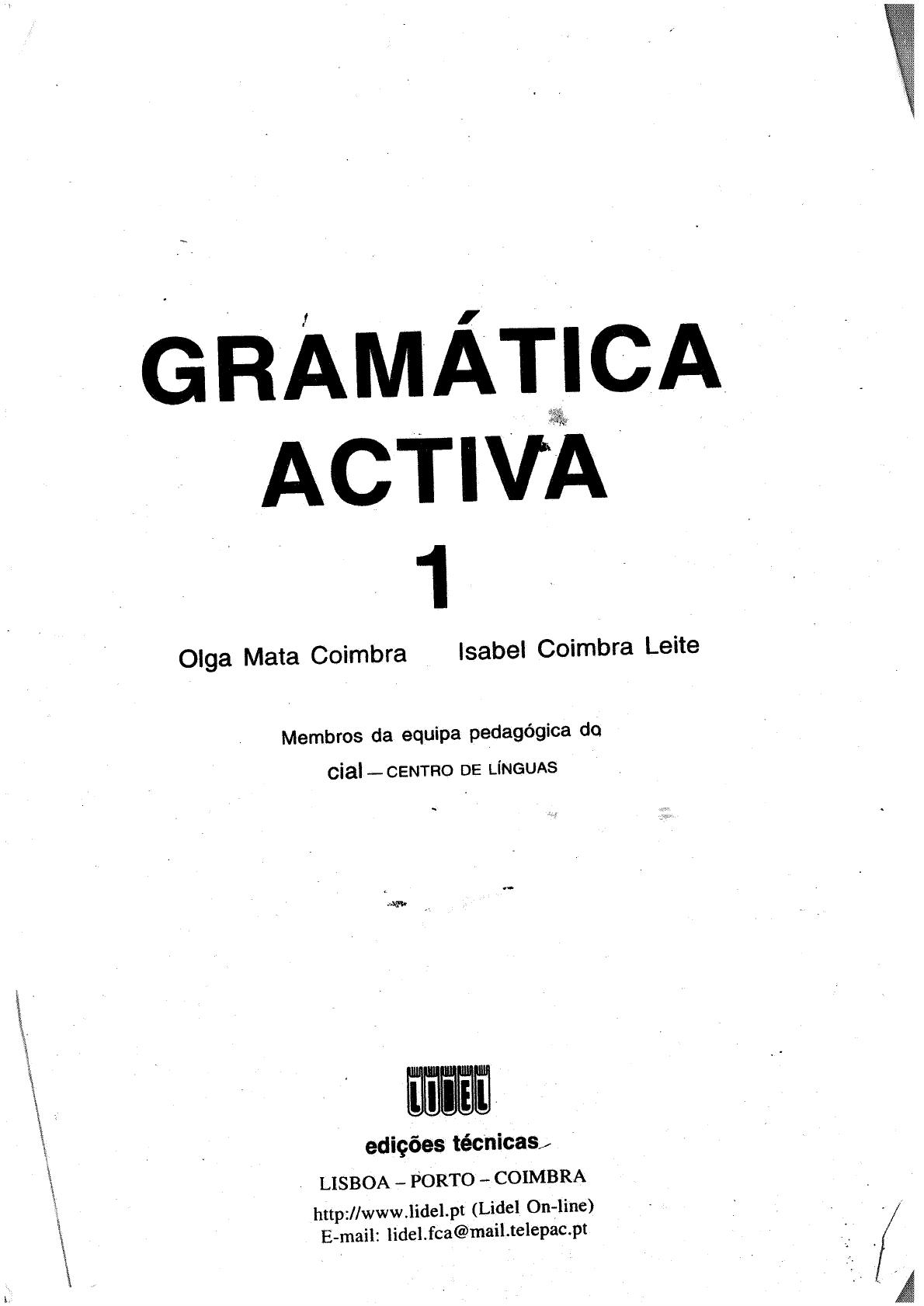 GRAMÁTICA ACTIVA 1 Olga Mata Coimbra Isabel Coimbra Leite Membros da equipa pedagógica da cial - CENTRO DE LÍNGUAS edições técnicas LISBOA - PORTO - COIMBRA http://www.lidel.pt (Lidel On-line) E-mail: lidel.fca@mail.telepac.ptÍndice Introdução 5 Unidade 1 sou / és / é / somos / são (presente do indicativo verbo ser) 6 Unidade 2 estou / estás / está / estamos / estão (presente do indicativo verbo estar) 8 Unidade 3 ser vs. estar 10 Unidade 4 estar a + infinitivo (realização prolongada no presente) 12 Unidade 5 verbos regulares em -ar (presente do indicativo) 14 Unidade 6 verbos regulares em -er (presente do indicativo) 16 Unidade 7 verbos irregulares em -er (presente do indicativo) 18 Unidade 8 verbos regulares e irregulares em 20 verbos em -air (presente do indicativo) 20 Unidade 9 estou a fazer (realização prolongada no presente) 22 e faço (presente do indicativo) 22 Unidade 10 tenho / tens / tem / temos / têm (presente do indicativo verbo ter) 24 Unidade 11 eu fui / estive / tive (pretérito perfeito simples; verbos irregulares) 26 Unidade 12 verbos regulares em -ar, -er e (pretérito perfeito simples) 28 Unidade 13 verbos irregulares; verbos em -air (pretérito perfeito simples) 30 Unidade 14 conjugação pronominal reflexa; colocação do pronome 32 Unidade 15 verbos regulares e irregulares (pretérito imperfeito do indicativo; aspecto durativo e frequentativo) 34 Unidade 16 costumar (imperfeito) + infinitivo (acção habitual no passado) 36 Unidade 17 idade e horas no passado, acções simultâneas no passado (pretérito imperfeito do indicativo) 38 Unidade 18 estava a fazer (acção a decorrer no passado) 40 e fiz (acção pontual) (imperfeito vs. p.p.s.) 40 Unidade 19 imperfeito de cortesia; imperfeito com valor de condicional 42 Unidade 20 tinha feito (pretérito mais-que-perfeito composto do indicativo) 44 Unidade 21 tenho feito (pretérito perfeito composto do indicativo) 46 Unidade 22 vou fazer, estou a fazer e acabei de fazer 48 Unidade 23 futuro imperfeito do indicativo (verbos regulares e irregulares) 50 Unidade 24 condicional presente (verbos regulares e irregulares) 52 Unidade 25 o, a, os, as; um, uma, uns, umas (artigos definidos e indefinidos) 54 Unidade 26 isto, isso, aquilo (demonstrativos invariáveis) 56 aqui, aí, ali (advérbios de lugar) 56 Unidade 27 este, esse, aquele, etc. (demonstrativos variáveis) 58 Unidade 28 meu, teu, seu, etc. (possessivos) 60 Unidade 29 discurso directo e indirecto 62 Unidade 30 infinitivo pessoal 64 Unidade 31 imperativo (verbos regulares e irregulares) 66 Unidade 32 comparativos 68 370 Unidade 33 superlativos 72 Unidade 34 tão e tanto Unidade 35 comigo, contigo, etc.; para mim, para ti, etc. (preposições + pronomes pessoais) 74 Unidade 36 me, te, o, a, etc. (pronomes pessoais complemento directo) 76 Unidade 37 me, te, lhe, etc. (pronomes pessoais complemento indirecto) 78 mo(s), ma(s), etc. (pronomes pessoais complemento indirecto + complemento 78 directo) Unidade 38 voz passiva: ser + particípio passado 80 Unidade 39 voz passiva: estar + particípio passado; particípios duplos 82 84 Unidade 40 palavra apassivante se Unidade 41 a, de, em, para, por (preposições de movimento) 86 Unidade 42 a, em cima de, dentro de, etc. (preposições e locuções prepositivas de lugar) 88 Unidade 43 a, de, em, para, por (preposições de tempo) 90 92 Unidade 44 interrogativos 94 Unidade 45 indefinidos 96 Unidade 46 relativos Unidade 47 poder, conseguir, saber, conhecer, dever, ter de/que, precisar de 98 Unidade 48 gerúndio simples; + gerúndio (realização gradual) 100 102 Unidade 49 desde e há 104 Unidade 50 haver; haver de + infinitivo 106 Apêndice 1 Lista de verbos (regulares e irregulares) Apêndice 2 Formação do plural (substantivos e adjectivos) 108 109 Apêndice 3 Pronomes pessoais 110 Chave dos Exercícios 4Introdução A Gramática Activa 1 destina-se ao ensino do português como língua estrangeira ou do português como segunda língua e cobre as principais estruturas do nível elementar. Sendo um livro com explicações e exercícios gramaticais, não está orientado para ser um curso de Português para Estrangeiros. É um livro que deve ser usado como material suplementar ao curso, na sala de aula ou em casa. A Gramática Activa 1 divide-se em 50 unidades, cada uma delas focando áreas específicas da gramática portuguesa, tais como tempos verbais, pronomes, artigos, adjectivos, preposi- ções, etc. livro não deverá ser trabalhado do princípio ao fim, seguindo a ordem numérica das unidades. Estas devem ser antes seleccionadas e trabalhadas de acordo com as dificuldades do(s) aluno(s). Cada unidade compõe-se de 2 páginas, contendo a página da esquerda as explicações gramaticais e a página da direita os exercícios correspondentes à(s) estrutura(s) apresentada(s). No fim do livro há ainda 3 apêndices lista de verbos regulares e irregulares; plural dos substantivos e adjectivos e pronomes pessoais - bem como a chave dos exercícios. 5Unidade 1 sou / és / é / somos / são (presente do indicativo - verbo ser) 1,95m DR. Eu sou médico. Ele é alto. Nós somos portugueses. Eu não sou enfermeiro. Ele não é baixo. Nós não somos brasileiros. ser afirmativa negativa eu sou eu não sou tu és tu não és você você ele é ele não é ela ela nós somos nós não somos vocês vocês eles são eles não são elas elas Vocês são portugueses? nacionalidades Eu sou português, mas ele é brasileiro. Sou professor e o meu irmão é engenheiro. profissões Ela é casada. estado civil És de Lisboa? origem (de + substantivo) Não, não sou de Lisboa. Sou de Faro. O dicionário é do professor. posse (de + substantivo) Que horas são? tempo cronológico (horas; dias da semana; datas) É uma hora. A mesa é de madeira. matéria (de + substantivo) Lisboa é em Portugal. É a capital de Portugal. situação geográfica (sujeito fixo) Eu e a Joana somos boas amigas. substantivo O João é muito inteligent