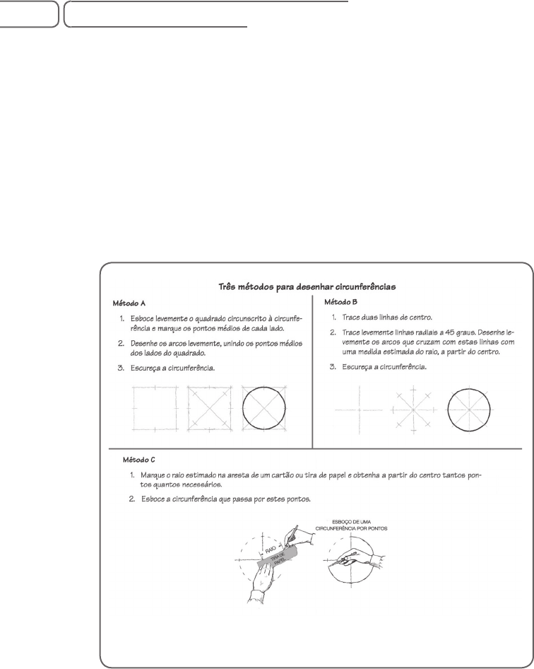 necessário. Uma vez estabelecida esta unidade, você pode girar o instrumento em 90°, mantendo-o perpendicular a sua linha de visão e exatamente na mesma distância dos olhos (CURTIS, 2015). Se preferir, você pode utilizar o objeto mondriano como mira. A tendên- cia de você alinhar a orientação dos objetos do campo de visão pelos eixos cartesianos (x e y) por meio da mira é tão forte, no desenho de observação, que você deve alinhar seu instrumento em frente a uma parede vazia, para não perder o prumo. Ao realinha-lo, você evita que as suas percepções diretas sejam influenciadas pelo conhecimento da sua mente (CURTIS, 2015). Figura 2. Três técnicas para desenhar circunferências. Fonte: Giesecke et al. (2002, p. 60). Enquanto as técnicas de proporção são estimadas pelo seu campo de visão, as técnicas do sistema de medição modular vêm evoluindo ao longo dos sé- culos, até se tornarem o sistema de medida métrico com o módulo de 10 cm, utilizado hoje como o principal sistema de medição mundial. Esse sistema foi adotado pela maioria dos países, já no final do século XX. Desenho de observação e de memória56 DA_U1_C03.indd 56 01/12/2017 16:51:50 O sistema de escala teve origem no dimensionamento modular grego e romano. As formas geométricas de Platão e Virtrúvio (o círculo, o triângulo e o quadrado) eram, em tempos remotos, um sistema de medição que auxiliava medir outras formas poligonais. Apesar de terem tido pouca aplicação para projeto e construção, a partir deles foi desenvolvida a dimensão do pentágono ideal, que embasou a relação matemática “áurea”. Posteriormente, o arquiteto Le Corbusier desenvolveu uma teoria das proporções do corpo humano baseado nas dimensões estéticas da relação “áurea”. O raio, a corda e a altura do triângulo compuseram, também, um sistema geométrico de medição utilizado para a construção de edificações redondas no período romano (NEUFERT, 2004). Um dos principais desafios que você vai enfrentar é o esboço da figura humana completa. Ao compreender as relações da teoria de Le Corbusier sobre as proporções do corpo humano, você poderá se beneficiar delas na elaboração de croquis. Você pode utilizar, também, o cânone grego de proporções que subdivide o corpo em oito cabeças. No século XX, com a industrialização, os arquitetos desenvolveram estudos de coordenação modular para auxiliar na construção pré-fabricada. O módulo era um sistema de medição para reger as superfícies e os volumes. Em 1932, Walter Groupius projetou uma casa modular cuja planta podia crescer por adição de novos volumes. A França, a partir de 1942, passou a adotar o módulo-base de 10 cm, ao passo que a Inglaterra, por exemplo, passou a adotar o sistema de quatro polegadas, a partir de 1966 (SOUSA, 2011). Ainda que técnicas de proporção e do sistema de escala estejam intrin- sicamente relacionadas, é importante que você consiga, a partir desse breve histórico, isolar o sistema de escala no momento do desenho de observação. O arquiteto tende a usar o conhecimento disponível na memória para sua elaboração, mas é preciso lembrar que no desenho de observação, você precisa registrar a proporção que vê, e não a que sabe. O uso constante do instrumento ajuda a preservar a precisão das proporções percebidas, com base no sistema cartesiano. As dimensões que você sabe de memória, pode aplicar em esboços de projeção paralela, conforme apresentado no próximo tópico, embora não representem a realidade observada. Métodos de projeção cônica e paralela O método de projeção envolve os olhos do observador ou o ponto de vista, o objeto, o plano de projeção e as projetantes, também chamadas de raios visuais 57Desenho de observação e de memória DA_U1_C03.indd 57 01/12/2017 16:51:50 ou linhas de visada. Existem dois métodos de projeção: a projeção cônica e a paralela, e suas respectivas perspectivas e vistas você pode observar na Tabela 2. Fonte: adaptada de Giesecke et al. (2002). Projeção Perspectiva Cônica Linear Com 1 ponto de fuga Com 2 pontos de fuga Com 3 pontos de fuga Aérea Paralela Ortogonal 1) Axonométrica Isométrica: todos os eixos se reduzem igualmente Dimétrica: dois eixos se reduzem igualmente Trimétrica: todos os três eixos se reduzem diferentemente 2) Oblíqua Cavaleira Cabinet Tabela 2. Classificação das projeções. Nas vistas ortográficas (Figura 3), os raios visuais são paralelos entre si e perpendiculares ao plano de projeção (GIESECKE et al., 2002). Você pode utilizá-las para desenhar fachadas em esboços arquitetônicos a mão livre. Na projeção axonométrica (Figura 3), os raios visuais também são paralelos entre si e perpendiculares ao plano de projeção. Quando uma superfície é inclinada, em relação ao plano de projeção, aparecendo reduzida nas vistas principais, a perspectiva é isométrica. Nessa perspectiva, você precisa manter todo o desenho em proporção, mas não precisa trazer as medidas de forma precisa para localizar cada elemento do desenho (GIESECKE et al., 2002). Na projeção oblíqua (Figura 3), os raios visuais são paralelos entre si e oblíquos ao plano de projeção. Na perspectiva cavaleira, a vista frontal do Desenho de observação e de memória58 DA_U1_C03.indd 58 01/12/2017 16:51:50 objeto (largura e altura) é apresentada em verdadeira grandeza, porém as outras superfícies aparecem em tamanho reduzido, sendo fáceis para elaborar esboços de objetos e de arquitetura (GIESECKE et al., 2002). “Quando as linhas fugantes são desenhadas com metade do seu tamanho, a perspectiva cavaleira há a comumente conhecida como projeção cabinet (gabinete).” (GIESECKE et al., 2002, p. 168). Figura 3. Quatro tipos de representação por projeção. Fonte: Giesecke et al. (2002, p. 157). Você vai utilizar, no desenho de observação, a perspectiva cônica (Figura 3), cujos raios visuai