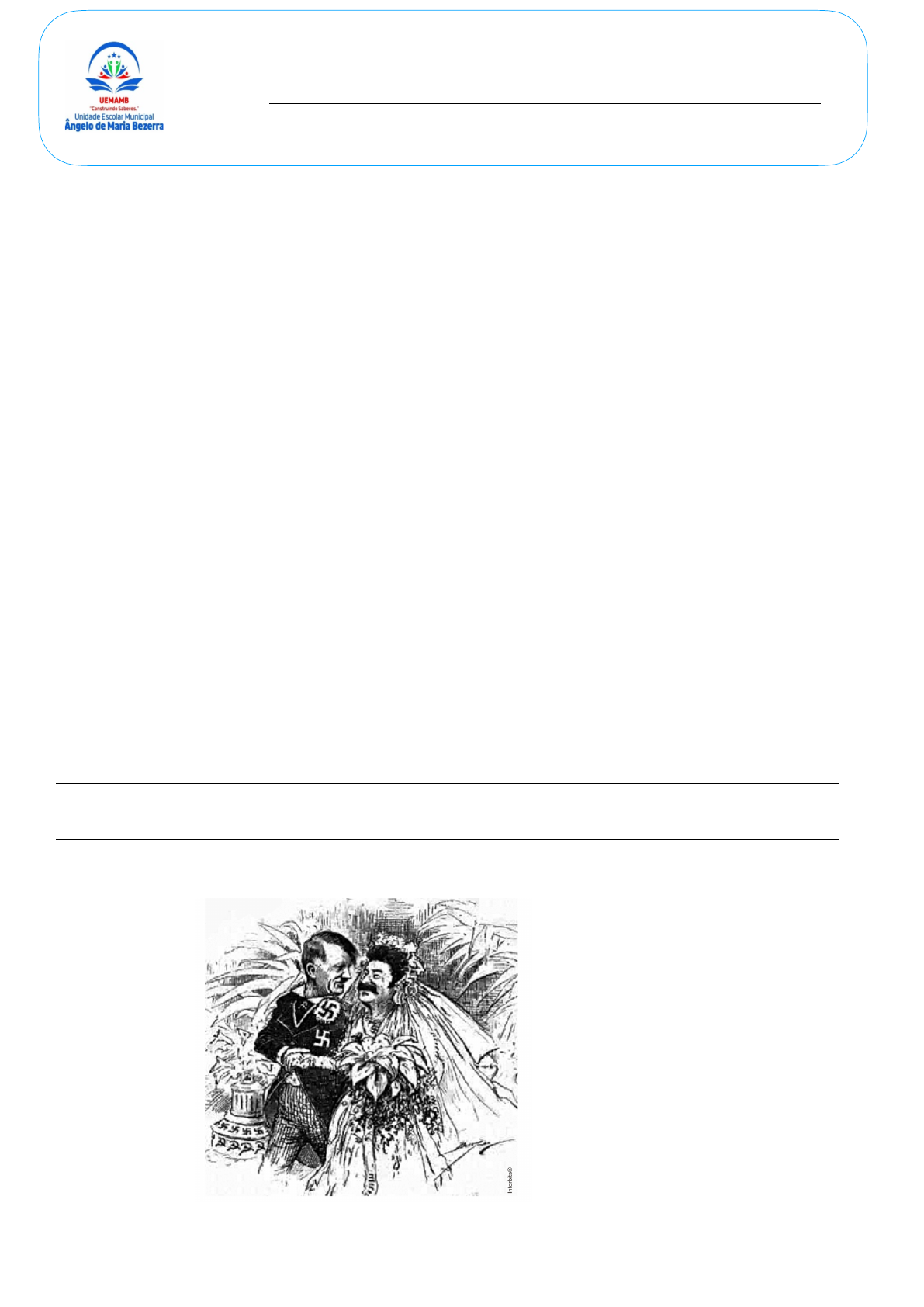 AVALIAÇÃO DE HISTÓRIA DO MÊS DE AGOSTO 1. A 2ª Guerra Mundial assistiu a um confronto entre Eixo e Aliados. Assinale a alternativa que apresenta corretamente três países Aliados: a) Inglaterra, Estados Unidos, União Soviética. b) Inglaterra, Alemanha, Japão. c) Itália, Alemanha, Japão. d) Japão, Alemanha, Estados Unidos. e) Alemanha, Itália, Inglaterra. 2. Podemos apontar como uma das principais causas da Segunda Guerra Mundial: a) A rivalidade política e militar entre Alemanha e Itália no final da década de 1930. b) O surgimento e fortalecimento, na década de 1930, de governos totalitários na Europa, com objetivos expansionistas e militaristas. c) A política expansionista da França, que invadiu e conquistou vários territórios na Europa e na África no final da década de 1930. d) A aliança militar estabelecida por Itália, Alemanha e Estados Unidos no começo da década de 1930. 3. Qual das alternativas abaixo aponta o marco inicial da Segunda Guerra Mundial? a) O ataque do Japão à base militar norte-americana de Pearl Harbor. b) Os diversos bombardeios britânicos a várias cidades alemãs. c) A invasão da Polônia pelas forças armadas da Alemanha em 1º de setembro de 1939. d) O estabelecimento de acordos militares entre Alemanha, Itália e Japão 4. O que foi a Operação Barbarossa e qual o seu objetivo ? 5. Observe a imagem. UNIDADE ESCOLAR MUNICIPAL ÂNGELO DE MARIA BEZERRA PROFESSOR (A): ALÍCIA KELLY DE ARAÚJO SILVA DISCIPLINAS: HISTÓRIA ALUNO (A): N: TURMA:9ªANO DATA: ___/____/ 2024 NOTA : A charge acima, de autoria desconhecida, foi publicada em 1939. Ela se refere ao tratado assinado naquele ano pela Alemanha e a União Soviética, que: a) assegurou a aliança militar entre os dois países durante a Segunda Guerra Mundial e a partição da Polônia. b) consagrou o apoio bélico dos dois países aos fascistas na Guerra Civil Espanhola e ampliou a influência política alemã no leste europeu. c) impediu a eclosão de guerra aberta entre os dois países e freou o avanço militar nazi-fascista na Europa. d) determinou a nova divisão política do leste europeu, no período posterior à Segunda Guerra Mundial, e consolidou a hegemonia soviética na região. e) estabeleceu a intensificação dos laços comerciais e o compromisso de não-agressão mútua entre os dois países. 6. Descreva segundo o estudado o que foi o Holocausto: 7. Leia o texto abaixo e, em seguida, observe a imagem. Declaração Universal dos Direitos Humanos Artigo 2o: Todos os seres humanos podem invocar os direitos e as liberdades proclamados na presente Declaração, sem distinção alguma, nomeadamente de raça, de cor, de sexo, de língua, de religião, de opinião política ou outra, de origem nacional ou social, de fortuna, de nascimento ou de qualquer outra situação. Além disso, não será feita nenhuma distinção fundada no estatuto político, jurídico ou internacional do país ou do território da naturalidade da pessoa, seja esse país ou território independente, sob tutela, autônomo ou sujeito a alguma limitação de soberania. a) A Declaração Universal dos Direitos do Homem foi fundamental no combate às desigualdades pelo mundo, sobretudo no que diz respeito ao racismo. Nessa mesma lógica de igualdade entre os indivíduos, Martin Luther King foi fundamental na luta contra o racismo nos Estados Unidos. b) A Declaração Universal dos Direitos do Homem foi importante apenas na luta contra as desigualdades sociais, mas combater os problemas relacionados ao racismo não estava entre suas metas. Martin Luther King, pelo contrário, foi um ativista na luta contra o racismo nos Estados Unidos. c) A Declaração Universal dos Direitos do Homem foi criada pela Assembleia Geral das Nações Unidas, mas na prática não surtiu nenhum efeito; assim como Martin Luther King teve sua atuação bastante limitada, e sua luta contra o racismo também não deu resultados significativos. d) A Declaração Universal dos Direitos do Homem foi essencial na luta contra o racismo pelo mundo. Já Martin Luther King se preocupou em combater as desigualdades sociais, visto que nos Estados Unidos o racismo era quase inexistente durante o século XX. 8. Primo Levi, judeu e antifascista, no fim de 1943, aos 24 anos, foi preso pela polícia italiana e entregue às forças de ocupação alemãs. Logo se fechava atrás dele o portão do campo de Auschwitz com a inscrição “O trabalho liberta”, e Levi compreendeu: “Então isto é o inferno”. No decorrer da Segunda Guerra Mundial (1939-1945), campos de concentração foram criados em vários países europeus, sendo um dos maiores o complexo de Auschwitz, na Polônia. Para lá, eram enviados em massa aqueles considerados inimigos da nação alemã. De acordo com a imagem e com o texto, a frase “O trabalho liberta” apontava para a seguinte estratégia do projeto nazista: a) treinamento de capitais humanos b) controle de recursos de pesquisas c) exclusão de operários improdutivos d) exploração da mão de obra dos reclusos