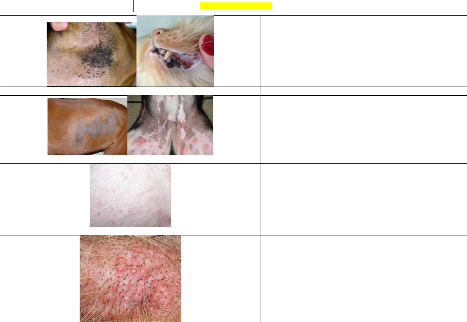 MÁCULA MANCHA PÁPULAS PLACA LESÕES PRIMÁRIAS NÓDULO CISTO VESÍCULA BOLHA PÚSTULA PETÉQUIA EQUIMOSE DESCAMAÇÃO COLARETE EPIDÉRMICO COMEDO EROSÃO LESÕES SECUNDÁRIAS ENDURECIMENTO CICATRIZ ATROFIA LIQUENIFICAÇÃO HIPERQUERATOSE SARCOPTES SCABEI – SARNA SARCÓPTICA – ESCABIOSE Sinais: Prurido intenso. Pápulas eritematosas, alopecia, linfonodomegalia. Ácaro Sarcoptes escava a pele. Dermatose papulocrostosa. Diagnóstico: sinais clínicos, reflexo otopodal, raspado da lesão, leucograma (eosinofilia). Tratamento: Advocate duas aplicação, intervalo mensal; Limpeza do ambiente com amitracina + eliminação de caminhas. ESCABIOSE FELINA Sinais: Lesões em borda de orelha e face, pálpebras e pescoço. Hiperqueratose, crostas, alopecia parcial, prurido intenso. Ácaro Notoedres cati. Diagnóstico: sinais clínicos, raspado da lesão (ácaro pequeno). Tratamento: Advocate duas aplicação, intervalo mensal. DEMODEX CANIS– SARNA DEMODÉCICA – ESCABIOSE Sinais: Localizadas: alopecias, crostas e escurecimento da pele. Não tem prurido, se tem, é devida infecção bacteriana. Piodermite secundária. Generalizadas: prurido intenso, linfonodomegalia, perda de peso e febre. Diagnóstico: Raspado profundo em 5 regiões (positivo = 3 demodex). Tratamento: Advocate duas a 4 aplicações aplicação, intervalo mensal ou semanal a depender do caso. INFECÇÕES PARASITÁRIAS MALASSEZIOSE Sinais: Prurido, alopecia, Liquenificação, Hiperpigmentação, eritema, odor rançoso. Face, pescoço ventral, axilas, ventre, interdígitos. Diagnóstico: Sinais clínicos, citologia por impressão e cultura fúngica. Tratamento: Cetoconazol 5-10 mg/kg BID, VO, 7-10 dias após a cura. PIODERMITE Sinais: pústulas no abdômen e axilas, pele eritematosa e crostas melicéricas. Diagnóstico: Tratamento diagnóstico. Cultura se não funcionar. Tratamento: Rifocina spray; Clorexidina e Peroxido de benzoila 7-10 dias alternados. Uso tópico. PIODERMITE – DERMATITE ÚMIDA Sinais: lesão úmida, superficial, alo avermelhado, febre e dor, pode ter prurido intenso. Diagnóstico: Tratamento: Antisséptico para limpeza; Quadriderm (creme com associação de antibiótico e antinflamatório); Cefalexina 25mg/kg BID. Colar. PIODERMITE – INTERDIGITAL Sinais: abscessos, sangramento, prurido, ulceras, bolhas, alopecia, umidade, edema, claudicação e eritema. Diagnóstico: histórico, raspado de pele, cultura fúngica e bacteriana, citologia do exsudato e Rx (descartar artrite). Tratamento: Cefalexina 25mg/kg BID de 6-8 semanas. Tricotomia. Colar. PIODERMITE PROFUNDA Sinais: pápulas, erosões, crostas, úlceras, alopecia, hiperpgmentação, linfonodomegalia, febre, prostração, inapetência. Diagnóstico: Tratamento: Cefalexina 25mg/kg BID de 6-8 semanas. Xampu antisséptico. Tricotomia. INFECÇÃO BACTERIANA DERMATITE ALÉRGICA À PICADA DE PULGA Sinais: Erupções pruriginosas, papulares, crostosas, eritemas, seborreia, alopecia, escoriações, Piodermite, Hiperpigmentação, Liquenificação. Alopecia triangular na região dorsal lombossacral. Diagnóstico: Sinais clínicos e tratamento diagnóstico. Tratamento: Preventivo contra pulgas, banhos com queratolítico corticoide se não tiver piodermite. Tratar pornô mínimo 3 meses com o preventivo. ALERGIA ALIMENTAR Sinais: Prurido localizado ou generalizado, eritema, dermatite úmida aguda, esfoliação, hiperqueratose, alopecia, Malasseziose. Diagnóstico: Sinais clínicos e tratamento diagnóstico. Tratamento: Fonte proteica não ingerida pelo paciente, dietas hipoalergênica. Mínimo 8 semanas + manter tratamento para DAPP. ATOPIA Sinais: Prurido, eritema, esfoliação, alopecia, etc. Diagnóstico: Descartar DAPP e alergia alimentar. Sinais clínicos e tratamento diagnóstico. Tratamento: Prednisolona 0,5-1mg/kg, VO, BID. Peroxido de benzoila 2,5-5% uso tópico. Apoquel (antialergico0 VO, BID, após 14 dias SID. QUADROS ALÉRGICOS OTITE CERUMINOSA Sinais: Aumento do cerúmen, prurido, inflamação, eritema e edema. Cera enegrecida. Diagnóstico: Otoscopia, citologia do cerúmen, cultura fúngica. Tratamento: Ceruminolítico 2x/d de 3-7 dias. Corticoide após limpeza por 21-30 dias. Antifúngico para Malassezia, Advocate para Otodectes. OTITE CERUMINOSA OTOACARÍASE Sinais: Prurido intenso, aumento do cerúmen. Diagnóstico: Otoscopia, citologia do cerúmen, cultura fúngica. Tratamento: Ceruminolítico 2x/d de 3-7 dias. 21-30 dias. Antibiótico e Antifúngico para infecção secundária, Parasiticida tópico e Advocate se infestação 1 x ao mês, isolar animal, limpeza do ambiente. OTITE ECZEMATOSA Sinais: Eritema, edema, hiperhidrose e descamação. Pápulas esbranquiçadas, pode obstruir o conduto. Diagnóstico: Sinais clínicos, otoscopia, citologia do cerúmen, cultura fúngica. Tratamento: Ceruminolítico, Antifúngico se malassezia. Tratar causa de base em alergopatas – corticoide em atópicos. Não usar corticoide se otite purulenta. OTITE PURULENTA Sinais: Pus, pólipos ou neoplasias no meato acústico, edema, eritema. Diagnóstico: Citologia (neutrófilos), cultura e antibiograma. Tratamento: Ceruminolítico, Antibiótico e Antinflamatório de uso tópico, tratar por 20 dias até o desaparecimento dos sintomas + 7 dias após. Otite purulenta: lavagem. OTITES OTITE HIPERPLASICA Sinais: Edema, estenose parcial, eritema e Hiperpigmentação em alguns casos. Diagnóstico: Sinais clínicos, histórico. Tratamento: Creme com Dexametasona sobre o conduto auditivo para desobstruir e avaliar com otoscopia. OTITE ESTENOSANTE Sinais: Estenose completa.. Diagnóstico: Sinais clínicos, histórico. Tratamento: Cirúrgico. OTITE MÉDIA - PÓLIPOS NASOFARINGEOS Sinais: Formações não neoplásicas na orelha média. Meneios cefálicos, dor à manipulação, alteração de apetite, prostração, perda auditiva. Girar a cabeça para o lado da otite. Diagnóstico: Radiografia, tomografia. Tratamento: OTITE MÉDIA PARALISIA DE NERVO FACIAL Sinais: Inclinação 