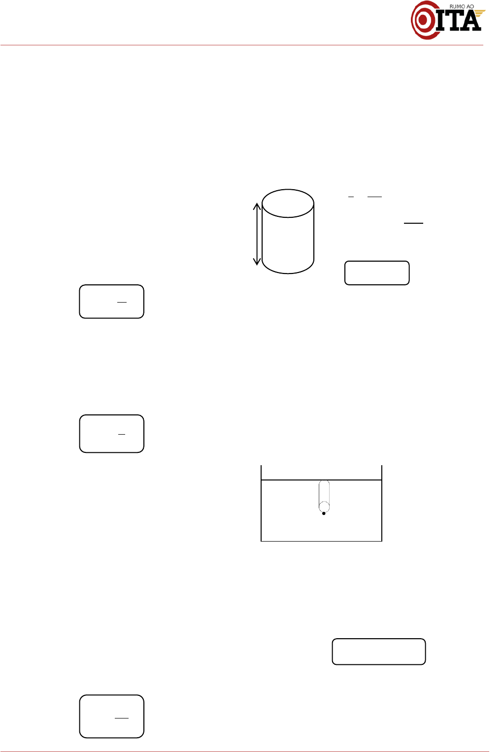1 | P r o j e t o R u m o a o I T A – w w w . r u m o a o i t a . c o m A HIDROSTÁTICA A Hidrostática é a área da física que estuda as forças atuantes em fluidos em equilíbrio. Por isso, pode também ser chamada de Fluidostática, apesar de o primeiro nome ser recorrentemente mais utilizado. 1. Definições iniciais - Densidade (massa específica ou massa volumétrica): grandeza escalar definida pela razão entre a massa e o volume de uma substância. Unidade no SI: ⁄ - Peso específico: grandeza escalar definida pela razão entre o peso e o volume de uma substância. Unidade no SI: ⁄ - Pressão média: imagine a seguinte situação. Um homem, com o dedo indicador, pressiona uma parede lisa e rígida que está fixa. Obviamente, nada acontece. Com a mesma força, pressiona a ponta de um prego fixado, e ele perfura o seu dedo. O que fez com que a entrada no prego fosse facilitada é a diferença da distribuição superficial da força exercida pelo homem. Entra aí o conceito de pressão média, que é a grandeza escalar utilizada para mensurar essa distribuição de uma força perpendicular a uma superfície. Unidade no SI: ⁄ 2. Pressão Hidrostática Considere um cilindro reto vertical de área da base e altura , com um fluido de densidade enchendo-o completamente. Vamos calcular a pressão exercida por ele no fundo do cilindro: - Pressão em um ponto Veja que, na fórmula encontrada anteriormente, a pressão no fundo de um cilindro de fluido não depende da área de sua seção transversal. Portanto, para determinar a pressão em um ponto em particular basta imaginar um cilindro de área tão pequena quanto se queira, de forma que a pressão hidrostática nele é a mesma exercida sobre o fundo do cilindro. Entretanto, para avaliar a pressão absoluta (ou pressão total) naquele ponto, é preciso levar em consideração a pressão da superfície do fluido (frequentemente a pressão atmosférica), donde: 𝜇 𝑚𝑉 𝜌 𝑃𝑉 𝑝 𝐹 𝐴 A h 𝑝 𝜇 𝑔 𝑝𝐴 𝑝 + 𝜇𝑔 2 | P r o j e t o R u m o a o I T A – w w w . r u m o a o i t a . c o m Graficamente: Dessa forma, podemos concluir dois fatos: 1. A pressão cresce com a profundidade; 2. Em um fluido homogêneo, dois pontos de mesma profundidade possuem a mesma pressão. 3. Teorema de Stevin O Teorema de Stevin nos diz que a diferença de pressão entre dois pontos distintos de um líquido homogêneo em repouso é igual a exercida pela coluna de fluido que os separa. De fato, tomemos dois pontos, e , em profundidades, respectivamente, e , como na figura abaixo: 4. Pressão atmosférica, barômetro e a experiência de Torricelli A atmosfera é composta de gases e sua composição varia de acordo com a altitude tomada, ou seja, é um fluido não-homogêneo. Sua densidade diminui com o aumento da distância à superfície terrestre, e por isso o ar fica mais rarefeito à medida em que subimos. Assim, a pressão exercida pela atmosfera sobre um corpo exposto a ela também é variável! Entretanto, para a realização de muitos experimentos, se faz necessário conhecer o valor da pressão atmosférica do local, e isso é feito com o auxílio de um dispositivo chamado barômetro. O primeiro barômetro foi inventado no século XVII pelo físico Torricelli, e o seu dispositivo criado, apesar de não ser mais amplamente utilizado, possui grande importância histórica e seu estudo é cobrado em vestibulares até hoje. Por isso, vejamos mais sobre ele. O cientista procedeu da seguinte forma: em um recipiente contendo mercúrio (líquido nas condições ambientes), ele emborcou um tubo completamente cheio do mesmo elemento, como pode ser visto na figura abaixo. Ao realizar diversas medições, observou que a altura da coluna sempre possuía o mesmo valor (760 mm ao nível do mar e a 0ºC), independendo da altura ou do formato do tubo. Mas isso já era o esperado, certo? Afinal, tomando os pontos A e B na altura da superfície, como na figura, temos o seguinte: é a pressão exercida apenas pela coluna de mercúrio, uma vez que acima dela existe vácuo, que não exerce força sobre o líquido (atente para quando isso não acontecer em exercícios, pois nesses casos será preciso considerar a pressão do gás em questão) e é gerada apenas pela atmosfera. Dessa maneira: 𝑝 𝑝 𝑎 𝑏 ∆ A B 𝑝𝐵 𝑝𝐴 𝜇𝑔∆ 760 mm vácuo Mercúrio (Hg) A B 3 | P r o j e t o R u m o a o I T A – w w w . r u m o a o i t a . c o m Observe que essa fórmula explica também por que o mercúrio foi o líquido escolhido. Por apresentar elevada densidade, a altura da coluna necessária para equilibrar é menor (para uma coluna de água, por exemplo, seria necessária uma altura aproximada de 10 metros para realizar a mesma experiência). - Unidades práticas de pressão Existem outras unidades, além do Pa, que são utilizadas para a medição de pressão. Veremos abaixo algumas das mais frequentes nos vestibulares: Unidade Símbolo Equivalência de unidades Milímetro de mercúrio mmHg 133,28 Pa Torricelli torr 1 mmHg 133,28 Pa Atmosfera atm 760 mmHg 1,013.105 Pa 5. Princípio de Pascal O Princípio de Pascal nos diz que qualquer alteração de pressão produzida em um líquido em equilíbrio é transmitida integralmente a todos os pontos do líquido, assim como às paredes do recipiente. A principal aplicação desse princípio é a multiplicação da intensidade de uma força, fator fundamental para a construção de ferramentas hidráulicas como prensas, freios, elevadores, direções, amortecedores etc. Essa multiplicação ocorre da seguinte forma: imagine um tubo em U no formato a seguir, com áreas de seção e , fechados em suas extremidades, com uma força atuando verticalmente para baixo na tampa de área . Uma força é transmitida à segunda placa, e ela será calculada da seguinte forma: Pelo Princípio de Pascal, a pressão que é transmitida à primeira tampa, é transmitida integralmente a todos os p