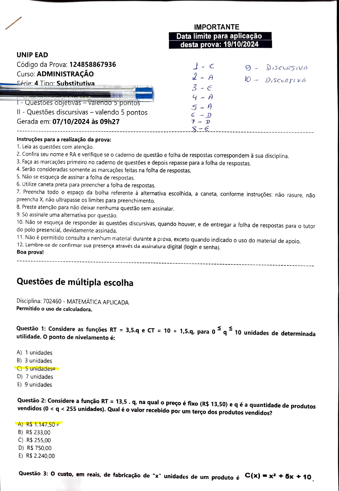UNIP EAD Código da Prova: 124858867936 Curso: ADMINISTRAÇÃO Série 4 Tipo: Substitutiva T- Questoes objetivas - vatendo5 pontoS || - Questões discursivas - valendo 5 pontos Gerada em: 07/10/2024 às 09h27 Instruções para a realização da prova: 1. Leia as questões com atenção. 4. Serão consideradas somente as marcações feitas na folha de respostas. 5. Não se esqueça de assinar a folha de respostas. 6. Utilize caneta preta para preencher a folha de respostas. 2. Confira seu nome e RA e verifique se o caderno de questão e folha de respostas correspondem à sua disciplina. 3. Faça as marcações primeiro no caderno de questões e depois repasse para a folha de respostas. 8. Preste atenção para não deixar nenhuma questão sem assinalar. 9. Só assinale uma alternativa por questão. Boa prova! 7. Preencha todo o espaço da bolha referente à alternativa escolhida, a caneta, conforme instruções: não rasure, não preencha X, não ultrapasse os limites para preenchimento. Questões de múltipla escolha Disciplina: 702460 - MATEMÁTICA APLICADA Permitido o uso de calculadora. 10. Não se esqueça de responder às questões discursivas, quando houver, e de entregar a folha de respostas para o tutor do polo presencial, devidamente assinada. A) 1 unidades 11. Não é permitido consulta a nenhum material durante a piova, exceto quando indicado o uso do material de apoio. 12. Lembre-se de confirmar sua presença através da assinatura digital (login e senha). B) 3 unidades C) 5 unidadese D) 7 unidades IMPORTANTE Data limite para aplicação desta prova: 19/10/2024 Questão 1: Considere as funções RT = 3,5.q e CT = 10 + 1,5.g, para 0 utilidade. O ponto de nivelamento é: E) 9 unidades 2- A A) R$ 1.147,50 3 - E 4- A B) R$ 233,00 7- D C) R$ 255,00 D) R$ 750,00 E) R$ 2.240,00 DiscUR51VA Questão 2: Considere a função RT = 13,5. q, na qual o preço é fixo (R$ 13,50) e q é a quantidade de produtos vendidos (0