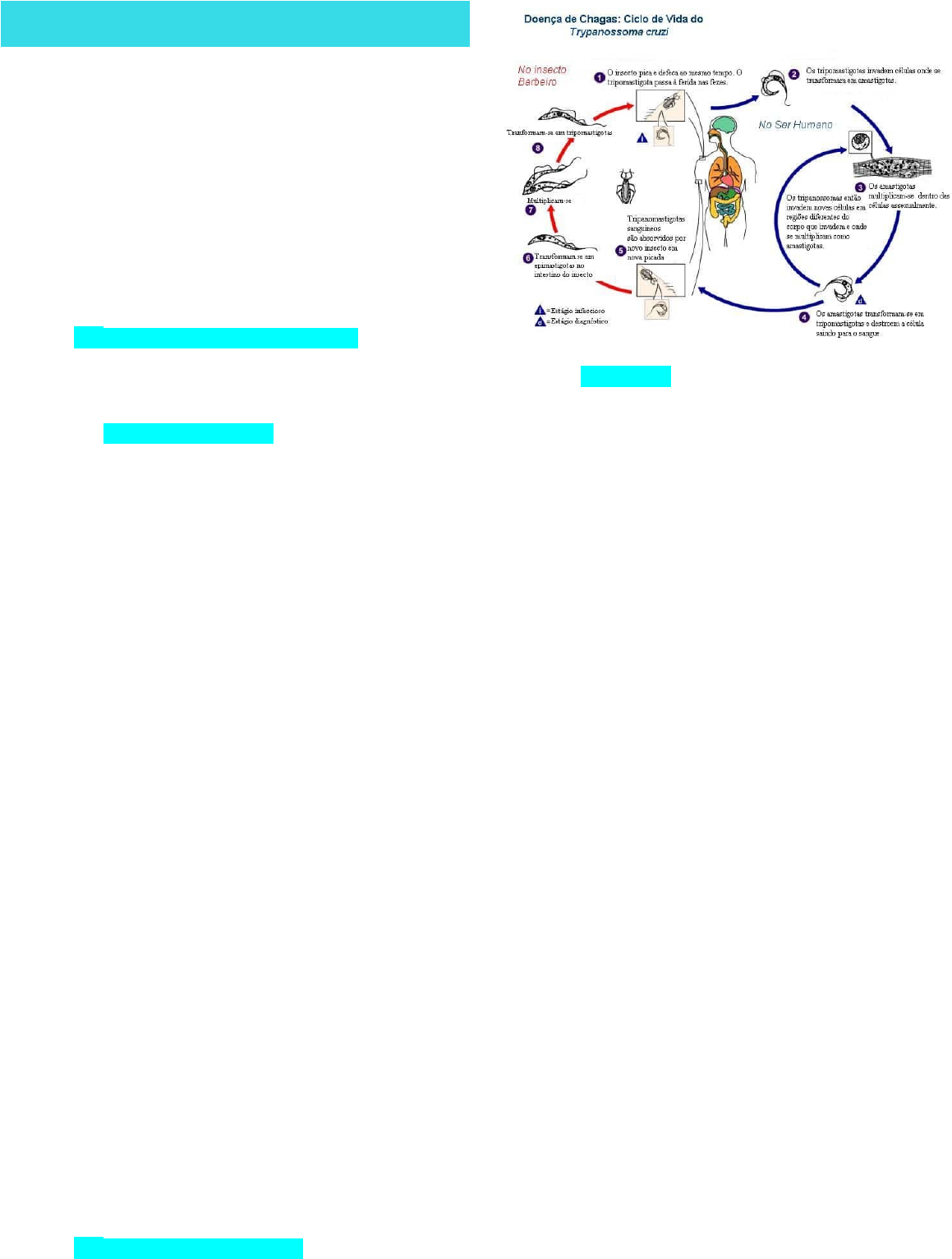 Doença de Chagas Objetivos: 1- Conhecer as principais doenças causadas por protozoários; 2- Conhecer os dados epidemiológicos da doença de Chagas, ciclo biológico, vetor e formas de transmissão. 3- Compreender a fisiopatologia, sinais, sintomas. 4- Compreender a propedêutica da doença de chagas. 5- Conhecer a situação da saúde indígena; · Doenças causadas por protozoários Toxoplasmose, leishmaniose, tricomoníase, doença de chagas, giardíase, amebíase, malária. · Dados epidemiológicos da doença de Chagas - A doença de Chagas é endêmica em 21 países na América Latina; - Afeta cerca de 6 a 7 milhões de pessoas, das quais menos de um por cento recebem tratamento adequado; - Segundo a OMS, a incidência anual é de 30.000 novos casos nas Américas, com aproximadamente 10.000 óbitos/ano resultantes de danos irreversíveis no coração e no trato digestivo; - Cerca de 65 milhões de pessoas vivem em áreas de risco; - Apesar de não haver dados sistemáticos sobre a prevalência da doença no Brasil, estudos recentes estimam de 1,0 a 2,4% da população, o equivalente a 1,9 a 4,6 milhões de pessoas infectadas pelo T. cruzi, com elevada mortalidade, representando a DC uma das quatro principais causas de mortes por doenças infecciosas e parasitárias; - O SINAN, entre os anos de 2012 e 2016, registrou cerca de 1.190 casos de DC aguda, com incidência média anual de 0,1 caso/100 mil habitantes, sendo as maiores taxas observadas nos estados do Pará, com 2,9/100 mil habitantes, e do Amapá́, com 1,5 caso/100 mil habitantes. - A região Norte apresentou a maior taxa de casos novos no país (97,1%). Entre os casos confirmados no SINAN, foram registrados 18 óbitos por DC aguda nesse período. - As formas ainda possíveis de transmissão no Brasil são orais (72%) e vetorial (9%); em 18% dos casos novos, não se identificou a forma de transmissão. · Ciclo biológico do barbeiro - Tipos de transmissão: * Vetorial (contato com fezes ou urina de triatomíneos hematófagos infectados. Após a picada dos triatomíneos formas tripomastigotas metacíclicas do T. cruzi liberadas nas fezes e na urina do inseto penetram ativamente em células do hospedeiro, através da conjuntiva, mucosa oral e soluções de continuidade na pele. Formas tripomastigotas sanguíneas também penetram ativamente em células do hospedeiro nos casos de transmissão por transfusão sanguínea, congênita ou por acidentes de laboratório); * Sangue e derivados (através da transfusão de sangue); * Congênita (após o terceiro mês de gestação); * Oral (ingestão de alimentos e bebidas contaminados – caldos de cana e açaí); * Outras vias (transmissão acidental – laboratórios, centros cirúrgicos – transplante de órgãos, ingestão de leite materno, coito. Na transmissão por transplante, ocorre reativação da infecção, pelo favorecimento da multiplicação de parasitos e sua liberação no sangue pela imunossupressão induzida por medicamentos para evitar rejeição do enxerto); - Caminhos e eventos: após a penetração na pele ou conjunta ou através da via intravenosa, nas fases agudas e crônica da infecção. Após a infecção, a adesão e a penetração do parasito nas células do hospedeiro ocorrem por meio de: (1) os parasitos contêm na membrana lectinas capazes de se ligar a resíduos de açúcar existentes na membrana da célula hospedeira; (2) o sistema proteolítico do hospedeiro ativa moléculas na superfície parasitária, favorecendo maior adesão; (3) células do hospedeiro contêm glicoproteínas que atuam como ligantes de lectinas na membrana do parasito; (4) o ácido siálico na superfície de células do hospedeiro têm papel importante na internalização do parasito. Ocorrida a penetração das formas infectantes, tripomastigotas metacíclicas ou sanguíneas transformam-se no interior das células do hospedeiro em formas amastigotas, que se multiplicam por divisão binária. A partir daí, dois eventos podem ocorrer: (a) a célula hospedeira e os parasitos degeneram e morrem; (b) o ciclo do parasito se completa, a célula se rompe e as três formas, tripomastigota sanguínea, epimastigota e amastigota, são liberadas. Pela via venosa, o T. cruzi pode seguir três caminhos: (1) passar ativamente através dos espaços interendoteliais e parasitar células adjacentes; (2) parasitar o endotélio venular, multiplicando-se e liberando novos parasitos, que se instalam em diferentes tecidos; (3) chegar ao coração direito e daí aos pulmões, onde pode instalar-se ou ser levado ao coração esquerdo, de onde atinge a circulação sistêmica. A partir desta, o parasito pode chegar a diversos órgãos, por passagem ativa ou através de vasos fenestrados do baço, de vênulas pós-capilares de linfonodos ou do parasitismo do endotélio e/ou das células musculares lisas. As células mais parasitadas são macrófagos residentes, fibroblastos, células musculares lisas e estriadas, células de Schwann do sistema nervoso periférico e micróglia do sistema nervoso central. Coração, trato digestivo e sistema nervoso são as sedes mais frequentes e importantes de infecção, o que resulta em miocardite, miosite, neurite e encefalite. · Fisiopatologia da doença de Chagas A sua evolução compreende as fases aguda e crônica. Após período de incubação que varia de 4 a 10 dias nos casos de transmissão vetorial e de 20 a 40 dias ou mais na contaminação por transfusão de sangue, surge a fase aguda. - Fase aguda: esta pode ser sintomática (casos clássicos, detectados sobretudo em crianças ou pacientes imunossuprimidos) ou, o que é muito mais comum, assintomática (que ocorre em todas as idades). Fase aguda não tratada dura em torno de 10 a 60 dias. * Sintomática (parasitemia elevada, intenso parasitismo tecidual, manifestações toxemia, processo inflamatório intenso); * Assintomática (sem sintomas); - Fase crônica: com o passar dos dias ou das semanas, a sin