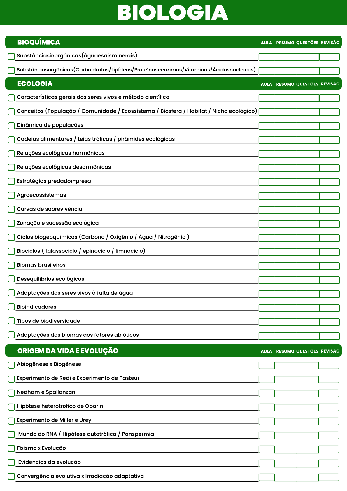 BIOLOGIA Características gerais dos seres vivos e método científico Conceitos (População / Comunidade / Ecossistema / Biosfera / Habitat / Nicho ecológico) Dinâmica de populações Cadeias alimentares / teias tróficas / pirâmides ecológicas Relações ecológicas harmônicas Relações ecológicas desarmônicas Estratégias predador-presaEstratégias predador-presa Agroecossistemas Curvas de sobrevivência Zonação e sucessão ecológica Ciclos biogeoquímicos (Carbono / Oxigênio / Água / Nitrogênio ) Biociclos ( talassociclo / epinociclo / limnociclo) Biomas brasileiros Desequilíbrios ecológicosDesequilíbrios ecológicos Adaptações dos seres vivos à falta de água Bioindicadores Tipos de biodiversidade Adaptações dos biomas aos fatores abióticos ECOLOGIA AULA RESUMO QUESTÕESREVISÃO Substânciasinorgânicas(águaesaisminerais) Substânciasorgânicas(Carboidratos/Lipídeos/Proteínaseenzimas/Vitaminas/Ácidosnucleicos) BIOQUÍMICA AULA RESUMO QUESTÕESREVISÃO Abiogênese x Biogênese Experimento de Redi e Experimento de Pasteur Nedham e Spallanzani Hipótese heterotrófico de Oparin Experimento de Miller e Urey Mundo do RNA / Hipótese autotrófica / Panspermia Fixismo x EvoluçãoFixismo x Evolução Evidências da evolução Convergência evolutiva x Irradiação adaptativa ORIGEM DA VIDA E EVOLUÇÃO AULA RESUMO QUESTÕESREVISÃO Tipos de células Membrana plasmática (propriedades / transporte em membrana / especializações) Citoplasma: organelas e estruturas Teoria endossimbiótica Evolução das estruturas celulares Respiração celular aeróbica (glicólise / ciclo de Krebs / fosforilação oxidativa) Respiração celular anaeróbicaRespiração celular anaeróbica Fermentação ( lática / alcoólica / acética ) Fotossíntese (definição / etapas) Quimiossíntese Síntese de proteínas e expressão gênica (replicação semiconservativa do DNA / transcrição / tradução) Ciclo celular (Intérfase / Mitose / Meiose ) Mitose animal x Mitose vegetalMitose animal x Mitose vegetal Gametogênese (espermatogênese e ovogênese) CITOLOGIA AULA RESUMO QUESTÕESREVISÃO Tecido epitelial (de revestimento e de secreção) Pele dos mamíferos Tecidos conjuntivos: Conjuntivo propriamente dito / Conjuntivo adiposo / Conjuntivo cartilaginoso / Conjuntivo ósseo / Conjuntivo hematopoiético / Conjuntivo sanguíneo Gordura branca x Gordura marrom Tecido muscular Tecido nervosoTecido nervoso HISTOLOGIA AULA RESUMO QUESTÕESREVISÃO Embriogênese do anfioxo (fases) Tipos de gêmeos Classificação dos animais: Protostômios x Deuterostômios / Diblásticos x Triblásticos Acelomados x Pseudocelomados x Celomados Destino dos folhetos embrionários Anexos embrionários Tipos de ovos e de segmentaçãoTipos de ovos e de segmentação EMBRIOLOGIA AULA RESUMO QUESTÕESREVISÃO Teorias evolutivas (Lamarck / Darwin / Neodarwinismo) Especiação (Anagênese e Cladogênese / Simpátrica x Alopátrica x Parapátrica ) Hipótese de Gaia / Efeito do fundador / Mecanismo de isolamento reprodutivo Classificação dos seres vivos e taxonomia Classificação filogenética (grupos monofiléticos, parafiléticos e polifiléticos) Vírus e viroses Reino Monera (Bactéricas / Arqueas / Cianobactéricas) Reino Fungi Reino Protista (Algas e protozoários) ProtozoosesProtozooses Reino animália: Poríferos / Cnidários / Platelmintos / Nematelmintos / Moluscos / Anelídeos / Artrópodes / Equinodermos / Cordados Verminoses provocadas por asquelmintos Cordados: Protocordados e vertebrados Vertebrados: Ciclostomos / Condrictes / Osteíctes / Anfíbios / Répteis / Aves / Mamíferos Digestão das aves e digestão dos ruminantesDigestão das aves e digestão dos ruminantes Fisiologia comparada dos enterozoários Evolução dos seres vivos SERES VIVOS AULA RESUMO QUESTÕESREVISÃO Sistema digestório Doenças e distúrbios alimentares: Marasmo / Bulimia / Anorexia / Vigorexia / Ortorexia / Dietas (cetogênica / restrição calórica) / Hormônios (grelina / PYY / Leptina) Controle glicêmico: Glicólise / Glicogênese / Glicogenólise... Sistema respiratório Sistema circulatório Sistema circulatório dos vertebradosSistema circulatório dos vertebrados Sistema imunológico e sistema linfático Tipos de imunização Sistema excretor Tipos de excretas nitrogenadas e classificação de animais Sistema nervoso Orgãos dos sentidos Sistema endócrinoSistema endócrino Sistema reprodutor: masculino e feminino Métodos contraceptivos FISIOLOGIA HUMANA AULA RESUMO QUESTÕESREVISÃO Conceitos Primeira lei de Mendel Casos específicos da primeira lei de Mendel (ausência de dominância e codominância / genes letais) Heredogramas Cruzamento-teste ou retrocruzamento Polialelia: Sistema ABO Eritroblastose fetalEritroblastose fetal Sistema Rh / Sistema MN Efeito Bombaim Genética do sexo (herança restrita ao sexo / herança ligada ao sexo / herança influenciada pelo sexo) Cromatina sexual Sistemas de determinação do sexo Segunda lei de mendel e LinkageSegunda lei de mendel e Linkage Expressividade e penetrância Interação gênica (genes complementares / epistasia / herança quantitativa e distribuição binomial) Pleiotropia Genética de populações: Populações instáveis e populações estáveis (equilíbro de Hardy-Weinberg) Mutações: Estruturais e numéricas Engenharia genética: Clonagem / DNA Fingerprint / Organismos geneticamenteEngenharia genética: Clonagem / DNA Fingerprint / Organismos geneticamente modificados / DNA recombinante / Enzimas de restrição GENÉTICA AULA RESUMO QUESTÕESREVISÃO Reino Plantae : Ciclos reprodutivos (diplobionte / haplobionte / haplodiplobionte) Briófitas / Pteridófitas / Gimnospermas / Angiospermas Evolução de plantas Tipos de polinização Morfologia externa das plantas (Raíz / Caule / Folha ) Histologia vegetal: Tecidos meristemáticos / tecidos de revestimento / tecidos de transporte / tecidos parenquimáticos / tecidos de sustentaçãotransporte / 