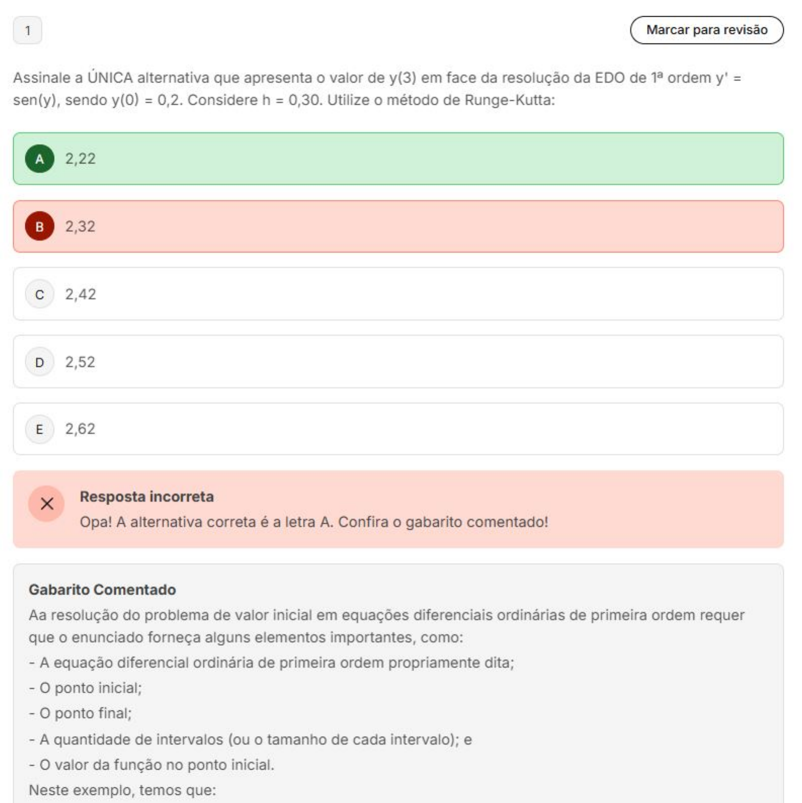 1 Marcar para revisão Assinale a ÚNICA alternativa que apresenta o valor de y(3) em face da resolução da EDO de ordem y' = sen(y), sendo y(0) = 0,2. Considere h = 0,30. Utilize o método de Runge-Kutta: A 2,22 B 2,32 C 2,42 D 2,52 E 2,62 X Resposta incorreta A alternativa correta é a letra A. Confira o gabarito comentado! Gabarito Comentado Aa resolução do problema de valor inicial em equações diferenciais ordinárias de primeira ordem requer que o enunciado forneça alguns elementos importantes, como: - A equação diferencial ordinária de primeira ordem propriamente dita; - ponto inicial; - ponto final; - A quantidade de intervalos (ou o tamanho de cada intervalo); e - valor da função no ponto Neste exemplo, temos que:- A equação diferencial ordinária de primeira ordem propriamente dita ( - ponto inicial é 0; - ponto final é 3; - tamanho de cada intervalo é 0,3; e - valor da função no ponto inicial é 0,2. Isso posto, utilize o método indicado a seguir: from future import division import as np from numpy import linalg import pyplot na en Python para o de Runge Kutta # Definição equação diferencial de primeira ordem. def return o valor de dado um intervalo Considera valores como x0 h) Conta- gem do número de iterações utilizando o tamanho do passo Representado pelo h - € da iteração para un determinado número pré- determinado y = for i in range (1, "Aplica- ção das de Runge Kutta para encontrar valor seguinte d e - h k2 - h 0.5 h, y kl) k3 - h - dydx + h, y + k2) = h dydx (x0 - h, y + k3) Atualização do valor de y - y + / + k2 2 k3 + Atualização do valor seguinte de - return y principal x0 - y - - 3 h = print (rungeKutta (x0, Executando o código indicado, você obterá a resposta 2.22.2 Marcar para revisão Assinale a ÚNICA alternativa que apresenta o valor de y(3) em face da resolução da EDO de ordem y' = cos(y) + sen(y), sendo Considere h = 0,30. Utilize o método de Runge-Kutta: A 2,309 B 2,409 C 2,509 D 2,609 E 2,709 Resposta correta Parabéns, você selecionou a alternativa correta. Confira o gabarito comentado! Gabarito Comentado A resolução do problema de valor inicial em equações diferenciais ordinárias de primeira ordem requer que o enunciado forneça alguns elementos importantes, como: - A equação diferencial ordinária de primeira ordem propriamente dita; - ponto inicial; - ponto final; - A quantidade de intervalos (ou o tamanho de cada intervalo); e - valor da função no ponto inicial. Neste exemplo, temos que:- A equação diferencial ordinária de primeira ordem propriamente dita é y' = - o ponto inicial é 0; - ponto final é 3; tamanho de cada intervalo é 0,3; e - valor da função no ponto inicial é 0,3. Isso posto, utilize o método indicado a seguir: from future import division import numpy np from import import matplotlib pyplot plt Programa en para implementar o de Runge Definição da equação diferencial ordinária de primeira ordem. def dydx return Encontra o valor de dado utilizando un intervalo Considera os valores iniciais como e rungeKutta h) : Conta- do de iterações utilizando o tamanho passo Representado pelo h = Realização da iteração para um determinado número pré- determinado for 1 in range + 1) : "Aplica- ção das formulas de Runge para encontrar o valor seguinte e y" kl - h y) - - dydx + 0.5 - y k3 - h - dydx + 0.5 - h, y k2) k4 = h dydx + h, y + k3) # Atualização valor seguinte de y * + 2 + Acualização do valor de x0 = x0 + h return y Programa principal x0 o y - h print y, x, Executando o código indicado, você obterá a resposta 2.3083 Marcar para revisão Assinale a ÚNICA alternativa que apresenta o valor de y(1) em face da resolução da EDO de ordem sendo y(0) = 3. Considere h = 0,10. Utilize método de Runge-Kutta: A 22,167 B 22,367 C 22,567 D 22,757 E 22,957 Resposta correta Parabéns, você selecionou a alternativa correta. Confira o gabarito comentado! Gabarito Comentado A Como vimos neste tema, a resolução do problema de valor inicial em equações diferenciais ordinárias de primeira ordem requer que o enunciado forneça alguns elementos importantes, como: - A equação diferencial ordinária de primeira ordem propriamente dita; - ponto inicial; - ponto final; - A quantidade de intervalos (ou o tamanho de cada intervalo); e - valor da função no ponto inicial. Neste exemplo, temos que:- A equação diferencial ordinária de primeira ordem propriamente dita é y' = 2y; - ponto inicial é - ponto final é 1; - tamanho de cada intervalo é 0,1; e - valor da função no ponto inicial é 3. Isso posto, utilize o método indicado a seguir: from future division import numpy np numpy import import plt + Programa em para implementar o método de Runge + Definição da equação diferencial de primeira def dydx (x, : return # Encentra o valor de dado utilizando un intervalo h Considera valores iniciais como x0 y0. h) : # Conta- gen do número de iterações utilizando tamanho do passo Representado pelo h n - - # Realização iteração para um determinado número pré- determinado y for i in range + 1) : "Aplica- ção formulas de Runge para encontrar o valor e kl = h dydx y) - h - dydx + 0.5 h, + 0.5 - k3 - h dydx (x0 + 0.5 h, y + 0.5 + k4 - h dydx + h, y + Atualização do valor de y + + 2 k3 + k4) Atualização do valor seguinte de - + b return y + Programa principal x0 - y = 3 print (rungeKutta y, Executando o código indicado, você obterá a resposta 22.16.4 Marcar para revisão Assinale a ÚNICA alternativa que apresenta o valor de y(0,4) em face da resolução da EDO de ordem = sendo y(0) = 3. Considere h = 0,1. Utilize o método de Euler: A 15,348 B 15,448 C 15,548 D 15,648 E 15,748 Resposta incorreta Opa! A alternativa correta é a letra A. Confira o gabarito comentado! Gabarito Comentado Como vimos neste tema, a resolução do problema de valor inicial em equações diferenciais ordinárias de primeira ordem requer que enunciado forneça alguns elementos importantes, 