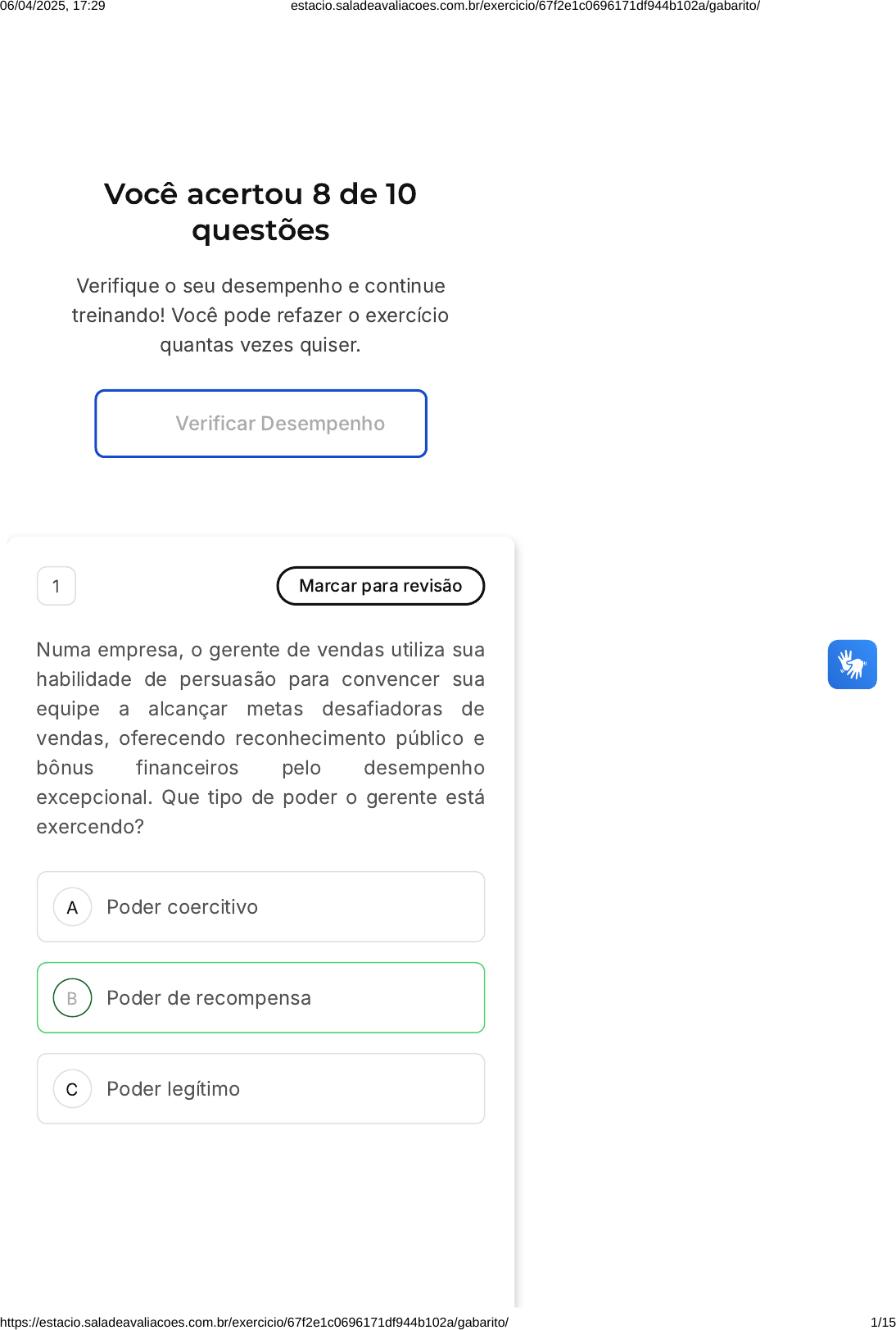 Você acertou 8 de 10 questões Verifique o seu desempenho e continue treinando! Você pode refazer o exercício quantas vezes quiser. Verificar Desempenho A B C 1 Marcar para revisão Numa empresa, o gerente de vendas utiliza sua habilidade de persuasão para convencer sua equipe a alcançar metas desafiadoras de vendas, oferecendo reconhecimento público e bônus financeiros pelo desempenho excepcional. Que tipo de poder o gerente está exercendo? Poder coercitivo Poder de recompensa Poder legítimo 06/04/2025, 17:29 estacio.saladeavaliacoes.com.br/exercicio/67f2e1c0696171df944b102a/gabarito/ https://estacio.saladeavaliacoes.com.br/exercicio/67f2e1c0696171df944b102a/gabarito/ 1/15 D E A B Poder especialista Poder de referência Resposta correta Parabéns, você selecionou a alternativa correta. Confira o gabarito comentado! Gabarito Comentado O gerente está exercendo poder de recompensa ao oferecer incentivos e benefícios para influenciar o comportamento de sua equipe. 2 Marcar para revisão Paul Hersey e Kenneth Blanchard desenvolveram um modelo de liderança contingencial baseado na situação em causa. Segundo os autores, o estilo de liderança depende mais da situação do que da personalidade do líder. Os autores determinam ainda que existem 4 estilos de liderança. Nesse sentido, quando existem baixas relações entre os liderados e tarefas a se realizarem, é necessário que o líder: Explique a tarefa. Venda a ideia. 06/04/2025, 17:29 estacio.saladeavaliacoes.com.br/exercicio/67f2e1c0696171df944b102a/gabarito/ https://estacio.saladeavaliacoes.com.br/exercicio/67f2e1c0696171df944b102a/gabarito/ 2/15 C D E Apoie os liderados. Participe da tarefa. Delegue funções. Resposta correta Parabéns, você selecionou a alternativa correta. Confira o gabarito comentado! Gabarito Comentado Nessa situação, o líder deve delegar funções, atribuindo responsabilidades aos seus liderados. Isso estimula o comprometimento deles com a tarefa, permitindo que o líder possa focar em novos projetos. Além disso, essa ação incentiva o desenvolvimento do potencial dos subordinados, pois eles terão a oportunidade de assumir responsabilidades e demonstrar suas habilidades e competências. 3 Marcar para revisão Diversos autores escreveram infindáveis obras sobre Liderança. Warren Bennis argumenta que ela é como a beleza: difícil de definir, mas fácil de reconhecer. Muito embora a discussão sobre o assunto seja objeto de estudo de muitos pesquisadores, algumas características, no entanto, são comuns aos líderes, são elas: 06/04/2025, 17:29 estacio.saladeavaliacoes.com.br/exercicio/67f2e1c0696171df944b102a/gabarito/ https://estacio.saladeavaliacoes.com.br/exercicio/67f2e1c0696171df944b102a/gabarito/ 3/15 A B C D E I- Cabe aos líderes desenvolver a humildade e aprender continuamente; II- Líderes não questionam o procedimento, apenas aplicam normas e regras; III- A liderança requer comunicação, planejamento e flexibilidade; IV- Bons líderes são paternalistas com sua equipe; V- Os líderes devem inspirar em sua equipe uma visão compartilhada. Os itens I, II e V estão corretos. Os itens II, III e IV estão corretos. Os itens I, III e IV estão corretos. Os itens I, III, V estão corretos. Os itens I, II e IV estão corretos. Resposta incorreta Opa! A alternativa correta é a letra D. Confira o gabarito comentado! Gabarito Comentado Os itens corretos são I, III e V. O item I afirma que os líderes devem desenvolver a humildade e aprender continuamente, o que é uma característica essencial para a liderança eficaz, pois permite que eles se adaptem e evoluam com as mudanças. O item III destaca a necessidade de comunicação, planejamento e flexibilidade na liderança, características fundamentais para lidar com diferentes situações e 06/04/2025, 17:29 estacio.saladeavaliacoes.com.br/exercicio/67f2e1c0696171df944b102a/gabarito/ https://estacio.saladeavaliacoes.com.br/exercicio/67f2e1c0696171df944b102a/gabarito/ 4/15 A B C pessoas. Por fim, o item V ressalta a importância dos líderes inspirarem uma visão compartilhada em sua equipe, o que é crucial para alinhar os esforços de todos em direção a um objetivo comum. Os itens II e IV não estão corretos, pois líderes eficazes questionam e adaptam procedimentos quando necessário (II) e, embora possam cuidar de suas equipes, não são necessariamente paternalistas (IV). 4 Marcar para revisão João é um gerente de vendas que busca aprimorar suas habilidades de liderança. Ele está participando de um programa de desenvolvimento profissional que enfatiza a importância do feedback. Durante uma sessão de feedback com sua equipe de vendas, João recebe críticas construtivas sobre sua abordagem de liderança. Qual das seguintes ações de João reflete a aplicação eficaz do feedback recebido? Ignorar as críticas e continuar com suas práticas de liderança existentes Rejeitar o feedback, alegando que sua equipe não compreende completamente seus desafios Refletir sobre as críticas recebidas e identificar áreas específicas para melhoria 06/04/2025, 17:29 estacio.saladeavaliacoes.com.br/exercicio/67f2e1c0696171df944b102a/gabarito/ https://estacio.saladeavaliacoes.com.br/exercicio/67f2e1c0696171df944b102a/gabarito/ 5/15 D E A B Adotar uma postura defensiva e confrontar sua equipe sobre as críticas recebidas Agradecer ao feedback, mas não fazer mudanças em sua abordagem de liderança Resposta correta Parabéns, você selecionou a alternativa correta. Confira o gabarito comentado! Gabarito Comentado João está demonstrando uma abordagem madura ao feedback, ao refletir sobre as críticas recebidas e identificar áreas específicas em que ele pode melhorar suas habilidades de liderança. 5 Marcar para revisão Em uma empresa de marketing digital, uma gerente de conta decide delegar responsabilidades adicionais a membros da equipe para promover o desenvolvimento profissional. Qual o impacto esperado dessa estratégia? Redu