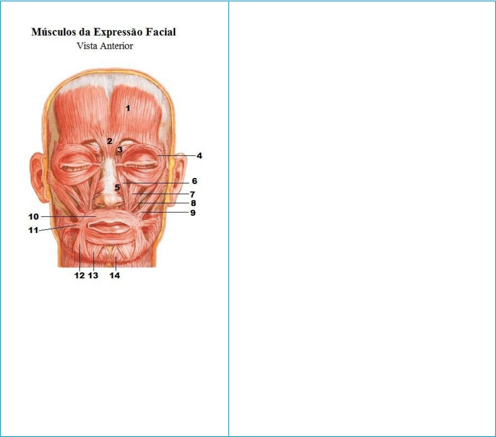 Alumna: Florencia Toloza REVISÃO MUSCULAR Título da Unidade de Aprendizagem: Musculatura do corpo humano. Docente: Maurícia Cristina de Lima. Objetivos de aprendizagem da Unidade: Ao final desta unidade você deve apresentar os seguintes aprendizados: 1. Identificar os principais músculos (superficiais) da cabeça, pescoço, tronco, membro superior e inferior. Atividades: Com o auxílio do vídeo e do Atlas anatômico, identificar os principais músculos da cabeça, pescoço, tronco, membros superiores e inferiores. 1 – M. Occipitofrontal 2 – M. Prócer 3 - M. Corrugador dos supercílios 4 – M. Orbicular do olho 5 – M. Nasal 6 – M. Levantador do lábio superior e da asa do nariz 7 – M. Levantador de lábio superior 8 – M. Zigomático menor 9 – M. Zigomático Mayor 10 - M. Orbicular da boca 11 – M. Risório 12 – M. Abaixador do ângulo da boca 13 – M. abaixador do lábio inferior 14 – M. Mentual 1 – M. Auricular superior 2 – M. Epicrânio (frontal e occipital) 3 -M. Bucinador 4 -M. Platisma Identifique apenas os músculos dos números abaixo: 5. M. Esternocleidomastoideo. 8. M. Escaleno anterior 9. M. Trapézio 1 – M. Peitoral Maior 2 - M. intercostais 3 – M. Peitoral Menor 4 - M. Serrátil anterior 5 – M. Reto do abdome 6 - M. Obliquo externo do abdome 7 - M. Intercostais 1 - M. Peitoral Maior 2 – M. Serrátil anterior 3 - M. Obliquo externo do abdome 1 – M. Serrátil anterior 2 – M. Obliquo interno do abdome 3 - M. Reto Abdominal Identifique apenas os músculos dos números abaixo: 1 - M. Coracobraquial 2 – M. Biceps Braquial 3-M. Deltoide 4-M. Peitoral Maior 1 - M. Supraespinhal 2 - M. Infraespinal 3 - M. Redondo menor 4 – M. Redondo Maior 5 – M. Deltoide 6 – M. Tríceps (cabeça lateral) 1 – M. Braquiorradial 2 – M. Pronador redondo 3 – M. Flexor radial do carpo 4 – M. Palmar longo 5 – M. Flexor ulnar do carpo 6 - M. Flexor superficial dos dedos 1 - M. Flexor ulnar do carpo 2 – M. Extensor ulnar do carpo 3 – M. Extensor do dedo mínimo 4 – M. Braquiorradial 5 – M. Extensor radial longo do carpo 6 – M. Ancôneo 7 – M. Extensor radial curto do carpo 8 – M. Extensor dos dedos 9 – M. Abdutor longo do polegar 10 – M. Extensor curto do polegar 1 – M. Tensor da fáscia lata 2 – M. Sartorio 3 – M. Reto da coxa 4 – M Vasto lateral 5 – M. Iliopsoas 6 – M. Pectíneo 7 -M. Adutor longo 8 -M. Grácil 9 – M. Vasto medial 1 - M. Glúteo médio 2 - M. Glúteo Máximo 3 – M. Bíceps da coxa 4 – M. Grácil 5 - M. Adutor magno 6 – M. Semitendineo 7 – M. Semimembranáceo 1 - M. Glúteo Médio 2-M. Glúteo mínimo 3 – M. Glúteo Máximo 4 – M. Quadrado da coxa 5 – M. Piriforme 6 – M. Gêmeo Superior 7 – M. Obturador interno 8 – M. Gêmeo inferior 1 - M. Fibular longo 2-M. Tibial anterior 3 – M. Extensor longo dos dedos 4 – M. Fibular curto 5 – M. Extensor longo do Hálux 1 – M. Gastrocnêmio 2 – M. Gastrocnêmio 3 – M. Soleo 4 – Tendão do calcâneo (Aquiles) Sinopse do Conteúdo da unidade- SISTEMA MUSCULAR Principais Músculos Esqueléticos Embora os ossos forneçam as alavancas e formem o arcabouço do corpo, eles não podem por si mesmos, mover as partes do corpo. O movimento resulta da contração e do relaxamento alternados dos músculos, que representam 40 a 50% do peso corporal total. A força muscular reflete a função primária do músculo – modificar a energia química em energia mecânica, para gerar força, realizar trabalho e produzir movimento. Existem três tipos de tecido muscular: estriado esquelético, estriado cardíaco e liso. Embora esses três tipos de tecido muscular partilhem algumas de suas propriedades, eles diferem, uns dos outros, em sua anatomia, localização e controle. Sobre o sistema muscular, apresentam as seguintes funções: I. O tecido muscular apresenta quatro propriedades especiais: a excitabilidade elétrica, a propriedade de responder a estímulos por potenciais de ação; a contratilidade, a capacidade de se contrair com bastante força; extensibilidade, capacidade de ser estirado e a elasticidade, que é a capacidade do tecido que retornar ao comprimento original. II. Uma das funções dos músculos é a produção de calor. Grande parte desse calor, liberado pelo músculo, é usado na manutenção da temperatura corpórea. III. Os tecidos conjuntivos que revestem o músculo são o epimísio, circundando todo o músculo, o perimísio, circundando os fascículos, e o endomísio, circundando as fibras musculares. Os tendões e as aponeuroses são extensões do tecido conjuntivo, para além das fibras musculares, que prendem os músculos aos ossos ou a outros músculos Os músculos da expressão facial, quando se contraem, movem a pele em vez de uma articulação, permitindo que expressemos uma ampla variedade de emoções. Os músculos extrínsecos, que movimentam os bulbos dos olhos, estão entre os músculos esqueléticos de contração mais rápida e precisamente controlados no corpo. Permitem elevar, abaixar, abduzir, aduzir e girar medial e lateralmente os bulbos dos olhos. Os músculos que movimentam a mandíbula também são conhecidos como músculos da mastigação, porque estão envolvidos na trituração dos alimentos. Os músculos extrínsecos que movimentam a língua são importantes na mastigação, deglutição e fala. Os músculos do assoalho do trígono cervical anterior, chamados de músculos supra-hióideos, estão localizados acima do hioide. Eles elevam o hioide, a cavidade oral e a língua durante a deglutição. Os músculos que movimentam a cabeça alteram sua posição e ajudam a equilibrá-la sobre a coluna vertebral. Os músculos que atuam na parede do abdome ajudam a conter e a proteger as vísceras abdominais, movimentam a coluna vertebral, comprimem o abdome e produzem a força necessária para a defecação, micção, vômito e parto. Os músculos usados na respiração alteram o tamanho da cavidade torác