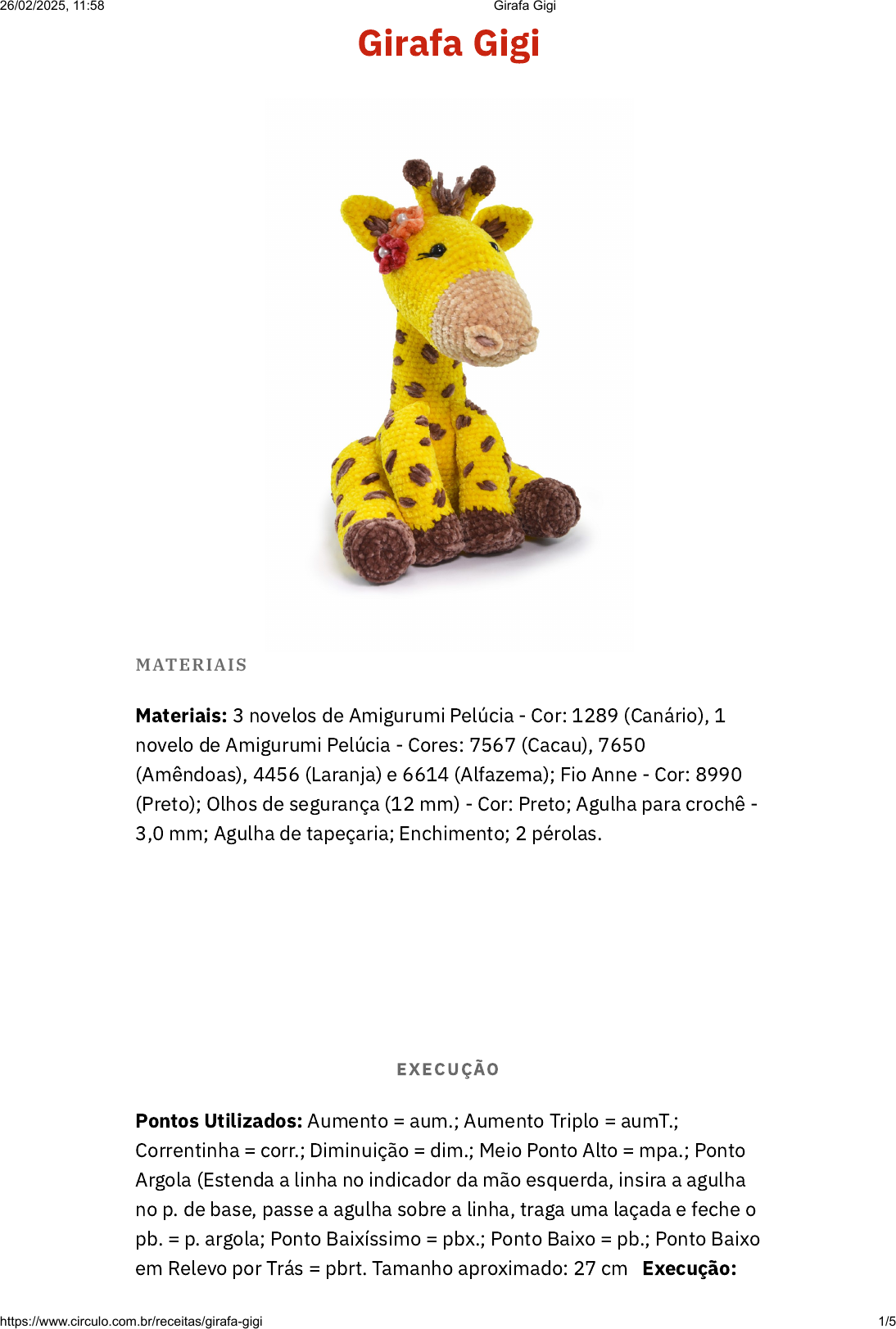 Girafa Gigi EXECUÇÃO Pontos Utilizados: Aumento = aum.; Aumento Triplo = aumT.; Correntinha = corr.; Diminuição = dim.; Meio Ponto Alto = mpa.; Ponto Argola (Estenda a linha no indicador da mão esquerda, insira a agulha no p. de base, passe a agulha sobre a linha, traga uma laçada e feche o pb. = p. argola; Ponto Baixíssimo = pbx.; Ponto Baixo = pb.; Ponto Baixo em Relevo por Trás = pbrt. Tamanho aproximado: 27 cm Execução: MATERIAIS Materiais: 3 novelos de Amigurumi Pelúcia - Cor: 1289 (Canário), 1 novelo de Amigurumi Pelúcia - Cores: 7567 (Cacau), 7650 (Amêndoas), 4456 (Laranja) e 6614 (Alfazema); Fio Anne - Cor: 8990 (Preto); Olhos de segurança (12 mm) - Cor: Preto; Agulha para crochê - 3,0 mm; Agulha de tapeçaria; Enchimento; 2 pérolas. 26/02/2025, 11:58 Girafa Gigi https://www.circulo.com.br/receitas/girafa-gigi 1/5 Cabeça Comece com o fio 7650 Faça 6 corr. 1ª carr.: pule 1 corr., 1 aum., 3 pb., 1 aumT. na última corr., 4 pb. no outro lado das corr. = 12 pb.; 2ª carr.: 2 aum., 3 pb., 3 aum., 3 pb., 1 aum. = 18 pb.; 3ª carr.: 2 pb., 1 aum. = 24 pb.; 4ª carr.: 3 pb., 1 aum. = 30 pb.; 5ª carr.: 4 pb., 1 aum. = 36 pb.; 6ª e 7ª carr.: 36 pb.; 8ª carr.: 5 pb., 1 aum. = 42 pb.; 9ª e 10ª carr.: 42 pb. Troque para o fio 1289 11ª e 12ª carr.: 42 pb.; 13ª carr.: 10 pb., 10 aum., 10 pb., (1 dim., 1 pb.) 4x = 48 pb.; 14ª carr.: 48 pb.; 15ª carr.: 8 pb., 3 aum., 20 pb., 3 aum., 14 pb. = 54 pb.; 16ª carr.: 54 pb.; 17ª carr.: 10 pb., 3 aum., 20 pb., 3 aum., 18 pb. = 60 pb.; 18ª à 20ª carr. (3 carreiras): 60 pb.; 21ª carr.: (1 pb., 1 dim.) 2x, 42 pb., 1 dim., (1 pb., 1 dim.) 3x, 1 pb. = 54 pb.; 22ª à 27ª carr. (6 carreiras): 54 pb.; 28ª carr.: 20 pb., 6 dim., 22 pb. = 48 pb.; 29ª carr.: 48 pb. Coloque os olhos de segurança entre as carr. 16 e 17, com 9 pontos visíveis entre eles. Certifique de colocar os olhos entre os aumentos das bochechas. 30ª carr.: 6 pb., 1 dim. = 42 pb.; 31ª carr.: 5 pb., 1 dim. = 36 pb.; 32ª carr.: 36 pb.; 33ª carr.: 4 pb., 1 dim. = 30 pb. Coloque um pouco de enchimento. 34ª carr.: 3 pb., 1 dim. = 24 pb.; 35ª carr.: 2 pb., 1 dim. = 18 pb.; 36ª carr.: 1 pb., 1 dim. = 12 pb. Complete com enchimento. 37ª carr.: 6 dim. = 6 pb. Arremate com falso anel mágico. Borde os cílios com fio Anne preto. Orelhas (2) Com o fio 1289 1ª carr.: 6 pb. dentro do anel mágico; 2ª carr.: 1 pb., 1 aum. = 9 pb.; 3ª carr.: 9 pb.; 4ª carr.: 2 pb., 1 aum. = 12 pb.; 5ª carr.: 3 pb., 1 aum. = 15 pb.; 6ª carr.: 15 pb.; 7ª carr.: 4 pb., 1 aum. = 18 pb.; 8ª carr.: 18 pb.; 9ª carr.: 1 pb., 1 dim. = 12 pb.; 10ª carr.: 12 pb.; 11ª carr.: 1 pb., 1 dim. = 9 pb.; 12ª carr.: 9 pb. Arremate, deixando fio para costura. Costure entre as carr. 26 e 30 da cabeça, em diagonal reto, com 14 pontos de distância entre elas. Chifres (2) Comece com o fio 7567 1ª carr.: 6 pb. dentro do anel mágico; 2ª carr.: 1 pb., 1 aum. = 9 pb.; 3ª carr.: 9 pb.; 4ª carr.: 1 pb., 1 dim. = 6 pb. Troque para o fio 1289 5ª à 9ª carr. (5 carreiras): 6 pb. Arremate, deixando fio para costura. Costure entre as orelhas, duas carr. à frente da orelha, com espaço de 4 pontos entre os chifres. Narinas (2) Com o fio 7650 Faça 11 corr. Pule 1 corr., 10 pb., feche com pbx. na outra ponta da corr., formando assim um círculo. Arremate, deixando fio para costura. Costure as narinas ao lado do focinho, no início da corr. inicial. Corpo Com o fio 1289 1ª carr.: 6 pb. dentro do anel mágico; 2ª carr.: 6 aum. = 12 pb.; 3ª carr.: 1 pb., 1 aum. = 18 pb.; 4ª carr.: 2 pb., 1 aum. = 24 pb.; 5ª carr.: 3 pb.; 1 aum. = 30 pb.; 6ª carr.: 4 pb., 1 aum. = 36 pb.; 7ª carr.: 5 pb., 1 aum. = 42 pb.; 8ª carr.: 6 pb., 1 aum. = 48 pb.; 9ª carr.: 7 pb., 1 aum. = 54 pb.; 10ª à 16ª carr. (7 carreiras): 54 pb.; 17ª carr.: 4 pb., 1 aum., (2 pb., 1 aum.) 5x, 6 pb., 1 dim., (2 pb., 1 dim.) 5x, 6 pb. = 54 pb.; 18ª carr.: 54 pb.; 19ª carr.: 4 pb., (1 aum., 2 pb.) 5x, 1 aum., 6 pb., (1 dim., 2 pb.) 5x, 1 dim., 6 pb. = 54 pb.; 20ª à 22ª carr. (3 carreiras): 54 pb.; 23ª carr.: 7 pb., 1 dim. = 26/02/2025, 11:58 Girafa Gigi https://www.circulo.com.br/receitas/girafa-gigi 2/5 48 pb.; 24ª carr.: 48 pb.; 25ª carr.: 6 pb.; 1 dim. = 42 pb.; 26ª carr.: 42 pb.; 27ª carr.: 5 pb., 1 dim. = 36 pb.; 28ª à 32ª carr. (5 carreiras): 36 pb.; 33ª carr.: 4 pb., 1 dim. = 30 pb.; 34ª à 42ª carr. (9 carreiras): 30 pb. 43ª carr.: Coloque o marcador 3 pb. à frente e divida em duas partes iguais (frente e costas). Amarre o fio no ponto do marcador ou faça 3 pbx. até chegar nele. 44ª carr.: vire o trabalho e faça 15 pb. (não complete a carr.); 45ª carr.: vire novamente o trabalho, faça 15 pb. até o marcador; 46ª carr.: vire e faça 30 pb. (1 carr. completa até o marcador); Arremate, deixando fio para costura. Coloque enchimento. Para firmar o pescoço, se desejar, use cola em bastão. Ou faça feltragem no enchimento. Costure a cabeça no corpo. Pata traseira direita Comece com o fio 7567 1ª carr.: 6 pb. dentro do anel mágico; 2ª carr.: 6 aum. = 12 pb.; 3ª carr.: 1 pb., 1 aum. = 18 pb.; 4ª carr.: 2 pb., 1 aum. = 24 pb.; 5ª carr.: 24 pbrt.; 6ª à 9ª carr. (4 carreiras): 24 pb. Troque para o fio 1289 10ª e 11ª carr.: 24 pb.; 12ª carr.: 3 pb., 1 aum. = 30 pb.; 13ª à 21ª carr. (9 carreiras): 30 pb.; 22ª carr.: 12 pb., 6 aum., 12 pb. = 36 pb.; 23ª carr.: 3 dim., 24 pb., 3 dim. = 30 pb.; 24ª carr.: 30 pb.; 25ª carr.: 4 pb., 1 aum. = 36 pb.; 26ª carr.: 36 pb.; 27ª carr.: 36 pb., coloque o marcador; 28ª carr.: vire o trabalho e faça 18 pb. (não complete a carr.); 29ª carr.: vire novamente o trabalho, faça 18 pb. até o marcador; 30ª carr.: vire e faça 36 pb. (1 carr. completa até o marcador); 31ª carr.: faça 18 pb. (não complete a carr.); 32ª carr.: vire o trabalho e faça 18 pb. até o marcador; 33ª carr.: vire e faça 36 pb. (1 carr. completa até o marcador). 34ª à 36ª carr. (3 carreiras): 36 pb. Coloque um pouco de enchimento. 37ª carr.: 4 pb., 1 dim. = 30 pb
