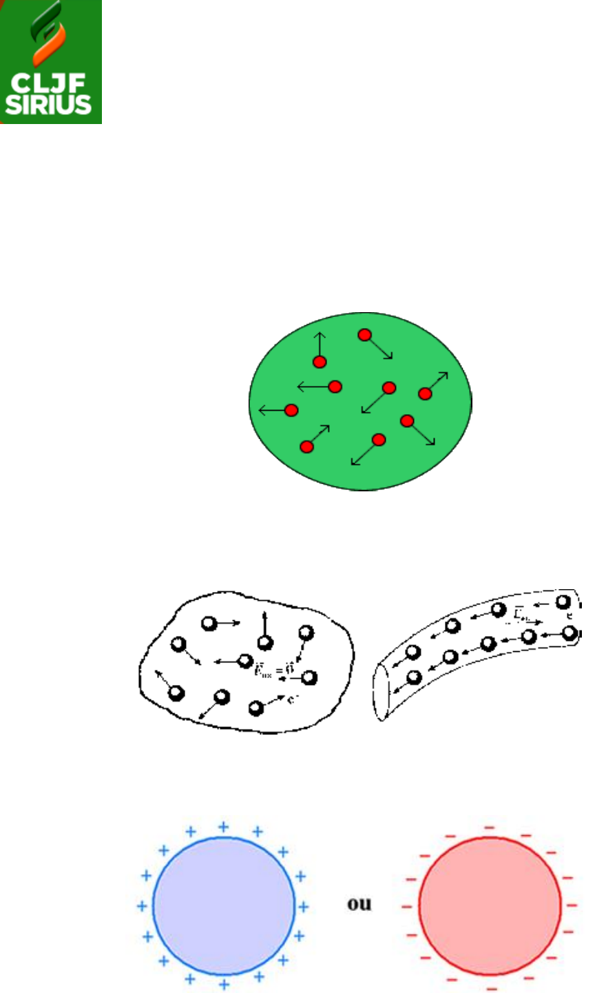 CAMPO ELÉTRICO – ESPCEX – CLJF SIRIUS – Prof. Vinícius – Física – 2025 CONDUTORES EM EQUILÍBRIO ELETROSTÁTICO Dizemos que um condutor se encontra em equilíbrio eletrostático quando nele não ocorre um movimento ordenado de cargas. Na primeira figura (abaixo) o condutor está em equilíbrio eletrostático e na segunda figura, não está. Nos condutores em equilíbrio eletrostático as eventuais cargas elétricas em excesso tendem a se repelir, ocupando, com isso, sua superfície mais externa possível. Blindagem eletrostática: Suponha uma carga elétrica positiva próxima de um condutor em equilibrio eletrostático. A presença desta carga provoca uma polarização no condutor em equilibrio (figura). Esta polarização, por sua vez, produz um campo elétrico no interior do condutor que é cancelado pelo campo elétrico externo, de modo que o campo elétrico total no interior da esfera é anulado. O movimento de cargas no condutor (polarização) termina no instante que o campo elétrico total é zerado, gerando a blindagem eletrostática. Este fenômeno acontece independente do condutor ser compacto ou oco. Se ele tiver uma cavidade, este fato protege o interior de qualquer descarga elétrica que venha a atingi-lo. Em certos aparelhos (televisores, rádios, computadores, etc.) é comum certos componentes internos serem protegidos por um invólucro metálico que cria a blindagem eletrostática. Gaiola de Faraday: Experiência que comprova que as cargas elétricas em excesso localizam-se na superfície mais externa de um condutor. A gaiola de metal sobre um suporte isolante é ligada a um gerador eletrostático, sendo que seu interior não sofre efeito elétrico algum. Desta maneira, a carcaça metálica de um carro, de um amplificador ou mesmo de um avião protege os corpos em seu interior das ações elétricas externas. Potencial elétrico de um condutor em equilibrio eletrostático: Quando um condutor está em equilibrio eletrostático, o movimento de cargas elétricas no seu interior é desordenado. Assim, dizemos que o potencial em seu interior é constante (DDP = 0) e, com o efeito, o campo elétrico em seu interior é zero. Caso o condutor seja esférico de carga Q distribuída em sua superfície, por razões de simetría, podemos substituir com o mesmo efeito sua carga Q por uma equivalente no centro da esfera. Com isso, calculamos o potencial elétrico de uma esfera de raio R e carga Q: Poder das Pontas: Em condutores não esféricos, as regiões de “ponta” terão maior densidade de cargas, o que produz um campo elétrico mais intenso. Com o efeito, as regiões de pontas serão as mais prováveis de ocorrerem eventuais descargas elétricas. Tal fenômeno é conhecido como “poder das pontas” e pode ser observado em dispositivos de proteção, como os para-raios. Rigidez dielétrica: Chamamos de dielétrico um meio não condutor de corrente elétrica e de rigidez dielétrica o maior valor do campo elétrico que o meio pode ser submetido sem que se torne um condutor. A rigidez dielétrica do ar em condições normais, por exemplo, vale 3.106 N/C. Se o ar estiver úmido, por exemplo, este valor cai sensivelmente. O potencial elétrico da esfera é constante até d = 0,2 m. Assim, R = 0,2 m Temos que 𝑉 = 𝐾.𝑄 𝑅 ; 𝑄 = 𝑉.𝑅 𝐾 = 1. 105. 0,2 = 2. 104𝐶 EXTRAS: 1) (UPF) Durante uma experiência didática sobre eletrostática, um professor de Física eletriza uma esfera metálica oca suspensa por um fio isolante. Na sequência, faz as seguintes afirmações: I. A carga elétrica transferida para a esfera se distribui na superfície externa desta. II. O campo elétrico no interior da esfera é nulo. III. O campo elétrico na parte exterior da esfera tem direção perpendicular à superfície desta. IV. A superfície da esfera, na situação descrita, apresenta o mesmo potencial elétrico em todos os pontos. V. A carga elétrica acumulada na esfera é positiva, pois lhe foram transferidas cargas positivas. Está correto o que se afirma em: a) I apenas. b) I e II apenas. c) I, II e III apenas. d) I, II, III e IV apenas. e) I, II, III, IV e V. 2) (PUC – MG) Duas esferas condutoras A e B, de raios R e 3R, estão inicialmente carregadas com cargas positivas 2q e 3q, respectivamente. As esferas são então interligadas por um fio condutor. Assinale a opção CORRETA. a) Toda a carga da esfera A passará para a esfera B. b) Não haverá passagem de elétrons de uma esfera para outra. c) Haverá passagem de cargas positivas da esfera A para a esfera B. d) Passarão elétrons da esfera B para a esfera A. Para avaliar se vai haver fluxo de carga e em que sentido, devemos obter o potencial elétrico de cada esfera. 𝑉𝐴 = 𝐾.𝑄𝐴 𝑅𝐴 = 𝐾. 2𝑞 𝑅 = 2𝐾. 𝑞 𝑅 𝑉𝐵 = 𝐾.𝑄𝐵 𝑅𝐵 = 𝐾. 3𝑞 3𝑅 = 𝐾. 𝑞 𝑅 Com isso, VA = 2VB. Havendo DDP entre as esferas, haverá fluxo de elétrons de B para A, dado que cargas negativas se deslocam espontaneamente para regiões de potencial mais alto. (Letra D)