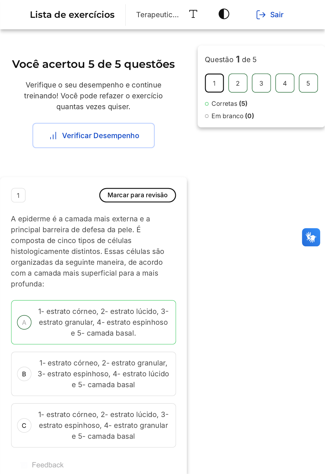 Você acertou 5 de 5 questões Verifique o seu desempenho e continue treinando! Você pode refazer o exercício quantas vezes quiser. Verificar Desempenho A B C 1 Marcar para revisão A epiderme é a camada mais externa e a principal barreira de defesa da pele. É composta de cinco tipos de células histologicamente distintos. Essas células são organizadas da seguinte maneira, de acordo com a camada mais superficial para a mais profunda: 1- estrato córneo, 2- estrato lúcido, 3- estrato granular, 4- estrato espinhoso e 5- camada basal. 1- estrato córneo, 2- estrato granular, 3- estrato espinhoso, 4- estrato lúcido e 5- camada basal 1- estrato córneo, 2- estrato lúcido, 3- estrato espinhoso, 4- estrato granular e 5- camada basal Questão 1 de 5 Corretas (5) Em branco (0) 1 2 3 4 5 Lista de exercícios Terapeutic… Sair Feedback D E 1- camada basal, 2- estrato lúcido, 3- estrato granular, 4- estrato espinhoso e 5- estrato córneo 1- camada basal, 2- estrato granular, 3- estrato espinhoso, 4- estrato lúcido e 5- camada basal Resposta correta Parabéns, você selecionou a alternativa correta. Confira o gabarito comentado! Gabarito Comentado A organização correta das células da epiderme, da camada mais superficial para a mais profunda, é: 1- estrato córneo, 2- estrato lúcido, 3- estrato granular, 4- estrato espinhoso e 5- camada basal. O estrato córneo é a camada mais externa e é composto por células mortas e queratinizadas. O estrato lúcido é uma camada fina, presente principalmente na palma das mãos e na planta dos pés. O estrato granular contém grânulos de queratohialina, que contribuem para a formação da camada córnea. O estrato espinhoso é composto por várias camadas de queratinócitos. A camada basal é a mais profunda e é onde ocorre a divisão celular. 2 Marcar para revisão De maneira geral, os protocolos para acne incluem o uso de produtos com ativos A B C D E cosméticos que tenham as seguintes características, exceto: Controladores de oleosidade Antissépticos Anti-queratolíticos Cicatrizantes Adstringentes Resposta correta Parabéns, você selecionou a alternativa correta. Confira o gabarito comentado! Gabarito Comentado Os protocolos para acne geralmente incluem o uso de produtos com ativos cosméticos que são controladores de oleosidade, antissépticos, cicatrizantes e adstringentes. No entanto, os anti- queratolíticos não são comumente usados nesses protocolos. Portanto, a alternativa "Anti-queratolíticos" é a exceção mencionada no enunciado da questão. 3 Marcar para revisão A B C D E Qual etapa abaixo não está prevista no protocolo de limpeza de pele? Esfoliação Extração de comedões Assepsia Aplicação de alta frequência Aplicação de ácido Resposta correta Parabéns, você selecionou a alternativa correta. Confira o gabarito comentado! Gabarito Comentado A alternativa correta é a "Aplicação de ácido". No protocolo padrão de limpeza de pele, as etapas incluem esfoliação, extração de comedões (cravos), assepsia e aplicação de alta frequência. A aplicação de ácido não é uma etapa comum neste processo, sendo mais associada a tratamentos estéticos específicos, como os peelings químicos. Portanto, essa opção não está prevista no protocolo padrão de limpeza de pele. A B C D E 4 Marcar para revisão A respeito da pele, marque uma alternativa que indique uma função que não pode ser atribuída a esse órgão. Barreira protetora contra patógenos. Proteção contra a perda excessiva de água. Captação de estímulos de dor, tato, luz e temperatura. Proteção contra atrito. Proteção térmica. Resposta correta Parabéns, você selecionou a alternativa correta. Confira o gabarito comentado! Gabarito Comentado A alternativa C menciona que a pele tem a função de captação de estímulos de luz, o que não é correto. A pele é responsável pela captação de estímulos de dor, tato e temperatura, mas a luz é captada pelos olhos, mais especificamente pela retina. Portanto, a função de captação de estímulos de luz não pode ser atribuída à pele. A B C D E 5 Marcar para revisão São itens necessários para a realização de uma limpeza de pele, exceto: Maca Lupa Vapor de ozônio Bisturi Espátulas Resposta correta Parabéns, você selecionou a alternativa correta. Confira o gabarito comentado! Gabarito Comentado O bisturi não é um item necessário para a realização de uma limpeza de pele. A maca é utilizada para o cliente se deitar, a lupa é usada para visualizar melhor a pele, o vapor de ozônio ajuda a abrir os poros e as espátulas são utilizadas para a remoção de cravos e espinhas. Portanto, a alternativa correta é a letra D, que menciona o bisturi, um instrumento cirúrgico que não é comumente usado em procedimentos de limpeza de pele.