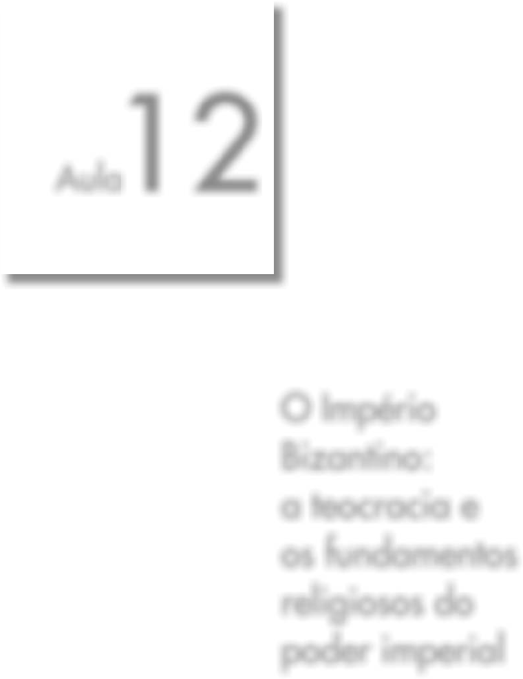Aula 12 O Império Bizantino: a teocracia e os fundamentos religiosos do poder imperial 38 História Medieval Meta da aula Apresentar o Império Bizantino como representação de uma nova ordem cultural e religiosa para o Oriente medieval cristão, entre os séculos IV e VII. Objetivos Ao fi nal do estudo desta aula, você deverá ser capaz de: 1. identifi car as principais estruturas de poder do mundo bizantino, especifi camente referentes à soberania e conservação do trono imperial; 2. analisar os princípios religiosos e as especulações fi lósófi cas que defi niram o perfi l imperial bizantino, entendido em sua época como uma representação terrena do “Reino dos Céus”; 3. caracterizar o Cristianismo bizantino em sua diversidade, expressa a partir de diversas correntes de pensamento consideradas heréticas: arianismo, nestorianismo, monofi sismo e iconoclastia. Pré-requisitos Para um melhor aproveitamento desta aula, sugerimos a você que faça uma revisão sobre o longo processo histórico de crise do Império Romano, assunto trabalhado nas Aulas 2 e 3 desta disciplina. É necessário reler com atenção as medidas tomadas por imperadores como Diocleciano e Constantino em diversos setores da administração pública, das fi nanças, do exército e da religião. 39 Aula 12 – O Império Bizantino: a teocracia e os fundamentos religiosos do poder imperial INTRODUÇÃO Para a historiografi a contemporânea, o Império Bizantino foi compreendido como expressão de um Estado originalmente medieval, uma espécie de recriação do antigo Império Romano do Oriente. Até o século VI, esse Estado compreendia uma vastíssima extensão territorial, que incluía a Mesopotâmia, a Síria, a Palestina, grande parte da Ásia Menor (Anatólia e Capadócia), a Grécia e os Bálcãs, além da parte meridional da Península Itálica e parte da África setentrional. Após a expansão muçulmana do século VII, a perda con- si derável de territórios para os omíadas reduziu o Império Bizantino à região em torno do mar Egeu (Grécia, Bálcãs e Ásia Menor) e a pequenos núcleos na Península Itálica, como Sicília e Sardenha. Muitos historiadores chegam a defi ni-lo como uma civilização multicultural, em que o idioma grego, o latim (em menor grau) e o Cristianismo ortodoxo (em suas múltiplas manifestações) conviveram lado a lado e sustentaram, por séculos, a viva representação da antiga soberania romana, então renovada a partir do século V na fi gura do imperador como um “vice-rei de Deus”. Entretanto, para as sociedades ocidentais na própria Idade Média, Bizâncio não passava de uma “cópia imperfeita” do glorioso passado romano, sendo, então, idealmente representado a partir da supremacia alcançada pela diocese de Roma, em seu ideal de Catolicismo. 40 História Medieval Monacato Conjunto de ordens religiosas relacionadas ao estilo de vida monástico, ou seja, ao enclausuramento no mosteiro para o aprimoramento espiritual e a formação sacerdotal. Figura 12.1: A extensão territorial bizantina, entre os séculos VII e IX, limitava-se aos Bálcãs, a partes da Itália, a Anatólia e Capadócia. Fundamentos da teocracia bizantina Além das recorrentes tensões políticas entre esses dois pólos de poder do mundo medieval, o distanciamento entre o Ocidente e o Oriente bizantino era ainda mais nítido em relação aos critérios, pensamentos e práticas sociais de representação da religiosidade cristã que, do nascimento à morte, justifi cavam e regulavam todas as dimensões da vida cotidiana. As tendências especulativas e refl exivas que envolviam os calorosos debates religiosos no Oriente e a força do comportamento contemplativo da existência humana, manifestado na valorização do monacato, são traços da originalidade bizantina. Todos esses valores, somados à idéia de continuidade do trono imperial, chocavam-se frontalmente com o pensamento imediatista e pragmático da Cristandade ocidental, avessa aos grandes debates sobre a fé e ferrenha defensora de práticas rituais e materiais “concretas”, tidas como únicas e verdadeiras expressões de Cristianismo. Mar Mediterrâneo Roma Constantinopla VISIGODOS Toledo Córdova Valência Batalha Bispado patriarcal TRÁCIA Thema Conquistas árabes BERBERES Cartago Kairuan Palermo Siracusa Bari SICÍLIA CRETA Alexandria RODES CHIPRE Phoinix Babilônia Heliópolis Jerusalém Yarmuk Antioquia Mar Negro CRIMÉIA KHAZARES O P S I K I O N A N A T Ó L I AP E L O P O N E S O Monemvasia H É L A D E T R Á C I A ESLAVOS BÚLGAROS ÁVAROS MUNDO MEDITERRÂNEO SÉCULOS VII A IX LOM BARDOS Veneza Ravena Tours FRANCOS Aachen 41 Aula 12 – O Império Bizantino: a teocracia e os fundamentos religiosos do poder imperial Além da própria Igreja de Roma, outros dois importantes centros políticos e religiosos do Mediterrâneo recusavam-se a ver em Bizâncio a continuidade do antigo Império Romano. As rivalidades, em alguns casos, chegaram a gerar fortes confl itos bélicos. Destacamos aqui o reino visigodo, que enfrentou, por diversas vezes, o exército bizantino no norte da África durante o século VI, e o império carolíngio, principalmente a partir da ascensão de Carlos Magno no século IX. Este último chega, inclusive, sob o respaldo religioso do papado, a denominar seu império de “Nova Roma”, em uma clara alusão à inferioridade do Oriente bizantino em relação aos poderes cristãos do Ocidente, onde Carlos Magno acreditava poder exercer sua supremacia. Além de cultuar a “gloriosa memória” dos francos por terem derrotado “o inimigo islâmico” na Batalha de Poitiers, de 732, os carolíngios deveriam também construir mais uma prova de que detinham a “verdade cristã”: não apenas pela aliança e proteção oferecida à diocese romana, mas, fundamentalmente, pela decidida oposição às políticas religiosas bizantinas. Ainda que a base da produção bizantina residisse na economia fundiária