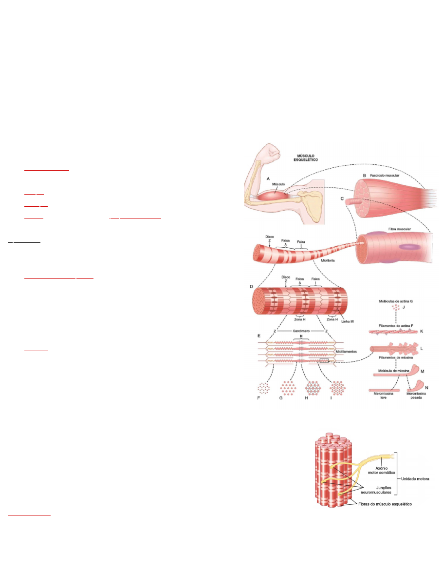 Fisiologia P1 FISIOLOGIA DA CONTRAÇÃO MUSCULAR Músculos Estruturas individualizadas e constituídas por células > fibras musculares organizadas em fascículos. Cada fibra, além de ser vascularizada por um capilar específico, será inervada apenas por uma terminação nervosa. O sarcolema é a membrana plasmática da fibra muscular. Cada fibra possui centenas de milhares de miofibrilas organizadas em sarcômeros > responsável pela contração em si. Sarcômero: espaço entre dois discos Z. O que gera a tensão e capacidade de gerar força na fibra é a interação entre a cabeça da miosina com a actina. Isadora Simioni - 90 Anatomia macroscópica do músculo esquelético • Ventre muscular > parte mais proeminente do músculo durante a contração. Parte contrátil do músculo. • Origem > parte proximal do osso • Inserção > parte distal onde o músculo se insere ao osso. • Tendão > une músculo a osso (junção miotendínea). TCDM rico em fibras de colágeno I, que confere resistência na associação do músculo a osso. Aponeurose: tendões que associam músculo a osso de forma que, quando haja contração, o ventre muscular não fique proeminente. Possui o formato mais plano e laminar. Encontrados em músculos abdominais, palma da mão e sola do pé. • Fáscia muscular/epimísio > tecido conjuntivo que reveste o músculo como um todo. Impede que os músculos sofram atrito uns com os outros - vantagem bioenergética para evitar a perda de calor durante o deslizamento dos músculos. • Fibras musculares que se contraem, e são vascularizadas por artérias e vasos sanguíneos (um capilar específico). • Neurônio > inervado por um grupo de neurônios chamados neurônios somáticos motores, localizados no corno ventral da medula (neurônio motor inferior), e neurônios do córtex motor no encéfalo (modulam a atividade dos neurônios do corno ventral - neurônio motor superior). Responsáveis por permitir a contração muscular esquelética. Cada ramificação da região terminal axonal vai inervar uma fibra muscular específica. Contração muscular Ocorre por que as cabeças da miosina interagem com o sítio de ligação da actina > pontes cruzadas, com a finalidade de deslizar os filamentos de actina para o centro do sarcômero (na direção da linha M). Quanto mais sarcômeros são recrutados para encurtar, maior é a força da contração. A contração é dependente da unidade motora. Unidade motora > associação entre um neurônio motor inferior e as fibras musculares esqueléticas por ele inervadas. Um neurônio pode inervar várias fibras musculares ao mesmo tempo, mas uma fibra só será inervada por um único neurônio e uma única ramificação. Várias dentro de um mesmo fascículo (importante para controle da força). Músculos com movimentos finos > neurônio inerva poucas fibras musculares. Ex: músculos do globo ocular. Músculos com movimentos grossos > neurônio inerva muitas fibras musculares. Ex: bíceps, tríceps. O neurônio motor superior, localizado no córtex motor, vai modular a atividade do neurônio motor inferior. O neurônio motor inferior, por sua vez, vai modular a atividade das fibras. Passo a passo - contração Um neurônio motor irá conduzir um potencial de ação (impulso nervoso) até a junção neuromuscular (região sináptica entre o botão sináptico do axônio de um neurônio motor e uma fibra esquelética). Quando o potencial de ação se propaga para o terminal axonal, essa corrente elétrica induz a abertura de canais de cálcio voltagem-dependente, permitindo que íons cálcio se difundam do espaço sináptico para o interior do terminal nervoso. Esse processo libera as vesículas de acetilcolina do citoesqueleto e permite que movam para a zona ativa da membrana neural pré-sináptica (proteínas motoras Sinapsina e SNARE). As vesículas colinérgicas então se acoplam nos pontos de liberação, se fundem com a membrana neural e lançam a acetilcolina no espaço sináptico, pelo processo da exocitose. A região da placa motora é a porção externa da membrana plasmática da fibra muscular. A membrana invaginada é chamada goteira sináptica ou canaleta sináptica, e o espaço entre o terminal e a membrana da fibra é chamado espaço sináptico ou fenda sináptica. No fundo da goteira encontram-se inúmeras pequenas dobras da placa motora, chamadas fendas subneurais. Dentro das fendas há duas regiões. Placa motora primária: contém os receptores colinérgicos nicotínicos, do tipo ionotrópicos (respostas rápidas). A acetilcolina se liga a esses receptores. Placa motora secundária/terminal: contém canais de sódio voltagem-dependente. Para que haja o desencadeamento do potencial de ação da fibra, precisa primeiramente haver a despolarização. O estímulo que chega deve ser forte o suficiente para atingir o limiar de excitabilidade. Quando 2 moléculas de acetilcolina se ligam às subunidades alfa de seu receptor ionotrópico, localizado próximo às aberturas das fendas subneurais, ele funciona como um canal de sódio ligante-dependente. O principal efeito da abertura dos canais controlados pela acetilcolina é permitir que grande número de íons sódio entre na fibra, levando com eles grande número de cargas positivas > faz com que a voltagem da célula aumente e se crie o potencial da placa motora (potencial local). Se a entrada for suficiente a voltagem subirá e atingirá o limiar de excitabilidade. Quando se atinge esse limiar, os canais de sódio voltagem-dependente na placa motora secundária vão se abrir de forma abrupta e desencadear o potencial de ação. A acetilcolina, uma vez liberada no espaço sináptico, continua a ativar os receptores de acetilcolina enquanto esta persistir nesse espaço. Entretanto, ela é removida rapidamente para evitar a reexcitação continuada do músculo, depois que a fibra muscular se recuperou de seu potencial de ação inicial. É clivada pela enzima aceticolinest