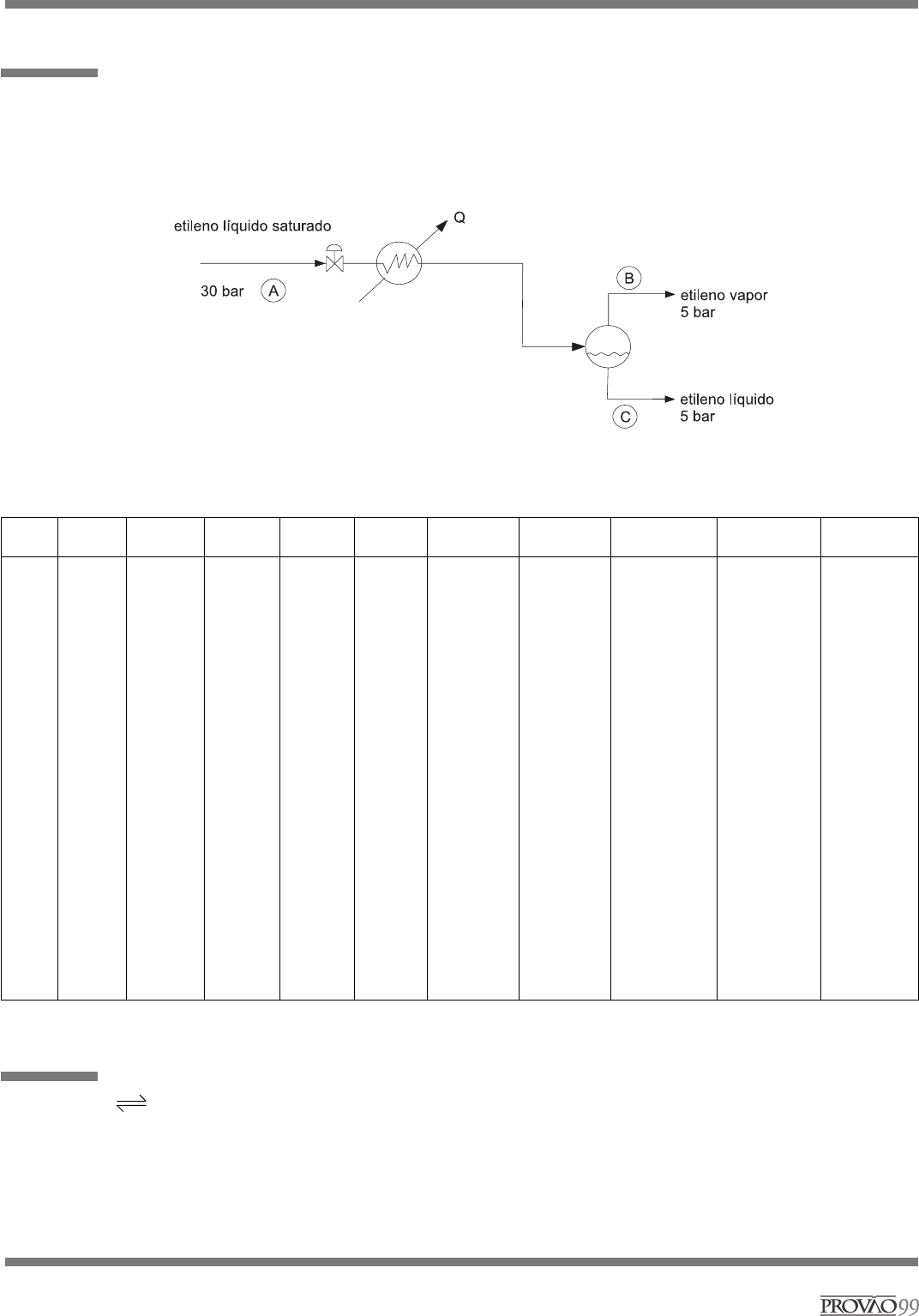 2ENGENHARIA QUÍMICA 1 Uma unidade industrial deverá empregar etileno como refrigerante em um sistema de resfriamento. O trocador de calor de refrigeração receberá 100 kgh − 1 de etileno líquido, saturado a uma pressão de 30 bar absoluta, conforme o esquema abaixo. Na entrada do trocador a pressão é reduzida para 5 bar, forçando a vaporização do etileno. Calcular a carga térmica do trocador, de forma que 80% do etileno alimentado passem para o estado de vapor. Dados / Informações adicionais 2 Na reação A+B C, a energia de ativação Ed a da reação, no sentido da produção de C, é diminuída de 20 kJ mol − 1 °C − 1 ao se adicionar um catalisador. Mostre como a energia de ativação Ei a da reação, no sentido inverso, é influenciada pela adição do mesmo catalisador. 104,0t 110 120 130 140 150 160 170 180 190 200 210 220 230 240 250 260 270 275 0,0012 0,0032 0,0141 0,0469 0,118 0,269 0,562 1,053 1,822 2,959 4,559 6,723 9,560 13,18 17,71 23,28 30,03 38,11 42,71 50,97 265 109 27,8 8,72 3,611 1,676 0,8281 0,4605 0,2761 0,1752 0,1162 0,0801 0,0570 0,0415 0,0305 0,0224 0,0164 0,0118 0,0096 0,0047 1,417. − 3 1,449. − 3 1,500. − 3 1,553. − 3 1,605. − 3 1,659. − 3 1,711. − 3 1,762. − 3 1,811. − 3 1,865. − 3 1,923. − 3 1,986. − 3 2,056. − 3 2,142. − 3 2,243. − 3 2,370. − 3 2,539. − 3 2,798. − 3 2,997. − 3 4,739. − 3 803 808 820 832 844 856 868,6 875,7 882,7 888,9 894,1 899,8 905,7 911,1 912,2 908,1 900,1 887,7 874,2 799,1 241 251 275 299 324 347 371,3 395,4 419,6 443,8 467,8 492,6 518,0 544,2 571,5 600,8 633,0 673,2 700,3 799,1 4,077 4,224 4,362 4,494 4,617 4,731 4,844 4,956 5,070 5,188 5,313 5,459 5,551 5,903 7,185 7,049 6,935 6,837 6,749 6,670 6,608 6,551 6,490 6,417 6,340 6,253 6,194 5,903 2,480 2,457 2,436 2,418 2,405 2,397 2,395 2,404 2,410 2,425 2,450 2,505 2,580 2,706 2,915 3,260 3,775 4,990 ∞ 7,5 5,63 4,20 3,28 2,65 2,20 1,87 1,62 1,43 1,28 1,15 1,05 0,97 0,90 0,83 0,77 0,71 0,258 0,252 0,242 0,232 0,222 0,212 0,202 0,192 0,182 0,172 0,162 0,152 0,142 0,132 0,122 0,112 0,102 ∞ P, barT, K υƒ, m 3 /kg kƒ, W/(m.K)υg, m3 /kg hƒ, kJ/kg hg, kJ/kg sƒ, kJ/(kg.K) sg, kJ/(kg.K) Cpƒ, kJ/(kg.K) µƒ, 10 − 4Pa.s 283,1c Etileno Saturado 3ENGENHARIA QUÍMICA 3 Deseja-se recuperar etano de uma corrente gasosa contendo etano e nitrogênio, através de uma coluna de absorção, utilizando como solvente um óleo não volátil. Como subsídio para o projeto da coluna, calcule a volatilidade relativa do nitrogênio em relação ao etano a 50°C e 50 bar, para uma solução gasosa contendo 2 mol% de etano e 98 mol% de nitrogênio em equilíbrio com o óleo. Sabe-se que, na solução gasosa, nas condições acima, os coeficientes de fugacidade do etano e do nitrogênio são iguais a 0,841 e 0,997, respectivamente. O valor da Constante de Henry do etano, em óleo, é igual a 100 bar, e o do nitrogênio, em óleo, é igual a 1.000 bar. 4 O sistema de reação esboçado na figura abaixo é constituído de um reator tubular (operando em regime de fluxo pistonado, plug flow) e de um reator de mistura. Ambos operam isotermicamente, à mesma temperatura. Processa-se atualmente uma reação de isomerização em fase líquida, considerada de primeira ordem, irreversível. Em condições normais de operação, a válvula 3 está fechada, e as válvulas 1, 2, 4 e 5, abertas, de forma a distribuir igualmente a vazão de alimentação entre os dois reatores. Uma pane no sistema de controle provoca repentinamente um fechamento adicional na válvula 1 e uma abertura correspondente na válvula 2, levando o sistema a um novo patamar de conversão. a) Levando em consideração a situação acima descrita, esboce um gráfico mostrando, qualitativamente, a evolução da conversão total do sistema versus tempo, justificando-o. (valor: 4,0 pontos) b) Calcule a conversão em cada um dos reatores ( X t e X m ), antes da pane no sistema de controle, considerando que o volume do reator de mistura é igual ao do reator tubular, e que a conversão total do sistema é de 50%. (valor: 6,0 pontos) Dados / Informações adicionais ( )− r A = velocidade de consumo do reagente A X = conversão do reagente A Reator tubular onde: V t = volume do reator tubular F Ao t, = vazão molar de alimentação do reator tubular Reator de mistura onde: V m = volume do reator de mistura F Ao m, = vazão molar de alimentação do reator de mistura α N C H yN xN yC H xC H2 2 6 2 2 2 6 2 6 , = V m F Ao m X m X o r A, ( ) = − −∫ − = )( , t X o A r dX tAo F t V 4ENGENHARIA QUÍMICA 5 Ao verificar o seu e-mail ao chegar ao trabalho, você encontra a seguinte mensagem: From: "G.I. Chephe" To: "Lista Eng. Consult" Subject: En: Consultoria urgente !!! Date: Sun, 21 Mar 1999 19:06:12 -0300 Senhores Engos e Engas da Consult, Favor responder com a maior brevidade possível a consulta encaminhada pelo Sr. Romais. Grato, G.I.C. Consult - Consultores Associados Ltda. >Caro Dr. G.I. Chephe, > >Temos enfrentado sérios problemas com o reator projetado >por essa empresa. Sua promessa de que a conversão mínima >de 75% estaria garantida com a operação do reator a 120°C >e pressão atmosférica só foi possível durante os três >primeiros meses de operação. Estamos tendo problemas desde >que elevamos a temperatura para 180°C, pressionados >pela necessidade de aumentar a produção. >Para tentar melhorar a conversão, mandei retirar o recheio inerte >e instalar um sistema de agitação que estava disponível em >nossa fábrica. >Não conseguimos entender como um reator de três metros >de comprimento e 20cm de diâmetro pode ainda piorar seu >desempenho, mesmo depois de instalarmos o sistema de agitação. Claro >que tratamos de alterar a vazão para manter a razão >volume/vazão constante, conforme recomendado no manual de >operação do reator. Solicitamos com urgência um parecer >de Vossa Senhoria. > >Atenciosamente, > >Q. Romais >Diretor-Presidente >Romais S.A. Suspeitando 