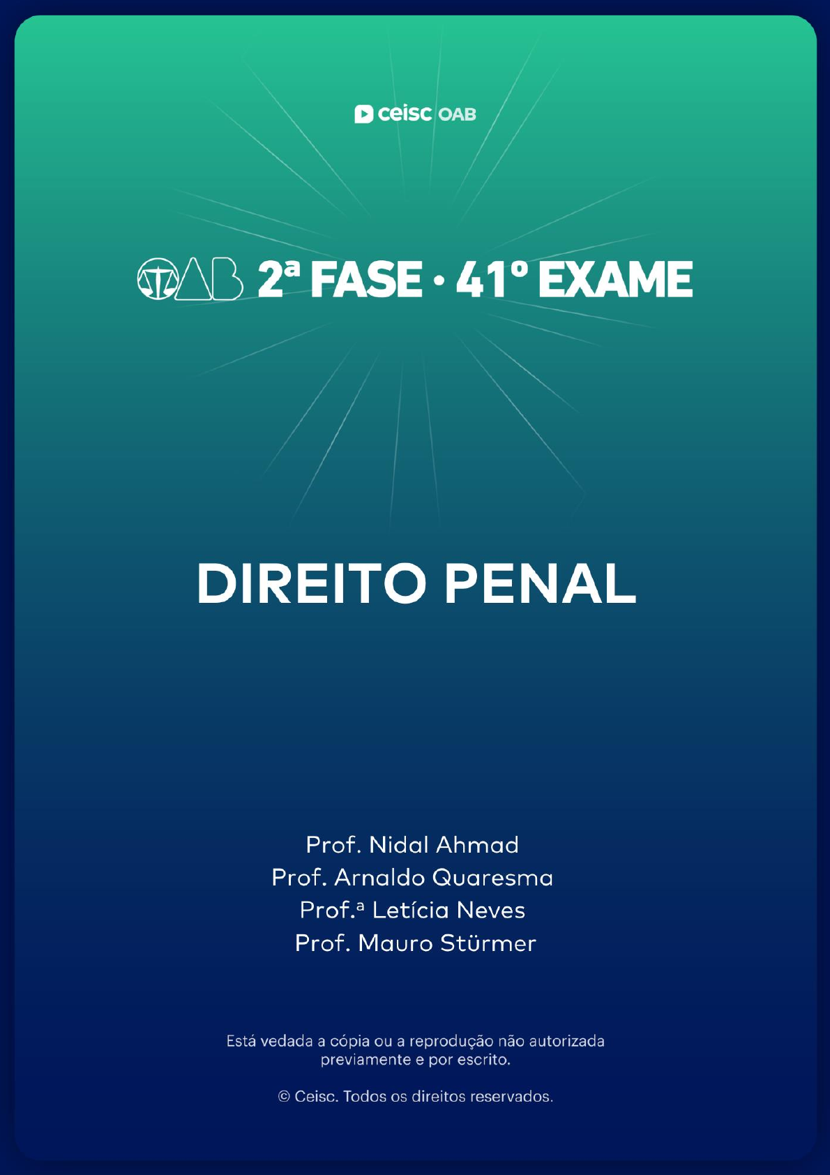 1 2 Olá, Alunos! Sejam bem-vindos! Esse material foi elaborado com muito carinho para que você possa absorver da melhor forma possível os conteúdos e se preparar para a sua 2ª fase, e deve ser utilizado de forma complementar junto com as aulas. Qualquer dúvida ficamos à disposição via plataforma “pergunte ao professor”. Lembre-se: o seu sonho também é o nosso! Bons estudos! Estamos com você até a sua aprovação! Com carinho, Equipe Ceisc ♥ 3 2ª FASE OAB | PENAL | 41º EXAME Direito Penal SUMÁRIO Segunda Fase do Procedimento do Júri 1.1. Preparação e organização do júri ...................................................................6 1.2. Desaforamento ...............................................................................................6 1.2.1. Conceito............................................................................................................................ 6 1.2.2. Interesse da ordem pública............................................................................................. 6 1.2.3. Dúvida sobre a imparcialidade do júri............................................................................ 6 1.2.4. Segurança pessoal do réu.............................................................................................. 7 1.2.5. Iniciativa do desaforamento............................................................................................ 7 1.2.6. Suspensão do julgamento pelo relator...........................................................................7 1.2.7. Inadmissibilidade do pedido de desaforamento............................................................ 7 1.2.8. Excesso de Serviço..........................................................................................................7 1.3. Ausência do defensor .....................................................................................8 1.4. Ausência do acusado .....................................................................................8 1.5. Imprescindibilidade do depoimento da testemunha .......................................8 1.6 Suspensão dos trabalhos para condução coercitiva ou adiamento da sessão8 1.7. Infrutífera condução coercitiva .......................................................................9 1.8. Realização do julgamento ..............................................................................9 1.9. Preparo para a composição do conselho de sentença ...................................9 1.10. Abertura dos trabalhos .................................................................................9 1.11. Ausência de quórum...................................................................................10 1.12. Reunião prévia do juiz com os jurados .......................................................10 1.12.1. Conceito..........................................................................................................................10 1.12.2. Incomunicabilidade dos jurados...................................................................................10 1.12.3. Manifestação da opinião acerca do processo............................................................11 4 1.12.4. Fiscalização da incomunicabilidade durante o julgamento......................................11 1.12.5 Certidão do oficial de justiça.........................................................................................11 1.13. Formação do conselho de sentença...........................................................11 1.14. Recusas motivadas e imotivadas ...............................................................11 1.15. Separação do julgamento ...........................................................................12 1.17. Estouro da urna ..........................................................................................13 1.18. Instrução em plenário..................................................................................................... 14 1.19. Interrogatório do acusado...............................................................................................14 1.20.1. Correlação entre acusação e pronúncia....................................................................15 1.20.2. Manifestação inicial do querelante............................................................................ 15 Apelação das Decisões do Plenário do Júri 2.1. Identificação....................................................................................................................... 20 2.2. Base legal.......................................................................................................................... 20 2.3. Prazo.................................................................................................................................. 21 2.4. Conteúdo/Plano de Ação................................................................................................. 21 2.5. Pedido................................................................................................................................ 23 2.6. Estruturação...................................................................................................................... 24 2.7 Exercícios para resolver após a aula.............................................................33 Padrão Resposta..................................................................................................................... 35 Olá, aluno(a). Este material de apoio foi organizado com base nas aulas do curso preparatório para a 2ª Fase do 41º Exame da OAB e deve ser utilizado como um roteiro para as respectivas aulas. Além disso, recomenda-se que o aluno assista as aulas acompanhado da legislação pertinente. Bons estudos, Equipe Ceisc. Atualizado em julho de 2024. 5 Para dar o soco missioneiro, leia os principais artigos sobre Segunda Fase do Procedimento 