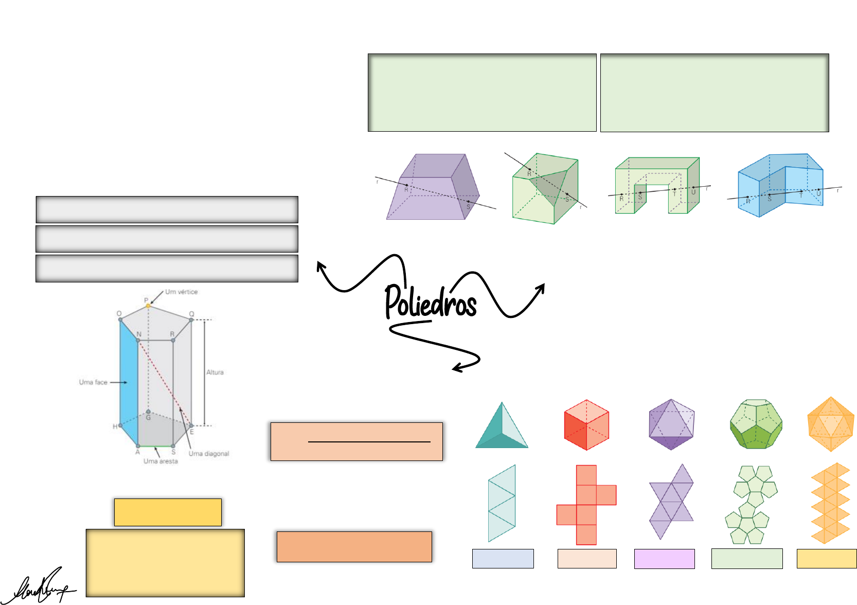 Definição Poliedros são sólidos geométricos (figuras espaciais) fechados e limitados por uma quantidade finita de polígonos. Essas superfícies poligonais são chamadas de faces e os lados desses polígonos comuns a exatamente dois deles são chamados de arestas do poliedro. Classificação Os poliedros podem ser classificados de duas maneiras Convexo: qualquer reta não paralela a nenhuma de suas faces intersecta suas faces em, no máximo, dois pontos da superfície do poliedro. Não Convexo: Quando há pelos menos uma reta não paralela a nenhuma de suas faces que toca mais de dois pontos da superfície do poliedro. Poliedros Convexos Poliedros Não Convexos Elementos Face : polígono que limita um lado do poliedro Aresta : segmento de encontro de duas faces Vértice : ponto de intersecção entre arestas Relação de Euler V + F = A + 2 V: quantidade de vértices F: quantidade de faces A: quantidade de arestas Poliedros Regulares Os poliedros podem ser classificados como regulares quando: • Todas as faces são polígonos regulares • Todas as faces são polígonos congruentes entre si • A quantidade de arestas que concorrem em cada vértice é a mesma Há apenas cinco poliedros regulares convexos Cálculo da quantidade de arestas A = 3𝐹3+4𝐹4+5𝐹5+⋯+𝑛𝐹𝑛 2 Cálculo da quantidade de diagonais D = 𝐶𝑣,2 − 𝑛 − σ 𝑑𝑓 Tetraedro Hexaedro Octaedro Dodecaedro Icosaedro