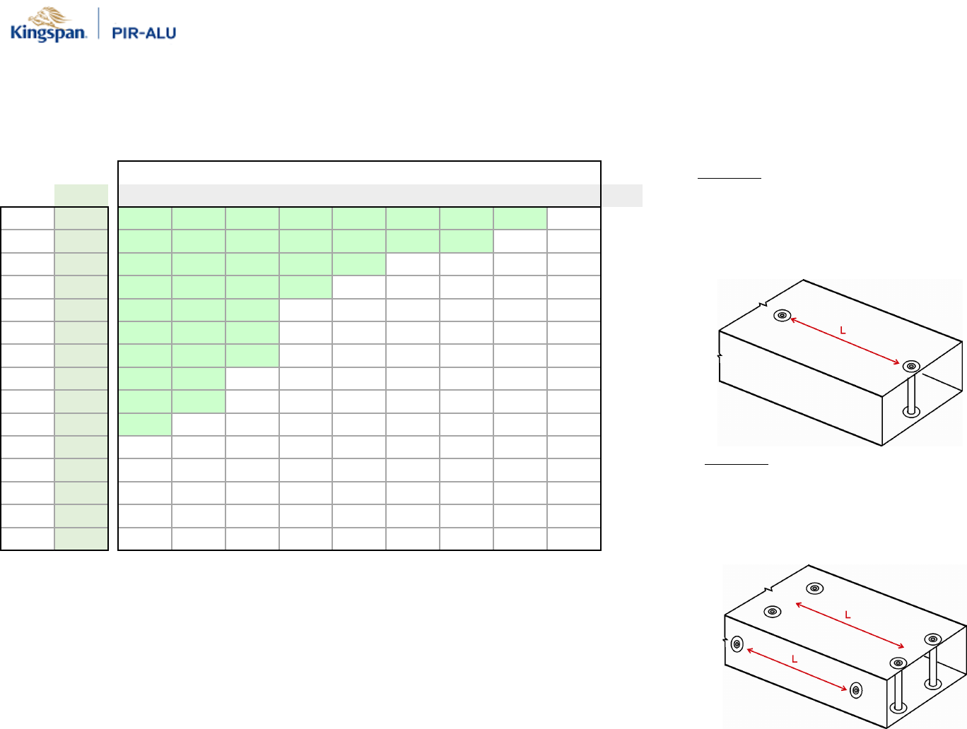 Tabela 1 Painel PIR ALU 20mm de espessura EN 13403 clase R4 El =200.000 N/mm² Painel 20mm TABELA PARA REFORÇOS (VALORES FIXOS) DIMENSÃO DO DUTO EM ALTURA E LARGURA Pa L (mm) 500 600 800 1.000 1.200 1.400 1.600 1.800 2.000 mm 50 1.900 1 75 1.600 1 1 100 1.400 1 1 1 1 150 1.100 1 1 1 1 1 200 900 1 1 1 1 1 2 250 800 1 1 1 1 2 2 300 800 1 1 1 1 2 2 350 700 1 1 1 1 2 2 2 400 700 1 1 1 1 2 2 2 500 600 1 1 1 1 2 2 2 3 600 500 1 1 1 1 2 2 3 3 3 700 500 1 1 1 1 2 2 3 3 3 800 400 1 1 1 2 2 3 3 4 4 900 400 1 1 1 2 2 3 3 4 4 1.000 400 1 1 1 2 2 3 3 4 4 Ejemplo #1: Dimensión del Conducto: 1000x500mm Presión: 600 Pa (2,4 iwc) L: 900mm No. de refuerzos en posición vertical (Anchura): 1 No. de refuerzos en posición horizontal (Altura): 0 Ejemplo #2: Dimensión del Conducto: 1800x600mm Presión: 1000 Pa (4,0 iwc) L: 700mm No. de refuerzos en posición vertical (Anchura): 2 No. de refuerzos en posición horizontal (Altura): 1 Tabela 2 Painel PIR ALU 30mm de espessura EN 13403 clase R5 El =300.000 N/mm² Painel 30mm TABELA PARA REFORÇOS (VALORES FIXOS) DIMENSÃO DO DUTO EM ALTURA E LARGURA Pa L (mm) 500 600 800 1.000 1.200 1.400 1.600 1.800 2.000 mm 100 1.900 1 200 1.600 1 1 300 1.300 1 1 1 1 400 1.100 1 1 1 1 1 500 1.000 1 1 1 1 1 600 900 1 1 1 1 1 2 700 900 1 1 1 1 2 2 800 800 1 1 1 1 2 2 900 700 1 1 1 1 2 2 2 1.000 700 1 1 1 1 2 2 2 1.100 500 1 1 1 2 2 2 3 3 4 1.200 500 1 1 1 2 2 3 3 3 4 1.300 450 1 1 2 2 3 3 3 4 4 1.400 450 1 2 2 3 3 3 3 4 4 1.500 400 2 2 3 3 3 3 4 4 4 Ejemplo #1: Dimensión del Conducto: 1000x500mm Presión: 600 Pa (2,4 iwc) L: 900mm No. de refuerzos en posición vertical (Anchura): 1 No. de refuerzos en posición horizontal (Altura): 0 Ejemplo #2: Dimensión del Conducto: 1800x600mm Presión: 1000 Pa (4,0 iwc) L: 700mm No. de refuerzos en posición vertical (Anchura): 2 No. de refuerzos en posición horizontal (Altura): 1