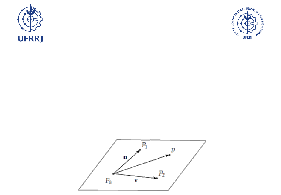 Universidade Federal Rural de Rio de Janeiro IC815 - Geometria Analítica O Plano 9 de outubro de 2023 Prof. Renan Teixeira 1. Equação do plano e suas relações Dados três pontos P0, P1 e P2 não colineares, existe um único plano π que contém estes três pontos, assim como apresentado na Figura 1. Seguindo, então, as mesmas ideias utilizadas no caso da reta, para determinar as equações de π utilizaremos um ponto inicial (por exemplo P0) e conjunto com vetores u⃗ = −−−−→ P0P1 , v⃗ = −−−−→ P0P2 determinados pelos pontos escolhidos. Figura 1: Descrição do plano que contém os pontos, não colineares, P0, P1 e P2. Tomando um ponto P qualquer deste plano π obtemos o vetor −−−→ P0P coplanar aos vetores u⃗ e v⃗. Assim, um ponto P (x,y,z) ∈ π se, e somente se, existem números reais h e t tais que: −−−→ P0P = hu⃗+ tv⃗ P − P0 = hu⃗+ tv⃗ P = P0 + hu⃗+ tv⃗. (1) De modo, que obtemos a equação vetorial do plano π (1). Dados P0(x0,y0,z0), u⃗ = (u1,u2,u3) e v⃗ = (v1,v2,v3) então para um ponto qualquer P(x,y,z) do plano e a equação vetorial (1) podemos escrever da seguinte forma (x,y,z) = (x0,y0,z0) + h(u1,u2,u3) + t(v1,v2,v3) ou x = x0 + hu1 + tv1 y = y0 + hu2 + tv2 z = z0 + hu3 + tv3 (2) descrita como equações paramétricas do plano π (2), onde os vetores u⃗ e v⃗ são chamados de vetores diretores do plano π. A Geometria Euclidiana nos dá uma outra forma de encontrarmos a equação de um plano. Para isso vamos primeiro lembrar que, dada uma reta e um ponto P1 podemos encontrar um único plano π que contenha o ponto P1 e que seja ortogonal a reta dada. 1 Prof. Renan Teixeira O Plano Figura 2: Descrição do plano com seu vetor normal n⃗. Observe que, como mostra a Figura 2, neste resultado, a reta serve apenas para determinar uma direção. Isso nos permite, portanto, substituir esta reta por um vetor paralelo a ela. Neste sentido, dado um plano π, dizemos que um vetor n⃗ não nulo é normal a π se n⃗ é ortogonal a todos os vetores paralelos a π. Portanto, sejam dois pontos A(x1,y1,z1) e P(x,y,z) no plano π. Como o vetor −−→ AP é perpendicular a n⃗= (a,b,c), n⃗ , 0, então temos n⃗ · −−→ AP = 0 n⃗ · (P −A) = 0 (a,b,c) · (x − x1,y − y1,z − z1) = 0 a(x − x1) + b(y − y1) + c(z − z1) = 0 ax+ by+ cz−ax1 − by1 − cz1︸ ︷︷ ︸ =d = 0 Daí, temos a equação geral do plano π dado pela equação (3) abaixo ax+ by+ cz+ d = 0 (3) Exercício 1. Encontre as equações geral, vetorial e paramétricas do plano passando pelos pon- tos A(2, 1,0), B(3, 3, 2) e C(1, 2, 4). Exercício 2. Encontre equações paramétricas para o plano cuja equação geral é 2x+3y+z = 1. Exercício 3. Encontre a equação geral do plano com equação vetorial P = (0,1,2)+(3,1,2)h+ (1,2,1)t. 1.1 Casos Particulares Considerando a equação geral do plano π, ax+ by+ cz+ d = 0, o que acontece quando um ou mais coeficientes são nulos? 1ª Situação Um coeficiente nulo: Quando d = 0, obtemos um plano paralelo ao plano π que passa pela origem O(0,0,0), pois este ponto satisfaz a equação ax + by + cz = 0. Por outro lado, se tivermos a = 0 ou b = 0 ou c = 0 obtemos um plano paralelo ao eixo cujo componente do vetor normal é zero, ou seja, se a= 0 temos um plano paralelo ao eixo Ox e assim por diante. 2 O Plano Prof. Renan Teixeira 2ª Situação Dois coeficientes nulos, sendo um deles o termo d: Neste caso, se tivermos a= d = 0 ou b = d = 0 ou c = d = 0, temos: - se a= d = 0→ obtemos um plano que contém o eixo Ox. - se b = d = 0→ obtemos um plano que contém o eixo Oy. - se c = d = 0→ obtemos um plano que contém o eixo Oz. 3ª Situação Dois coeficientes nulos, dentre a, b, c: Se tivermos a= b = 0 ou b = c = 0 ou a= c = 0 temos - se a= b = 0→ obtemos um plano paralelo ao plano xOy. - se b = c = 0→ obtemos um plano paralelo ao plano yOz. - se a= c = 0→ obtemos um plano paralelo ao plano xOz. 4ª Situação Três coeficientes nulos, sendo um deles o termo d: Neste caso, obtemos o plano coordenado cujos componentes do vetor normal são zero. Problemas Propostos Exercício 4. Determinar a equação geral do plano que passa pelo ponto A(1,−3,4) e é paralelo aos vetores u⃗ = (3,1,−2) e v⃗ = (1,−1,1). Exercício 5. Estabelecer a equação geral do plano determinado pelos pontos A(2, 1,-1), B(0, -1, 1) e C(1, 2, 1). Exercício 6. Estabelecer a equação cartesiana do plano que contém as retas r1 : x = −1+ 2t y = 4t z = 3− 6t e r2 : y = 2x+ 1 z = −3x − 2 . Exercício 7. Seja o plano π que passa pelo ponto A(2,2,-1) e é paralelo aos vetores u⃗ = (2,−3,1) e v⃗ = (−1,5,−3). Determine uma equação vetorial, um sistema de equações paramétricas e uma equação geral de π. Exercício 8. Dado o plano π determinado pelos pontos A(1, -1, 2), B(2, 1, -3) e C(-1, -2, 6), determine um sistema de equações paramétricas e uma equação geral de π. Exercício 9. Dado o plano π de equação 2x− y − z+ 4 = 0, determine um sistema de equações paramétricas para o plano π. 3 Prof. Renan Teixeira O Plano Exercício 10. Determine a equação geral do plano π que contém as retas r1 : x = 2t y = 3+ 2t z = 1− 6t e r2 : y = x+ 1 z = −3x − 2 . 4 O Plano Prof. Renan Teixeira 1.2 Ângulos entre dois planos Sejam os planos π1 e π2 com vetores normais n⃗1 e n⃗2, respectivamente, como apresentado na Figura 3. Figura 3: Ângulo θ entre os planos π1 e π2. Como podemos observar na Figura 3, o ângulo formado pelos planos é o mesmo que o ângulo entre os vetores normais aos planos. Logo, chama-se ângulo de dois planos o menor ângulo que um vetor normal a π1 forma com um vetor normal π2. Sendo θ este ângulo, temos cosθ = |n⃗1 · n⃗2|∥∥∥n⃗1 ∥∥∥∥∥∥n⃗2 ∥∥∥ , com 0 ≤ θ ≤ π 2 . Exercício 11. Determine o ângulo entre os planos π1 : 2x+ y − z+ 3 = 0 e π2 : x+ y − 4 = 0. 1.2.1 Paralelismo entre dois planos Sej