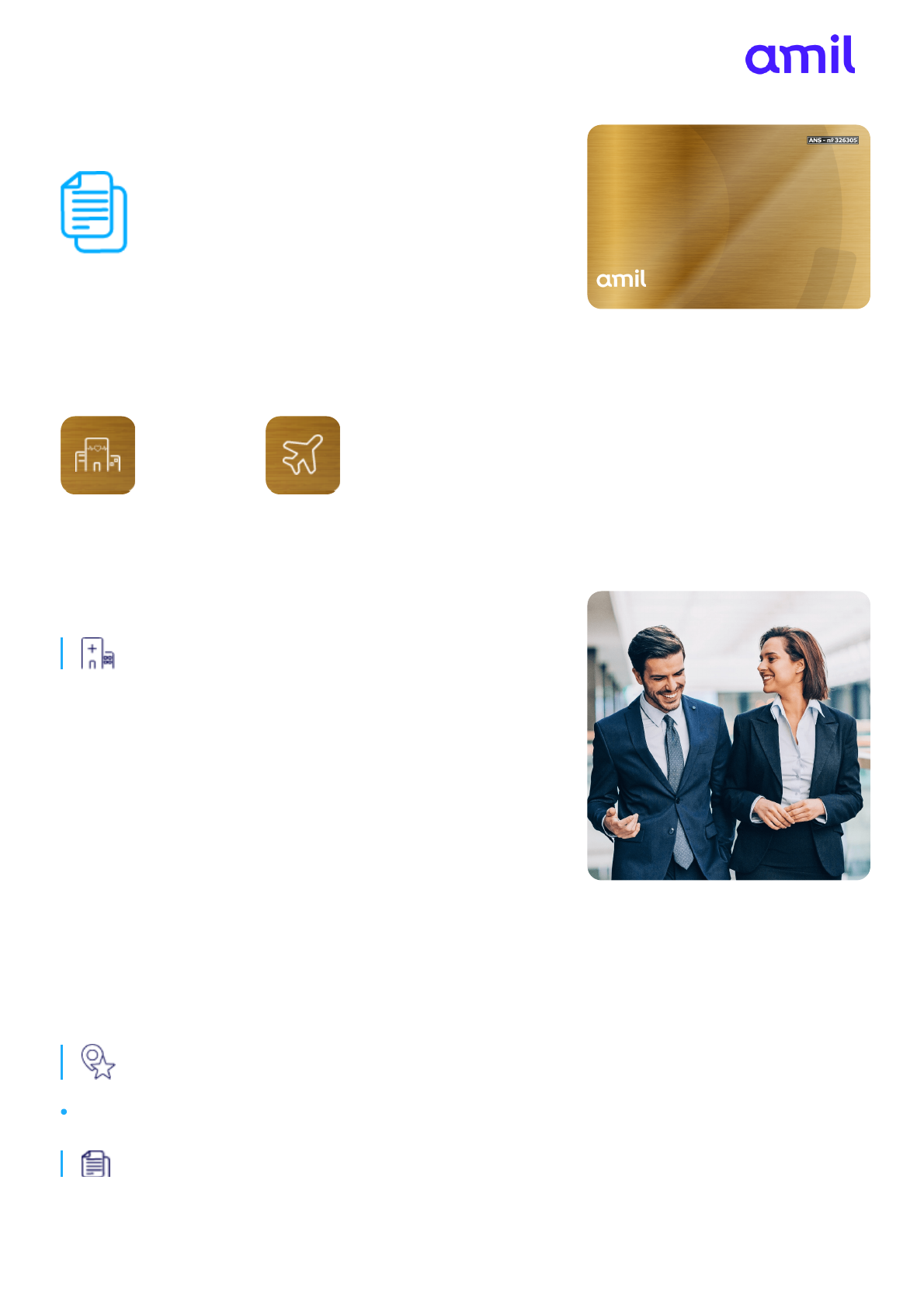 Sempre utilize a versão mais atualizada deste material. Data da impressão: 19/02/2025 Página 1 de 2 Amil Ouro Conheça os produtos Amil Ouro Abrangência de atendimento: Cobertura Nacional Atendimento Pré- Hospitalar e Orientação Médica por Telefone Seguro e Assistência de Viagem Internacional Disponível para Contratação SP: Leforte Liberdade, AACD, BP, Hospital São Camilo Santana, Maternidade Santa Joana*, Hospital Santa Catarina*. RJ: Hospital Vitória, Casa de Saúde São José*, Hospital São Lucas e CHN. DF: Home Hospital, Hospital Brasília Águas Claras e Hospital Santa Lúcia – Asa Sul. MG: Hosp. Mater Dei – Sto. Agostinho, Hosp. Mater Dei Contorno* e Hosp. UMC – Uberlândia. PR: Hospital Marcelino Champagnat. SC: SOS Cardio. RS: Hospital Mãe de Deus, Hospital Moinhos de Vento. BA: Hospital Português. CE: Hospital São Mateus e Hospital Gastroclínica. PE: Real Hospital Português. AM: Check Up Clinicas Hospital. *apenas QP Transplantes (extra rol) *apenas QP Hospitais de destaque no plano: Coberturas Assistenciais: Diferenciais: Sempre utilize a versão mais atualizada deste material. Data da impressão: 19/02/2025 Página 2 de 2 Amil Espaço Saúde Desconto em Farmácia Programa Primeiros Cuidados Telemedicina Amil Reembolso em consultas médicas e honorários médicos clínicos e cirúrgicos