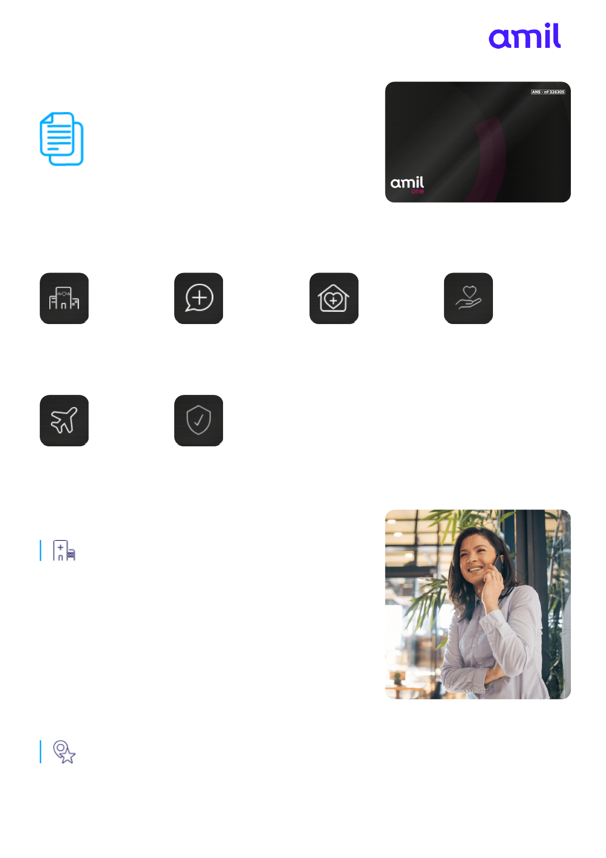 Sempre utilize a versão mais atualizada deste material. Data da impressão: 19/02/2025 Página 1 de 2 Amil Black Conheça o produto Amil Black Abrangência de atendimento: Cobertura Nacional Transplante (extra rol) Escleroterapia Drenagem linfática pós- parto (até 30 dias da alta hospitalar) Hidroterapia (patologia ortopédica) Vacina do Viajante Vacinas em domicílio Coberturas Assistenciais São Paulo: Israelita Albert Einstein, Hospital Sírio-Libanês, Hospital Samaritano. Rio de Janeiro: Hospital Samaritano – Botafogo, Hospital Samaritano – Barra, Hospital Pró-Cardíaco – Botafogo. Brasília: Hospital Sírio-Libanês, Hospital Santa Lúcia. Belo Horizonte: Hospital Mater Dei, Santo Agostinho – Contorno – Betim, Instituto Orizonti. Curitiba: Hospital Paraná, Hospital Marcelino Champagnat, Hospital Nossa Sra. das Graças. Recife: Real Hospital Português, Hospital Santa Joana. Goiânia: Hospital Israelita Albert Einstein. *apenas QP Hospitais de destaque no plano: Coberturas Assistenciais: Sempre utilize a versão mais atualizada deste material. Data da impressão: 19/02/2025 Página 2 de 2 Drenagem Linfática Pós-parto (até 30 dias da alta hospitalar) Escleroterapia Hidroterapia (patologias ortopédica) Transplantes (extra rol) Vacina Vacina do Viajante Amil Espaço Saúde Amil Resgate Coleta Domiciliar Courier para Reembolso Desconto Farmácia Embaixadas Amil One Programa Primeiros Cuidados Reembolso em consultas médicas e honorários médicos clínicos e cirúrgicos Atendimento Pré-Hospitalar e Orientação Médica por Telefone Retaguarda do Einstein, Sírio-Libanês e Samaritano (SP e RJ) Telemedicina Amil One Seguro e Assistência de Viagem Internacional Diferenciais: