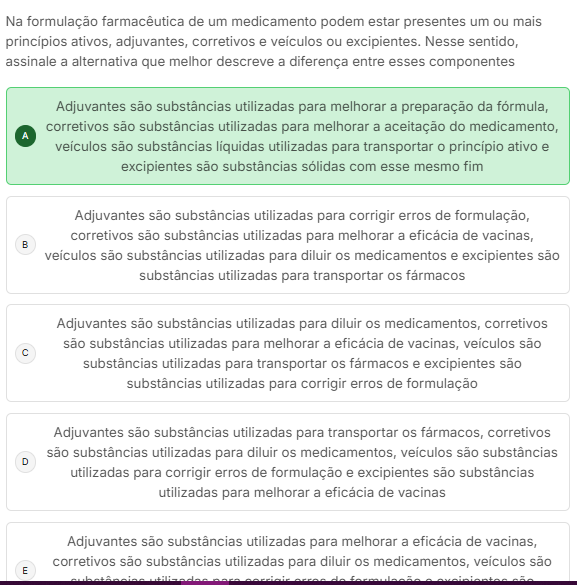 Na formulação farmacêutica de um medicamento podem estar presentes um ou mais princípios ativos, adjuvantes, corretivos e veículos ou excipientes. Nesse sentido, assinale a alternativa que melhor descreve a diferença entre esses componentes Adjuvantes são substâncias utilizadas para melhorar a preparação da fórmula, corretivos são substâncias utilizadas para melhorar a aceitação do medicamento, A veículos são substâncias líquidas utilizadas para transportar O princípio ativo e excipientes são substâncias sólidas com esse mesmo fim Adjuvantes são substâncias utilizadas para corrigir erros de formulação, corretivos são substâncias utilizadas para melhorar a eficácia de vacinas, B veículos são substâncias utilizadas para diluir os medicamentos e excipientes são substâncias utilizadas para transportar os fármacos Adjuvantes são substâncias utilizadas para diluir os medicamentos, corretivos são substâncias utilizadas para melhorar a eficácia de vacinas, veículos são substâncias utilizadas para transportar os fármacos e excipientes são substâncias utilizadas para corrigir erros de formulação Adjuvantes são substâncias utilizadas para transportar os fármacos, corretivos são substâncias utilizadas para diluir os medicamentos, veículos são substâncias D utilizadas para corrigir erros de formulação e excipientes são substâncias utilizadas para melhorar a eficácia de vacinas Adjuvantes são substâncias utilizadas para melhorar a eficácia de vacinas, corretivos são substâncias utilizadas para diluir os medicamentos, veículos são E