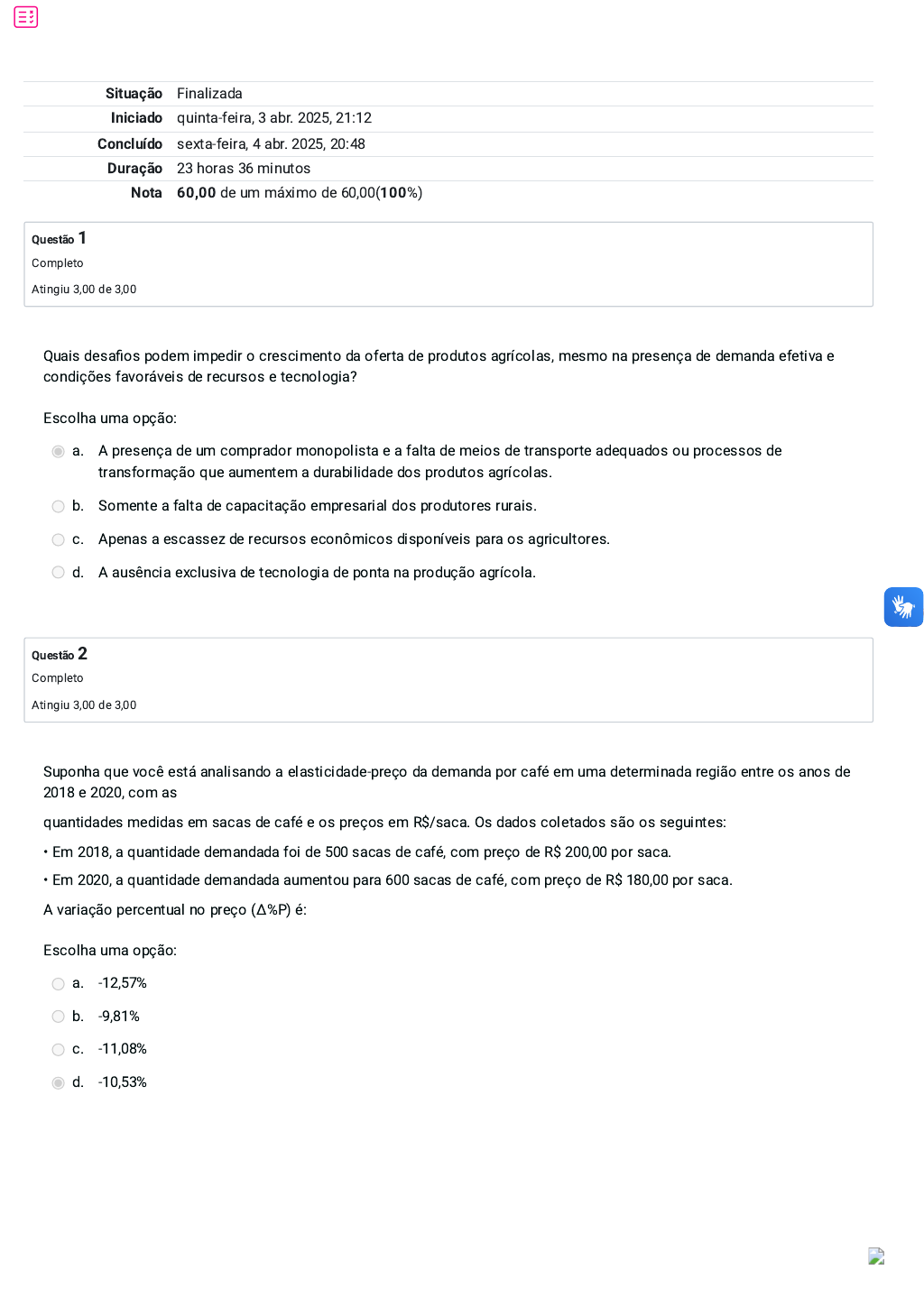 Situação Finalizada Iniciado quinta-feira, 3 abr. 2025, 21:12 Concluído sexta-feira, 4 abr. 2025, 20:48 Duração 23 horas 36 minutos Nota 60,00 de um máximo de 60,00(100%) Questão 1 Completo Atingiu 3,00 de 3,00 Questão 2 Completo Atingiu 3,00 de 3,00 Quais desafios podem impedir o crescimento da oferta de produtos agrícolas, mesmo na presença de demanda efetiva e condições favoráveis de recursos e tecnologia? Escolha uma opção: a. A presença de um comprador monopolista e a falta de meios de transporte adequados ou processos de transformação que aumentem a durabilidade dos produtos agrícolas. b. Somente a falta de capacitação empresarial dos produtores rurais. c. Apenas a escassez de recursos econômicos disponíveis para os agricultores. d. A ausência exclusiva de tecnologia de ponta na produção agrícola. Suponha que você está analisando a elasticidade-preço da demanda por café em uma determinada região entre os anos de 2018 e 2020, com as quantidades medidas em sacas de café e os preços em R$/saca. Os dados coletados são os seguintes: • Em 2018, a quantidade demandada foi de 500 sacas de café, com preço de R$ 200,00 por saca. • Em 2020, a quantidade demandada aumentou para 600 sacas de café, com preço de R$ 180,00 por saca. A variação percentual no preço (Δ%P) é: Escolha uma opção: a. -12,57% b. -9,81% c. -11,08% d. -10,53% Questão 3 Completo Atingiu 3,00 de 3,00 Questão 4 Completo Atingiu 3,00 de 3,00 Questão 5 Completo Atingiu 3,00 de 3,00 Dos fatores abaixo, a que NÃO influencia na demanda do consumidor é: Escolha uma opção: a. O preço de bens complementares b. Os gostos e preferências c. O custo dos fatores de produção d. A renda do consumidor Qual é o objetivo do Prêmio para Escoamento de Produto (PEP)? Escolha uma opção: a. Garantir preços mínimos aos produtores agrícolas. b. Promover a garantia de preços aos produtores e livrar o governo do ônus da estocagem. c. Subsidiar o transporte de produtos agrícolas para o exterior. d. Estimular a venda direta dos produtos agrícolas aos consumidores. Quais são as etapas da Administração de marketing, segundo Kotler (1993)? Escolha uma opção: a. Análise, Planejamento, Implementação e Controle. b. Pesquisa, Desenvolvimento, Implementação e Controle. c. Análise, Planejamento, Desenvolvimento e Controle. d. Análise, Pesquisa, Implementação e Controle. Questão 6 Completo Atingiu 3,00 de 3,00 Questão 7 Completo Atingiu 3,00 de 3,00 Julgue as afirmativas abaixo como verdadeiras ou falsas e assinale a alternativa que apresenta a sequência correta. () A diferenciação de produto é uma característica exclusiva do monopólio. () Na concorrência perfeita, a existência de muitos compradores e vendedores impede que qualquer um deles exerça influência significativa sobre o mercado. () Um monopólio se caracteriza pela oferta de produtos ou serviços sem substitutos próximos, satisfazendo uma necessidade de forma exclusiva. () Oligopólios podem formar cartéis para estabelecer preços e dividir o mercado, com o objetivo de maximizar lucros de forma coletiva. () Na concorrência monopolística, as barreiras de entrada são geralmente altas, dificultando a entrada de novos competidores no mercado. () Estratégias de concorrência que não envolvem o preço, como publicidade, são consideradas ineficazes em um mercado de concorrência perfeita. () No contexto de um oligopólio, é impossível a ocorrência de competição acirrada, visto que o mercado é dominado por poucas empresas. Escolha uma opção: a. V – V – F – V – F – V – V b. F – V – V – V – F – V – F c. V – F – F – V – V – F – V d. F – V – F – V – V – V – F O que é o Programa de Vendas em balcão (ProVB)? Escolha uma opção: a. Um programa para a comercialização de produtos agrícolas no mercado internacional. b. Um programa de incentivo à produção de milho e sorgo na segunda safra. c. Um programa para viabilizar o acesso dos criadores rurais de pequeno porte aos estoques de produtos agrícolas. d. Um programa de financiamento para a estocagem de produtos agrícolas. Questão 8 Completo Atingiu 3,00 de 3,00 Questão 9 Completo Atingiu 3,00 de 3,00 Questão 10 Completo Atingiu 3,00 de 3,00 Qual abordagem de pesquisa de mercado é especialmente útil para estabelecer relações de causa e efeito, observando as consequências de alterações intencionais em alguns elementos da realidade? Escolha uma opção: a. Grupos de foco b. Pesquisas exploratórias c. Pesquisas experimentais d. Pesquisas descritivas Sobre a classificação e o funcionamento dos mercados agrícolas, qual das seguintes afirmações é correta? Escolha uma opção: a. Os mercados de hortaliças operam exclusivamente em escala global devido à sua facilidade de transporte e longa vida útil. b. Todos os produtos agrícolas são considerados commodities, sendo comercializados globalmente sem necessidade de diferenciação ou agregação de valor. c. No contexto agrícola, os agricultores competem apenas com produtores locais, não sendo afetados pela capacidade de barganha de clientes ou fornecedores de insumos. d. A dimensão geográfica dos mercados é influenciada por fatores como propriedades dos produtos, condições naturais específicas, infraestrutura de distribuição, restrições legais e sanitárias, e estratégias de compradores e vendedores. Qual o papel da comercialização agrícola no ajuste da oferta de produtos agrícolas às necessidades dos consumidores? Escolha uma opção: a. A comercialização agrícola foca exclusivamente no desenvolvimento de infraestrutura viária e ferroviária para facilitar o transporte de produtos agrícolas para os centros urbanos b. A comercialização agrícola é um processo contínuo e organizado que não apenas transfere a propriedade dos produtos, mas também envolve a transformação, diferenciação e agregação de valor, ajust