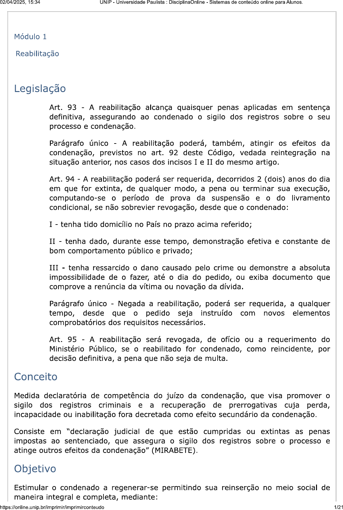 02/04/2025, 15:34 UNIP Universidade Paulista : DisciplinaOnline Sistemas de conteúdo online para Alunos. Módulo 1 Reabilitação Legislação Art. 93 - A reabilitação alcança quaisquer penas aplicadas em sentença definitiva, assegurando ao condenado o sigilo dos registros sobre o seu processo e condenação. Parágrafo único - A reabilitação poderá, também, atingir os efeitos da condenação, previstos no art. 92 deste Código, vedada reintegração na situação anterior, nos casos dos incisos I e II do mesmo artigo. Art. 94 A reabilitação poderá ser requerida, decorridos 2 (dois) anos do dia em que for extinta, de qualquer modo, a pena ou terminar sua execução, computando-se o período de prova da suspensão e o do livramento condicional, se não sobrevier revogação, desde que o condenado: I - tenha tido domicílio no País no prazo acima referido; II tenha dado, durante esse tempo, demonstração efetiva e constante de bom comportamento público e privado; III tenha ressarcido o dano causado pelo crime ou demonstre a absoluta impossibilidade de o fazer, até o dia do pedido, ou exiba documento que comprove a renúncia da vítima ou novação da dívida. Parágrafo único Negada a reabilitação, poderá ser requerida, a qualquer tempo, desde que o pedido seja instruído com novos elementos comprobatórios dos requisitos necessários. Art. 95 A reabilitação será revogada, de ofício ou a requerimento do Ministério Público, se o reabilitado for condenado, como reincidente, por decisão definitiva, a pena que não seja de multa. Conceito Medida declaratória de competência do juízo da condenação, que visa promover o sigilo dos registros criminais e a recuperação de prerrogativas cuja perda, incapacidade ou inabilitação fora decretada como efeito secundário da condenação. Consiste em "declaração judicial de que estão cumpridas ou extintas as penas impostas ao sentenciado, que assegura o sigilo dos registros sobre o processo e atinge outros efeitos da condenação" (MIRABETE). Objetivo Estimular o condenado a regenerar-se permitindo sua reinserção no meio social de maneira integral e completa, mediante: 1/2102/04/2025, 15:34 UNIP Universidade Paulista : DisciplinaOnline Sistemas de conteúdo online para Alunos. o sigilo dos registros criminais contra si; recuperar o gozo e o exercício dos direitos cassados por força dos efeitos da condenação (Ex.: incapacidade para exercer o poder familiar, a tutela ou curatela; exercer cargo público, mandato eletivo; ou a reabilitação para conduzir veículos automotores). Cabimento Somente em decorrência de sentença condenatória com trânsito em julgado, cuja pena tenha sido cumprida ou extinta. Assim, não cabe reabilitação criminal em face de mero inquérito policial. Também não cabe em IP. Não cabe quando da ocorrência da prescrição em abstrato. Cabe na Prescrição da Pretensão Executória. Natureza jurídica Causa suspensiva de alguns efeitos secundários da condenação (art. 92) e dos apontamentos em registros criminais. Sigilo dos registros criminais Como mencionado acima, o objetivo que se busca alcançar por meio da reabilitação criminal é duplo: o sigilo sobre os registros criminais; e a recuperação do gozo ou exercício de direitos cassados em decorrência de sentença penal condenatória. A crítica que se faz gira em torno do art. 202 da Lei de Execução Penal, que dispõe: Art. 202. Cumprida ou extinta a pena, não constarão da folha corrida, atestados ou certidões fornecidas por autoridade policial ou por auxiliares da Justiça, qualquer notícia ou referência à condenação, salvo para instruir processo pela prática de nova infração penal ou outros casos expressos em lei. Como se nota, o sigilo é consequência do cumprimento ou extinção da pena. Logo, nesse aspecto, seria desnecessário socorrer-se da reabilitação para alcançar o sigilo que a própria lei já assegurado ao seu interessado. Contudo, na prática, o sigilo não é automático; depende de providências de cunho administrativo para a inserção de dados em sistemas informatizados, o que se dá, embora de forma lenta, em descompasso com a expectativa ou necessidade do interessado, que vê na reabilitação a forma de se obter efetivo sigilo. Por outro lado, é indiscutível a utilidade da reabilitação para a superação dos efeitos secundários da sentença condenatória, estipulados no art. 92 do Código Penal: https://online.unip.br/imprimir/imprimirconteudo 2/2102/04/2025, 15:34 UNIP Universidade Paulista DisciplinaOnline Sistemas de conteúdo online para Alunos. Art. 92 - São também efeitos da condenação: (Redação dada pela Lei n° 7.209, de 11.7.1984) I - a perda de cargo, função pública ou mandato eletivo: (Redação dada pela Lei 9.268, de 1°.4.1996) a) quando aplicada pena privativa de liberdade por tempo igual ou superior a um ano, nos crimes praticados com abuso de poder ou violação de dever para com a Administração Pública; (Incluído pela Lei n° 9.268, de 1°.4.1996) b) quando for aplicada pena privativa de liberdade por tempo superior a 4 (quatro) anos nos demais casos. (Incluído pela Lei n° 9.268, de 1°.4.1996) II a incapacidade para o exercício do poder familiar, da tutela ou da curatela nos crimes dolosos sujeitos à pena de reclusão cometidos contra outrem igualmente titular do mesmo poder familiar, contra filho, filha ou outro descendente ou contra tutelado ou curatelado; (Redação dada pela Lei n° 13.715, de 2018) III a inabilitação para dirigir veículo, quando utilizado como meio para a prática de crime doloso. (Redação dada pela Lei n° 7.209, de 11.7.1984) Parágrafo único Os efeitos de que trata este artigo não são automáticos, devendo ser motivadamente declarados na sentença. (Redação dada pela Lei 7.209, de 11.7.1984) Mandado de segurança Relevante registrar que o interessado pode se valer de mandado de segurança, diante de qualquer embar