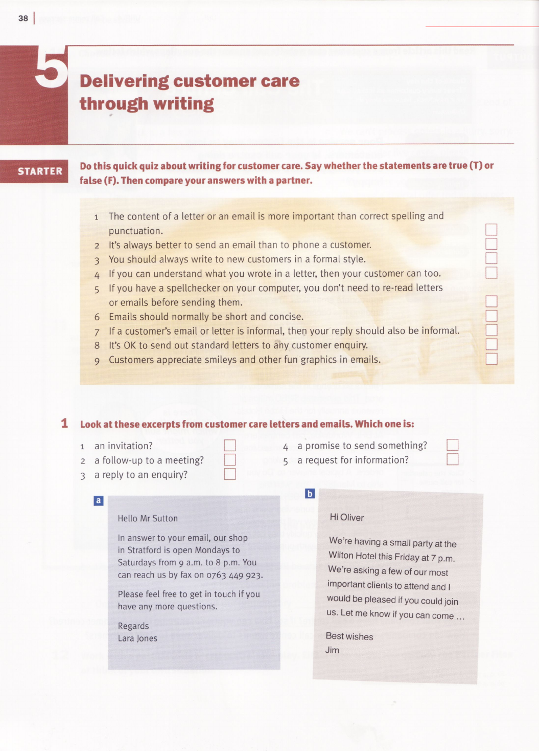 38 1 Delivering customer care through writing Do this quick quiz about writing for customer care. Say whether the statements are true (T) or fatse (F). Then compare your answers with a partner. 2 3 4 5 The content of a let ter or an emai l is more important than correct spel l ing and punctuat ion. It's always better to send an email than to phone a customer. You should always write to new customers in a formal style. lf you can understand what you wrote in a letter, then your customer can too. lf you have a spellchecker on your computer, you don't need to re-read letters or emai ls before sending them. Emails should normal ly be short and concise. lf a customer's email or letter is informal, then your reply should also be informat. It's OK to send out standard letters to any customer enquiry. Customers appreciate smileys and other fun graphics in emails. 6 7 8 9 ! Look at these excerpts from customer care letters and emails. Which one is: T n T n l I n n n I an invi tat ion? z a fol low-up to a meeting? 3 a reply to an enquiry? E 4 a promise to send something? 5 a request for information? tr n I l l t t ft L] f_l t l Hello Mr Sutton In answer to your email, our shop in Stratford is open Mondays to Saturdays from 9 a.m. to 8 p.m. You can reach us by fax on o763 449 923. Please feel free to get in touch if you have any more questions. Regards Lara Jones HiOliver We're having a small party at the Wilton Hotelthis Friday at 7 p.m. We're asking a few of our most important clients to attend and I would be pleased if you could join us. Let me know if you can come . .. Best wishes Jim www.tienganhedu.com a formal informal b cd e www.tienganhedu.com User Realce User Realce g UNIT 5 Delivering customer care through writ ing | 39 Dear Mrs Demetrios Thanks so much for your phone call yesterday. I am pleased to tell you that we can handle your order. Woutd you like to pay by credit card or bank transfer? Please fi l l in the attached form and fax it to me. Then I can send it out to you today. Best regards Jeannette Donaldson tr Dear Mr Blair In regard to our meeting yesterday' I woutd iust like i confirm what we agreed' First of att' "' SinceretY Yours Franco Manzetti E Robert I got your message this afternoon. Sure. I ' l l talk to Ruth and email you the price list today. Do you also need our latest brochure? Take care Carola Which of the above are from letters and which are from emails? How can you tell? Which types of letters or emails do you write to your customers in Engtish? ,CUSTOMER FOCUS EXTRA : Salutations and closes , When you write to a customer for the first t ime, it is often best to use a formal style. Then look at how the customer answers. ls the reply formal or informal? From now on, use the same register as your customer. By communicating with the customer in the way he or she prefers, you demonstrate good customer care. Here is an overview of standard salutations and closes used in letters and emails. lefter email when you don't know the name when you know the name Dear Sir or Madam/Dear Sirs Ladies and Genttemen (AmE) Dear Sir or Madam/Dear Sirs Het lo Yours faithfulty (BrE) Sincerety (yours) (AmE) (Kind/Best) Regards Best wishes Dear Mr/Ms/Mrs Smith Dear Mr and Mrs Smith Dear Ms Black and Mr Smith Dear/ Hel lo Mr/ Ms/Mrs Smith Dear/Hel lo Mr and Mrs Smith Dear/Hetto Ms Black and Mr Smith Yours sincerely (BrE) Sincerely (yours) (AmE) (Kind/Best) Regards Att the best/Best wishes when you know the person/people well Dear, lohn Dear Paul and Mary Dear/Hel to/Hi lohn Hi Paut and Mary Kind regards (With) best wishes Best (wishes)/All the best Take care (AmE)/Cheers (BrE) Note that in the U5, the satutation in letters is often fotlowed by a colon (Dear Mr Brown:). In the UK there is often no punctuation used here, but sometimes people put commas after both the satutdtion and the close (DearJohn,... Kindregards,...). Whetherthere is a comma or not, the first word in letters and emails always starts with a caoital letter. www.tienganhedu.com www.tienganhedu.com User Realce User Realce User Realce User Realce 40 | UNIT 5 Detivering customer care through writ ing 2 Which satutations and closes should you use when writing to the following Peopte? informal formal 7 en@il t Hugo Jones Hi Huqo ... AII the hest l1 retter t Carol E[an 2 retter t Walter Rogers 5 en@it ) Jeanne & PaSCaI Duchard I retter t Mario Ingram & Janet Browne 6 bn", ) name unknown 3 Read the letter and answer the questions. r How wel l does Richard know Mr Davis? z Where did they meet? 3 What did Mr Davis request? 4 What will happen next? Horizons International 42WindsorStrol, John Davis Davis & Chapman Ltd 145 Cheltenham Rd Bristol 856 sQZ Dear Mr Davis It was a pleasure meeting you recently at the Business Executive Conference. I am delighted to be able to assist you in finding a suitable lT communications system for your company. As requested, I am enclosing our latest catalogue with details and prices. I would be grateful if we could meet soon. I will phone you on Thursday and hope we can arange a suitable date and time. lf you have any further questions, please do not hesitate to contact me. I look forward to welcoming you as a new and valued customer. Yours sincerely 4Lchard BLrd Richard Bird Sales Manager Tel +44 20 654 372 . Fax +44 20 654 g7 4 . r.bird@h0rizint.com www.tienganhedu.com Dear Walter...Best wishes Hello Mario and Janet...Cheers Take care See you soon Ms - neutral Mrs - married Dear Ms Elan ... Best regards Dear Mr and Mrs Duchard ...Sincerely yours Dear Sir / Dear Madam Dear Sirs, ... Yours faithfully To whom it may concern refer to previous contact reason for writing enclosing = attaching closing to meeting you / hearing from you offer further help www.tienganhedu.com User Realce User Realce User Realce User Realce UNIT 6 Delivering customer care through writing I +f 4 tatch the two parts to make phras6. r I look forward to 2 We are delighted to 3 lf you have 4 Thank you 5 lt was a pleasure to 6 lf yo