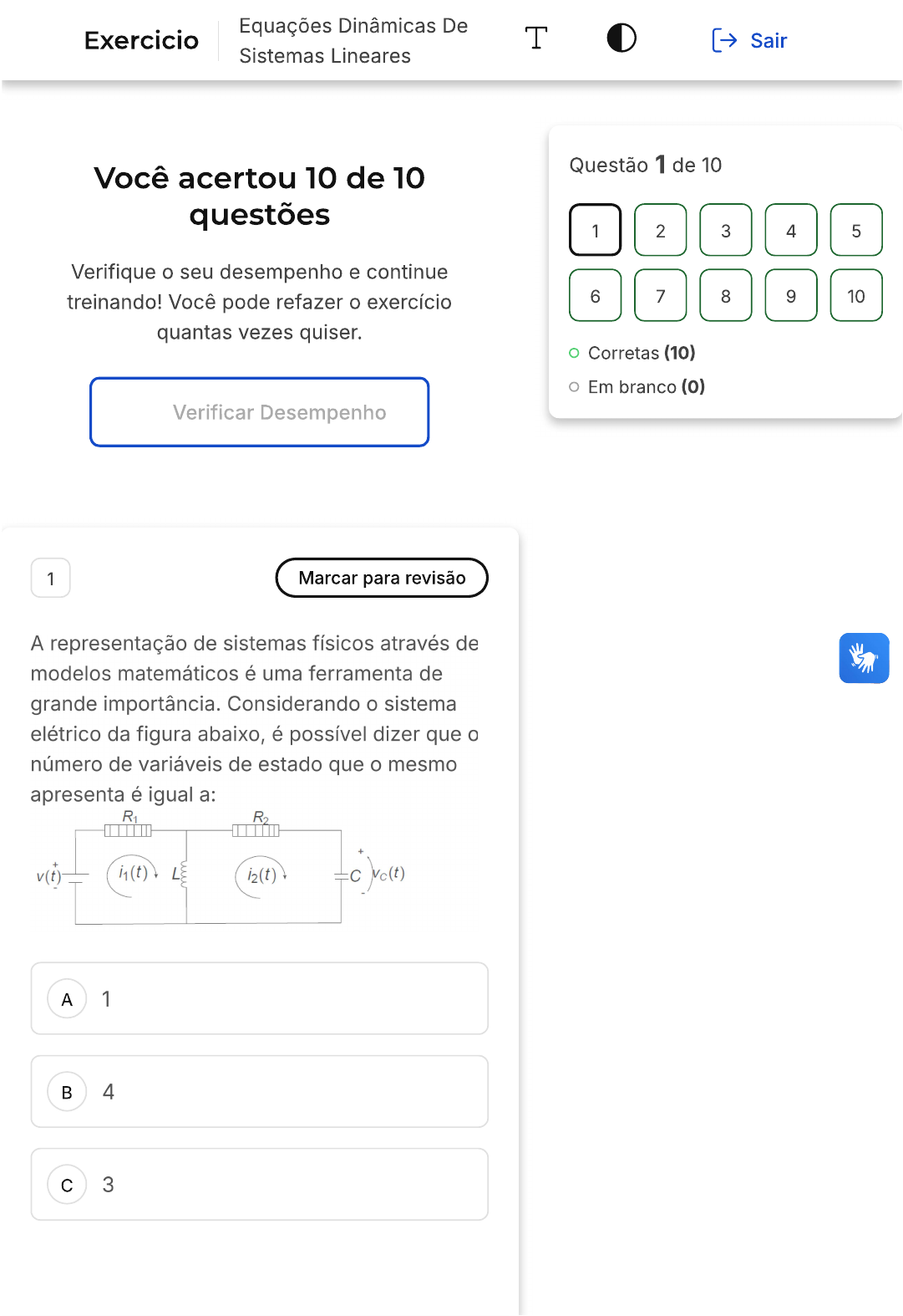 Equações Dinâmicas De Exercicio T Sair Sistemas Lineares Questão 1 de 10 Você acertou 10 de 10 questões 1 2 3 4 5 Verifique o seu desempenho e continue treinando! Você pode refazer o exercício 6 7 8 9 10 quantas vezes quiser. Corretas (10) Em branco (0) Verificar Desempenho 1 Marcar para revisão A representação de sistemas físicos através de modelos matemáticos é uma ferramenta de grande importância. Considerando o sistema elétrico da figura abaixo, é possível dizer que o número de variáveis de estado que o mesmo apresenta é igual a: R R2 v(t) C A 1 B 4 C 3D 5 E 2 Resposta correta Parabéns, você selecionou a alternativa correta. Confira o gabarito comentado! Gabarito Comentado Gabarito: 2 Justificativa: Como o sistema apresenta dois elementos passivos armazenadores de energia (um capacitor e um indutor) é seguro afirmar que a representação no espaço de estado possuirá 2 variáveis de estado. 2 Marcar para revisão Assegurar a estabilidade em um sistema é uma questão fundamental em qualquer projeto de sistema de controle. critério de estabilidade de Routh-Hurwitz é uma metodologia fundamental para analisar a estabilidade de sistemas dinâmico lineares. De acordo com a Tabela de Routh que representa a simplificação da tabela do polinômio abaixo, é possível afirmar que o sistema descrito por esse polinômio apresenta: 2s3 + 3s2 + 4s + 5 s4 1 3 5 1 2 0 1 5 -3 5A 2 pólos no semiplano direito B 2 pólos no semiplano esquerdo C 1 pólo no semiplano direito D 1 pólo no semiplano esquerdo E 2 pólos na origem do sistema Resposta correta Parabéns, você selecionou a alternativa correta. Confira o gabarito comentado! Gabarito Comentado Gabarito: 2 pólos no semiplano direito Justificativa: Como o sistema apresenta 2 mudanças de sinal, é possível concluir que o mesmo apresenta 2 pólos no semiplano direito. Ainda seria possível determinar os pólos do polinômio: S1 = 0,2878 + S2 = 0,2878 - 1,4161i S3 = - -1,2878 + 0,85791 - 3 Marcar para revisãoA representação de sistemas físicos através de modelos matemáticos é uma ferramenta de grande importância. Considere o sistema massa - mola da Figura baixo. Por meio da sua equação característica é possível definir que esse sistema possui um número de variáveis de estado igual a: Atrito com a parede k b M A 2 B 3 C 1 D 4 E Resposta correta Parabéns, você selecionou a alternativa correta. Confira o gabarito comentado! Gabarito Comentado Gabarito: 2Justificativa: Observando-se o sistema é possível identificar uma força u(t) sendo aplicada sobre o conjunto massa-mola. Essa força promove o deslocamento (y(t)) do conjunto e a consequente distensão da mola, sendo o esforço atenuado pelo atrito com a parede. Dessa maneira, é possível montar a equação da seguinte maneira: Força - esforço da mola - atrito = força resultante dy(t) dt Com duas diferenciais esse sistema possui 2 variáveis de estado. 4 Marcar para revisão Assegurar a estabilidade em um sistema é uma questão fundamental em qualquer projeto de sistema de controle. Considere a função de transferência de um sistema simples de ordem 1 abaixo. Através dela é possível afirmar que: y(s) 1 u(s) (s-a) A estável se a 0 entrada/saída.D instável se a > 0 entrada. E estável se instável se a : 0 saída. Resposta correta Parabéns, você selecionou a alternativa correta. Confira o gabarito comentado! Gabarito Comentado Gabarito: estável se aA 1 B 2 C 5 D 3 E 4 Resposta correta Parabéns, você selecionou a alternativa correta. Confira gabarito comentado! Gabarito ComentadoGabarito: 2 Justificativa: Observando-se o sistema é possível identificar uma força f(t) sendo aplicada sobre o conjunto mecânico. Essa força promove o deslocamento (x(t)) do conjunto e a consequente distensão da mola e de um amortecedor. Vale destacar que o atrito não está sendo considerado Dessa maneira, é possível montar a equação da seguinte maneira: Força - esforço da mola - amortecedor = força resultante dx(t) dt Com duas diferenciais esse sistema possui 2 variáveis de estado. 6 Marcar para revisão Considerando-se a classificação das equações diferenciais quanto a ordem da derivada de maior grau, é possível dizer que a equação diferencial abaixo é de: 1 A primeira ordem B segunda ordem C quarta ordemD terceira ordem E ordem única Resposta correta Parabéns, você selecionou a alternativa correta. Confira o gabarito comentado! Gabarito Comentado Gabarito: quarta ordem Justificativa: Como a ordem da equação diferencial é definida pela sua derivada de maior ordem, as únicas derivadas da equação são e y' apresentam a maior ordem da equação (ordem 4), essa equação diferencial possui a mesma ordem dessas duas derivadas: quarta ordem ou ordem 4. 7 Marcar para revisão Assegurar a estabilidade em um sistema é uma questão fundamental em qualquer projeto de sistema de controle. Considerando as representações da posição da raiz de um sistema na figura abaixo, é possível afirmar que os sistemas a; b e C são, respectivamente: Im(z) (a) Im(z) (b) Im(z) (c) a 0 Re(z) a=0 Re(z) 0 a Re(z) SPE SPD SPE SPD SPE SPD(a) instável; (b) estável e (c) A indiferente (a) indiferente; (b) instável e (c) B estável (a) estável; (b) instável e (c) C indiferente (a) estável; (b) indiferente e (c) D instável (a) indiferente; (b) estável e (c) E instável. Resposta correta Parabéns, você selecionou a alternativa correta. Confira o gabarito comentado! Gabarito Comentado Gabarito: (a) estável; (b) indiferente e (c) instável. Justificativa: Na Figura (a) a raiz no semiplano esquerdo confirma a estabilidade do sistema. Já, na figura (b) a raiz na origem não afeta o comportamento do sistema por ser nula. Por fim, na figura (c) a raiz no semiplano direito torna o sistema instável 8 Marcar para revisãoAssegurar a estabilidade em um sistema é uma questão fundamental em qualquer projeto de sistema de controle. O critério de estabilida