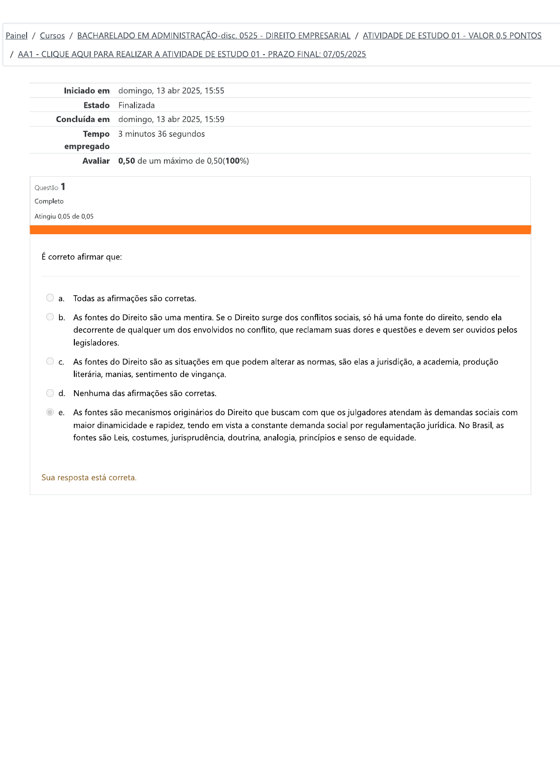 Painel / Cursos / BACHARELADO EM ADMINISTRAÇÃO-disc 0525 - DIREITO EMPRESARIAL / ATIVIDADE DE ESTUDO 01 VALOR 0,5 PONTOS / AA1 - CLIQUE AOUI PARA REALIZAR A ATIVIDADE DE ESTUDO 01 - PRAZO FINAL: 07/05/2025 Iniciado em domingo, 13 abr 2025, 15:55 Estado Finalizada Concluída em domingo, 13 abr 2025, 15:59 Tempo 3 minutos 36 segundos empregado Avaliar 0,50 de um máximo de 0,50(100%) Questão 1 Completo Atingiu 0,05 de 0,05 É correto afirmar que: a. Todas as afirmações são corretas. b. As fontes do Direito são uma mentira. Se o Direito surge dos conflitos sociais, só há uma fonte do direito, sendo ela decorrente de qualquer um dos envolvidos no conflito, que reclamam suas dores e questões e devem ser ouvidos pelos legisladores. C. As fontes do Direito são as situações em que podem alterar as normas, são elas a jurisdição, a academia, produção literária, manias, sentimento de vingança. d. Nenhuma das afirmações são corretas. e. As fontes são mecanismos originários do Direito que buscam com que os julgadores atendam às demandas sociais com maior dinamicidade e rapidez, tendo em vista a constante demanda social por regulamentação jurídica. No Brasil, as fontes são Leis, costumes, jurisprudência, doutrina, analogia, princípios e senso de equidade. Sua resposta está correta.Questão 2 Completo Atingiu 0,05 de 0,05 Relação jurídica é: a. Nenhuma das afirmativas está correta. b. Vínculo estabelecido e regulado de maneira legal entre dois ou mais sujeitos envolvidos em uma situação em que ambos tenham determinados interesses, e que dela decorra efeitos jurídicos em que um dos sujeitos tem direitos (sujeito ativo) e o outro obrigações (sujeito passivo). C. Relação jurídica é aquela pela qual o estado controla a sociedade. A força que a Lei tem sobre o povo é que é chamada relação jurídica. estado, portanto, sempre é sujeito ativo (pois a ele interessa todos os direitos) e a população sempre será sujeito passivo da relação (pois a ela incumbe todas as obrigações, como a declaração de tributos, por exemplo). d. Todas as afirmativas estão corretas. e. Relação jurídica é a relação existente entre os juízes, promotores e advogados. Quem já participou de uma audiência sabe o quando eles são amigos e mantém entre si relações de amizade e apreço. Sua resposta está correta. Questão 3 Completo Atingiu 0,05 de 0,05 Das situações abaixo, quais podem ser consideradas relações jurídicas? 1) Relação de compra e venda entre duas empresas; 2) Relação entre o estado como credor de tributos e as empresas como devedoras desses tributos; 3) Casamento entre duas pessoas; 4) Relação entre a empresa de energia elétrica e um aviário de frango que usa essa energia em seus maquinários; 5) Relação íntima em que um dos envolvidos envia fotos íntimas a outro sob a promessa de não divulgação de referidas imagens. Assinale a alternativa correta: a. Todas as alternativas estão corretas. b. Estão incorretas somente as alternativas 3 e 5. C. Todas as alternativas estão incorretas. d. Estão corretas somente as alternativas 2, 3 e 5. e. Estão corretas somente as alternativas 1 e 4. Sua resposta está correta.Questão 4 Completo Atingiu 0,05 de 0,05 Sobre a EIRELI, assinale a alternativa correta: a. Nunca terá a personalidade jurídica desconsiderada, haja vista que seu capital social integralizado é de 100 salários mínimos. b. Não é sociedade de responsabilidade limitada. C. Nenhuma das alternativas está correta. d. Não tem relação com empreendedores individuais. e. É uma sociedade unipessoal de responsabilidade limitada. Sua resposta está correta. Questão 5 Completo Atingiu 0,05 de 0,05 Sobre princípio, é correto afirmar que: a. princípio da irretroatividade diz que a Lei não pode, em hipótese alguma, atingir fatos e eventos passados, mesmo na ausência total de riscos de Dano ao contribuinte, extinção de direitos, restrição de liberdades ou modificação de coisa julgada. b. O princípio da obrigatoriedade diz que publicada uma lei, e passado o prazo da vacatio legis, tal lei passa a valer para todos. Ou seja, TODOS devem obedecê-la. Ninguém pode se escusar de cumprir a Lei alegando desconhecimento ou conhecimento equivocado. Em outras palavras, a ignorância da Lei ou a interpretação equivocada não é justificativa para desobedecê-la. C. princípio da obrigatoriedade é falho, tendo em vista que vivemos em um país livre e cada um pode fazer o que quiser, mesmo que não autorizado por lei, sendo fascista a vontade do estado de submeter todos os cidadãos ao regime inflexível e falho das Leis. d. Os princípios da obrigatoriedade dizem que em regra, a Lei não atinge, em hipótese alguma, fatos e eventos que já passaram. Ela passa a valer dali para frente somente, ou seja, dali pra frente todos são obrigados a cumprir o dispositivo legal. e. princípio da irretroatividade diz que em regra, nos casos em que não cause danos ao contribuinte, extinga direitos nem restrinja a liberdade dos indivíduos a Lei não pode retroagir e atingir fatos e eventos passados. Porém, uma norma pode retroagir para atingir fatos passados sempre que o legislador quiser e a população pedir, conforme artigo 5°, inciso XXXVI da constituição federal. Sua resposta está correta.Questão 6 Completo Atingiu 0,05 de 0,05 Segundo a teoria da empresa toda e qualquer atividade pode ser considerada empresária: a. Todas as alternativas estão corretas. b. Nenhuma das alternativas está correta. C. Atividades ilegais também podem ser consideradas atividades empresárias, pois conjugam os fatores de produção, bem como são exercidas com impessoalidade. Não é à toa que muitos especialistas chamam o crime organizado de a "empresa do crime" ou o "negócio do tráfico". d. Desde que lícita e que conjugue os fatores de produção, e a atividade prestada não seja de caráter pessoal (não seja uma atividade intelectual, de n