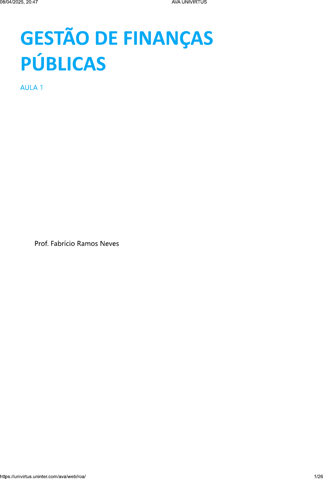 08/04/2025, 20:47 AVA UNIVIRTUS GESTÃO DE FINANÇAS PÚBLICAS AULA 1 Prof. Fabrício Ramos Neves https://univirtus.uninter.com/ava/web/roa/ 1/2608/04/2025, 20:47 AVA UNIVIRTUS CONVERSA INICIAL Caro aluno, nesta disciplina vamos apresentar assuntos interessantes que impactam a nossa vida. Você é nosso convidado para refletir sobre temas que dizem respeito à gestão das finanças públicas. Vamos lá? Começamos com uma pergunta: quando começa a nossa relação com setor público? Bem, o setor público está associado à prestação de serviços pelo Estado, aos cidadãos de um país. Desde o momento em que acordamos, nos relacionamos com diversos serviços prestados pelo Estado, de forma direta ou indireta: ao acordar, ligamos o interruptor para iluminar a casa, vamos tomar banho, escovar os dentes, fazer e tomar café da manhã e nos preparamos para sair (para o trabalho ou para os estudos). Depois, pegamos o transporte público ou nosso veículo próprio e chegamos ao nosso destino matinal. Consegue perceber quando começa a nossa relação com setor público? CONTEXTUALIZANDO Em todas essas atividades, o Estado está envolvido: na produção própria ou na concessão de energia elétrica; no fornecimento de água encanada e no saneamento básico; no transporte público ou mesmo na construção e manutenção das vias públicas. Com o entendimento de como funciona o Estado, de como as decisões públicas são definidas e de como as finanças públicas afetam a situação econômica e social das empresas e pessoas, esperamos que você possa também entender e participar das decisões políticas do País de forma mais consciente. Nas aulas seguintes, vamos discutir os aspectos gerais da Administração Pública e seus princípios, apresentar algumas teorias, entender de que forma os governos podem alocar seus recursos, como podem ser organizados os orçamentos e suas fontes normativas. https://univirtus.uninter.com/ava/web/roa/ 2/2608/04/2025, 20:47 AVA UNIVIRTUS A intenção é que, ao final das nossas aulas, você veja as questões de finanças públicas com outros olhos. TEMA 1 - ADMINISTRAÇÃO PÚBLICA E PRINCÍPIOS DA ADMINISTRAÇÃO PÚBLICA Definir conceitualmente a Administração Pública não é uma tarefa das mais fáceis, dada a sua complexidade e amplitude de atividades em que ela se faz presente em nosso cotidiano. Procuro ser o mais sucinto possível, mas sem deixar de apresentar as ideias básicas para a evolução do pensamento em relação ao assunto. Bobbio, Mattteucci e Pasquino (1986, p. 10), afirmam que "a expressão Administração Pública designa o conjunto das atividades diretamente destinadas à execução concreta das tarefas ou incumbências consideradas de interesse público ou comum, numa coletividade ou organização estatal". No nosso bate-papo inicial, começamos mostrando que a nossa relação com Estado está em praticamente todos os níveis. Temos, de forma direta ou indireta, a participação do Estado na nossa vida. Dessa maneira, é possível pensar que o sentido da Administração Pública está relacionado à totalidade de serviços e entidades ligadas ao Estado que buscam satisfazer o bem de uma coletividade (Meirelles, 2004). Assim, a Administração Pública não pode se confundir apenas como uma função administrativa, pois é mais ampla e se refere ao Estado de maneira geral. Por exemplo, juiz (representante do poder judiciário) emite, além do julgamento legal, uma série de atos administrativos relacionados aos servidores que estão no seu órgão - o que nos parece ser bem simples. Se pensamos na realização de obras públicas como estradas, hidrelétricas, ferrovias, portos ou aquelas relacionadas ao provimento de serviços de educação, da saúde da população ou o apoio à ciência e tecnologia, a Administração Pública se torna bem mais complexa. Para Meirelles (1993, p. 56-61), "a Administração é o instrumental de que dispõe o Estado para pôr em prática as opções políticas de governo". Para realizar suas atividades, o Estado pode agir sendo: unitário ou centralizado; https://univirtus.uninter.com/ava/web/roa/ 3/2608/04/2025, 20:47 AVA UNIVIRTUS federativo ou descentralizado. No formato unitário, prevalece uma gestão centralizada tanto política quanto administrativa; no segundo formato, o Estado Federativo - como no caso do Brasil de hoje - possui autonomias que lhes são próprias, dividindo responsabilidades de atuação, não sendo suas competências (administrativas, legislativas e políticas) diminuídas ou mesmo unilateralmente retiradas pelo poder central, como em um Estado Centralizado. No Brasil, a Administração Pública pode ser organizada tanto por uma administração direta quanto indireta. No nível da União, a administração direta inclui os serviços desempenhados pelos seus Ministérios. A administração indireta (ou administração descentralizada) inclui as diversas autarquias (como as Universidades Federais), fundações públicas (como a Funai), sociedades de economia mista (como Banco do Brasil) e empresas públicas (como a Caixa Econômica Federal) que desempenham diversos serviços públicos. O Decreto-Lei n. 200/1967, que trata sobre a organização da Administração Federal, define que as entidades da Administração Direta possuem personalidade jurídica e patrimônio próprios. Mas para realizar suas atividades, tanto a administração direta quanto a indireta devem seguir os normativos legais e seus princípios para a realização de suas atividades públicas. Esse ordenamento está bem definido no art. 37 da Constituição Federal de 1988. Art. 37. A administração pública direta e indireta de qualquer dos Poderes da União, dos Estados, do Distrito Federal e dos Municípios obedecerá aos princípios de legalidade, impessoalidade, moralidade, publicidade e eficiência e, também, ao seguinte: (Redação dada pela Emenda Constitucional n. 19, de 1998) (Brasil 1988) 1.1 PRIN