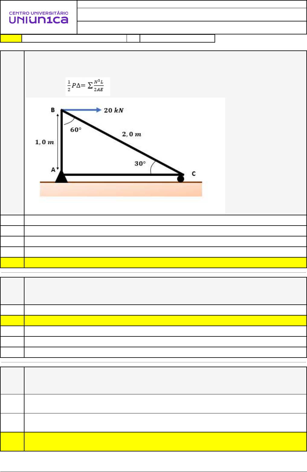 1/313/04/2025 10:10:40 REVISÃO DE SIMULADO Disciplina: Mecânica dos Sólidos II Respostas corretas são marcadas em amarelo X Respostas marcardas por você. Questão 001 A treliça de três barras na Figura abaixo está sujeita a uma força horizontal de 20 kN. Se a área da seção transversal de cada elemento estrutural for 100 mm2, determine o deslocamento horizontal no ponto B. E= 200 GPa. (Utilizar o princípio da conservação da energia). A) 2,55 mm B) 7,26 mm C) 5,25 mm D) 0,5 mm X E) 4,73 mm Questão 002 Qual dos seguintes princípios fundamentais é utilizado nos métodos de energia na mecânica dos sólidos para analisar e resolver problemas relacionados ao equilíbrio de estruturas e às deformações resultantes? A) Princípio da deformação elástica. X B) Princípio do trabalho virtual. C) Princípio da conservação da energia. D) Princípio do equilíbrio estático. E) Princípio da resistência dos materiais. Questão 003 De acordo com o teorema de Castigliano, qual é a relação entre o deslocamento elástico em um ponto específico de uma estrutura e a derivada parcial da energia de deformação em relação à força conjugada a esse deslocamento? A) O deslocamento elástico é o resultado da integral da energia de deformação em relação à força conjugada. B) O deslocamento elástico é inversamente proporcional à derivada parcial da energia de deformação. X C) O deslocamento elástico é diretamente proporcional à derivada parcial da energia de deformação. Nome: 13/04/2025 10:10:40 2/3 D) O deslocamento elástico não tem relação com a derivada parcial da energia de deformação. E) O deslocamento elástico é igual à derivada parcial da energia de deformação. Questão 004 Um dos dois parafusos de aço de alta resistência A e B mostrados na Figura abaixo deve ser escolhido para suportar uma carga de tração repentina. Para escolher, é necessário determinar a maior quantidade de energia de deformação elástica que cada parafuso pode absorver. O parafuso A tem diâmetro de 20 mm por 50 mm de comprimento e diâmetro de rosca (ou menor diâmetro) de 18 mm dentro da região rosqueada de 6 mm. O parafuso B tem roscas 'recalcadas', de modo tal que o diâmetro em todo o seu comprimento de 56 mm pode ser considerado como 18 mm. Em ambos os casos, despreze o material extra que compõe as roscas. Considere EAço=210×103 MPa, e σe=310 MPa. Qual parafuso deverá ser escolhido? X A) Parafuso A. Pois este absorve mais energia na fase elástica do que o parafuso B. B) Parafuso B. Pois este é mais frágil, portanto, absorve mais energia na fase elástica. C) Parafuso A. Pois possui maior dureza. D) Parafuso A. Pois este absorve menos energia na fase elástica do que o parafuso B. E) Parafuso B. Pois este absorve maior energia na fase elástica. Questão 005 De acordo com o Teorema dos Trabalhos Mínimos, qual é o critério utilizado para determinar a configuração estática de uma estrutura? A) A configuração estática é aquela em que a soma dos momentos virtuais externos e internos é igual a zero. B) A configuração estática é aquela em que a soma das tensões virtuais externas e internas é igual a zero. C) A configuração estática é aquela em que a soma das deformações virtuais externas e internas é igual a zero. D) A configuração estática é aquela em que a soma dos deslocamentos virtuais externos e internos é igual a zero. X E) A configuração estática é aquela em que a soma dos trabalhos virtuais externos e internos é igual a zero. Questão 006 Com relação ao Teorema de Castigliano, marque a alternativa INCORRETA: 13/04/2025 10:10:40 3/3 X A) Esse método, denominado segundo teorema de Castigliano, pode ser aplicado a corpos que apresentem variações de temperatura, inclusive em corpos que não apresentam linearidade entre tensão e deformação na fase elástica. B) O Teorema de Castigliano estabelece que o deslocamento elástico em uma determinada direção é proporcional à derivada parcial da energia de deformação em relação à força aplicada na mesma direção. C) Por ser uma ferramenta poderosa para determinar os deslocamentos em estruturas complexas sem a necessidade de resolver sistemas de equações diferenciais, o teorema de Castigliano é particularmente útil quando se tem interesse em calcular o deslocamento em um ponto específico da estrutura, enquanto todas as outras variáveis são mantidas constantes. D) O teorema de Castigliano se baseia no conceito de energia de deformação elástica armazenada em uma estrutura quando esta for submetida a carregamentos. E) O teorema de Castigliano é um princípio importante na mecânica dos sólidos que permite determinar deslocamentos ou rotações específicas em uma estrutura através do cálculo de derivadas parciais dos deslocamentos elásticos em relação às forças ou momentos aplicados. Questão 007 O teorema de Castigliano é um princípio importante na mecânica dos sólidos que permite determinar deslocamentos ou rotações específicas em uma estrutura através do cálculo de derivadas parciais dos deslocamentos elásticos em relação às forças ou momentos aplicados. Qual é o princípio fundamental do teorema de Castigliano na análise estrutural? A) O deslocamento elástico pode ser obtido derivando a energia de deformação em relação à força conjugada. B) O deslocamento elástico é proporcional à força aplicada na mesma direção. C) O teorema de Castigliano é aplicável apenas a estruturas não lineares. D) A energia de deformação é diretamente proporcional à força aplicada. X E) O teorema de Castigliano é válido apenas para estruturas com comportamento elástico não linear. Questão 008 De acordo com o teorema dos trabalhos mínimos, qual é a condição de equilíbrio para uma estrutura em análise? A) A soma dos trabalhos virtuais internos é mínima. X B) A soma dos trabalhos virtuais internos é igual à soma dos trabal