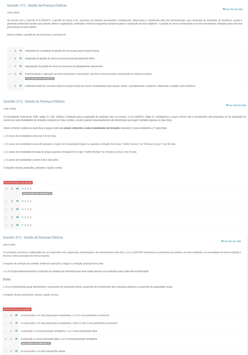 Questão 1/12 Gestão de Finanças Públicas Ler em alta Leia texto: De acordo com Decreto a gestão de riscos é um "processo de natureza direcionado e monitorado pela alta que contempla as atividades de identificar, avaliar e gerenciar potenciais eventos que possam afetar destinado a fornecer segurança razoável quanto à realização de seus A gestão de riscos corresponde um dos mecanismos utilizados para uma boa governança no setor público. Nesse sentido, gestão de riscos envolve principio de A Utilização dos resultados da gestão de riscos para prever ações futuras Integração da gestão de riscos ao processo de planejamento Segregação da gestão de riscos do processo de planejamento operacional Implementação e aplicação de forma oportuna e documentada, subordinada ao interesse assinalou essa E Estabelecimento de controles externos proporcionais aos riscos considerando suas causas, consequências e observada a relação Questão 2/12 Gestão de Finanças Públicas Ler em voz alta Leia texto: A Constituição Federal de artigo 37. XXI, instituiu a licitação para a aquisição de qualquer bem ou A Lei artigo estabeleceu o prazo mínimo até recebimento das propostas ou da realização do evento de cada modalidade de licitação contados em dias exceto quando expressamente a lei determinar que sejam contados apenas os dias Neste contexto, analise as assertivas a seguir sobre os prazos referente a cada modalidades de licitação marcando V para verdadeira F para prazo da modalidade concurso é de 45 prazo da modalidade concorrência para regime de empreitada integral ou quando a licitação for do tipo "melhor técnica" ou "técnica é de 30 prazo da modalidade tomada de preços quando a licitação for do tipo "melhor técnica" ou "técnica preço é de 30 prazo da modalidade convite é de 5 dias A respeito dessas assinale opção não essa questão A V. Você B V.V.F.F C D E F. Questão 3/12 Gestão de Finanças Públicas Ler em alta Leia texto: Os principios permitem a elaboração de um orçamento mais padronizado e de entendimento mais A Lei 4.320/1964 estabelece os principios da da universalidade e da anualidade de forma explicita e diversos outros de forma A respeito do principio da avalie as asserções seguir relação proposta entre Lei Orçamentária Anual fere da unidade que determina que deve existir apenas um orçamento para cada ente da Porque A Lei Orçamentária Anual desmembra orçamento em orçamento orçamento de investimento das empresas públicas orçamento da seguridade A respeito dessas assina opção Você não pontuou essa questão A As asserções I são proposições verdadeiras, e uma justificativa correta da B As asserções II são proposições mas all não uma justificativa correta da A asserção uma proposição verdadeira, e uma proposição falsa. D A asserção uma proposição falsa, uma proposição verdadeira E As asserções são proposiçõesQuestão 4/12 Gestão de Finanças Públicas Ler em alta Leia texto: As finanças públicas correspondem a capacidade de arrecadação de recursos pelo Estado a utilização dos recursos arrecadados para atender às necessidades da sociedade A intervenção do governo foi necessária para ajustar as falhas de mediante estudo de suas tributação dos gastos Nesse sentido, as falhas de mercado ocorrem A mercado gera riscos significativos para os Você assinalou essa alternativa B A concorrência os preços regulam mercado de forma C mercado aloca os recursos atendendo as necessidades da D o consumidor produtor possuem informações suficientes para realizarem E mercado proporciona entrada de novos produtores mesmo existindo vários produtores com produtos Questão 5/12 Gestão de Finanças Públicas 40 Ler em alta Leia texto Normas Brasileiras de Auditoria do Setor Público (NBASP) são emitidas pelo Instituto Rui Barbosa Instituto é uma associação civil criada pelos próprios Tribunais de Contas do Brasil no ano de 1973 com objetivo de ajudar academicamente os Tribunais no desenvolvimento e aprimoramento das suas os Tribunais adotam como diretrizes as normas profissionais de âmbito global emitidas pela Organização Internacional de Entidades Fiscalizadoras Superiores (International Organization of Supreme Audit Institutions INTOSAI) Essas diretrizes se dividem em três níveis Nesse associe os níveis das diretrizes as suas definições utilizando (1) para Nível (2) para Nível (3) para Nível 3. conjunto básico de normas emitidas pelo Instituto Rui Barbosa Determinam os fundamentos dos trabalhos de auditoria operacional e de conformidade do setor Explicitam os pressupostos para adequado funcionamento dos tribunais de contas brasileiros e os básicos de execução dos trabalhos Assinale a alternativa que apresenta a classificação correta de cima para baixo: A B C D E 3. 1.2 Questão 6/12 Gestão de Finanças Públicas Ler em alta Leia texto: A administração direta indireta deve seguir os normativos legais e seus principios para realização de suas atividades Não existe hierarquia na aplicação dos Todos os sejam eles expressos ou devem ser respeitados durante atividade do agente Sendo assim, analise as assertivas seguir sobre os principios expressos e assinale a alternativa principio da legalidade estabelece que os atos do agente público estejam estritos à II. principio da impessoalidade determina que agente público deve tratar todos de forma III. principio da moralidade pressupõe que conduta praticada pelo agente público deve estar de acordo com bom senso, bons costumes e com a principio da eficiência compreende dever do agente público de manter transparência da Administração Assinale alternativa correta: A Apenas estão corretas B Apenas II III estão Apenas IV estão D Apenas III estão E Apenas IV estãoQuestão 7/12 Gestão de Finanças Públicas Ler em voz alta Leia texto A licitação é uma regra pelo artigo XXI, da Constituição Federal de 1988 para a aquis