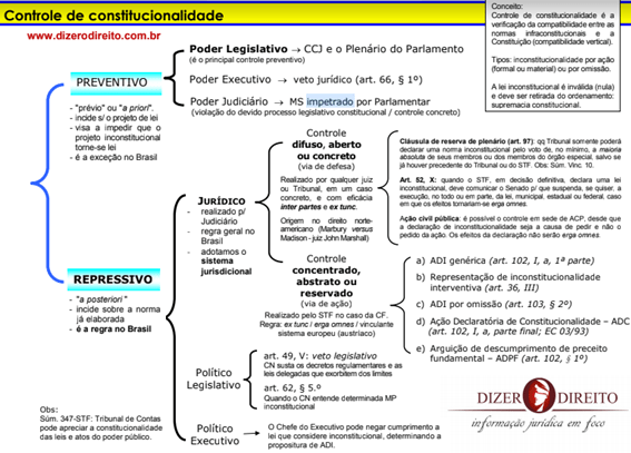 Controle de constitucionalidade Controle de constitucionalidade a verificação da entre as normas a Poder Legislativo CCJ e do Parlamento (é principal controle preventivo) Tipos inconstitucionalidade por ação (formal ou material) ou por PREVENTIVO Poder Executivo veto jurídico (art. 66, § 1°) A lei inconstitucional é inválida (nula) deve ser retirada do Poder Judiciário MS impetrado por Parlamentar ou "a supremacia constitucional (violação do devido processo legislativo constitucional / controle concreto) incide projeto de visa a que Controle projeto inconstitucional difuso, aberto de reserva de 97) 00 Tribunal somente poderá lei uma inconstitucional pelo no a exceção no Brasil ou concreto absolute de seus membros ou dos membros do especial salvo (via de defesa) houver precedente do Tribunal ou do STF Obs Vinc 10 Realizado por qualquer juiz 52 quando em decisão uma ou Tribunal em um caso comunicar 0 Senado que suspenda a JURÍDICO com eficácia no todo ou em da municipal estadual ou federal caso realizado inter partes e tomariam Judiciário no direto Ação civil pública possível 0 controle em sede de desde americano (Marbury versus declaração de seja a causa de pedir . não regra geral no Brasil Madison John pedido da ação Os efeitos da declaração não serão erga adotamos sistema Controle a) ADI genérica (art. 102, a, parte) jurisdicional concentrado, REPRESSIVO abstrato ou b) Representação de inconstitucionalidade interventiva (art. 36, III) reservado (via de ação) incide sobre a c) ADI por omissão (art. 103, elaborada Realizado pelo STF no caso da CF Regra: ex fund erga omnes / d) Ação Declaratória de Constitucionalidade ADC a regra no Brasil sistema europeu (austriaco) (art. a, parte final; EC 03/93) e) Arguição de descumprimento de preceito art. 49, V: veto legislativo fundamental ADPF CN susta decretos regulamentares as Político leis delegadas que dos limites Legislativo art. Quando CN entende determinada MP DIZER DIREITO Obs: inconstitucional Sum Tribunal de Contas pode apreciar a constitucionalidade Político Chefe do Executivo pode negar cumprimento a informação juridica em feco das leis e atos do poder Executivo lei que considere determinando a propositura de ADI