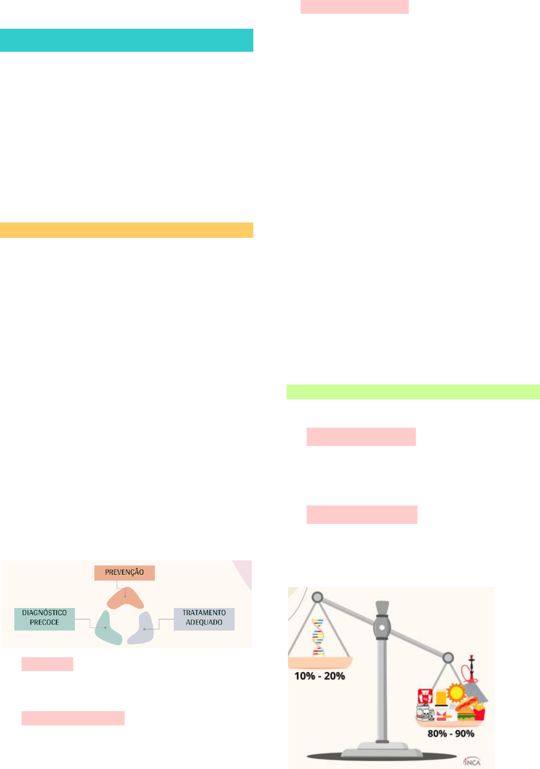 E.D 1 Câncer ⇢ Recebeu essa denominação por ser uma doença parecida com um caranguejo -> vai abraçando os órgãos ✤ Conjunto de mais de 100 doenças, por meio de um processo de hiperplasia celular desordenada que podem invadir partes adjacentes e se espalhar pelo organismo EPIDEMIOLOGIA ➙ Segundo o IARC (agência internacional de pesquisa sobre o câncer), braço direito da OMS, nos próximos 20 anos, a incidência de câncer irá aumentar em 63%, principalmente em países emergentes ➙ 2º principal causa de morte no mundo ➙ 1 a cada 6 mortes está associada a doença ➙ 70% das mortes ocorre em países de baixa a média renda, especialmente na América Latina e Caribe Fatores que influenciam essa incidência nessas regiões: • Maus hábitos alimentares – ultraprocessados • Exposição ocupacional -> produtos, agentes químicos • Péssimas condições de vida -> rotina estressante • Acesso ao sistema de saúde -> mulheres procuram mais e os homens omitem mais os sintomas 1° - PREVENÇÃO = cuidados preventivos para não desenvolver. Mas se a prevenção falha de alguma forma, tem-se o diagnostico precoce 2° - DIAGNÓSTICO PRECOCE = se o método de prevenção falhar, essa segunda etapa é importante no cuidado e tratamento 3° TRATAMENTO ADEQUADO = intervalo correto, tipo de droga correta, resposta do paciente, resposta imunológica, efeitos colaterais, avaliação se há indicação ou não da radioterapia ➔ Imunoterapia para uso de base populacional, não é utilizada pois não funciona para todo mundo. Pode ser que tenha duas pessoas com o mesmo tipo de câncer, no mesmo estágio, mas a nível molecular elas se diferem (marcadores do tipo de tumoração). ➔ É utilizada como última opção, quando a quimio e a radio não surtem efeito, retardando o avanço da doença ➔ Basicamente, ela age interrompendo a replicação das células já doentes ou interrompe o ciclo de mutações (depende do tipo de tumor) ->, porém só se haver expressão no tipo de molécula inclusa nesse método ➔ Mutações são comuns de acontecer em leucemias -> células sanguíneas são muito sensíveis CAUSAS DO CANCER ➙ MULTIFATORIAL ➙ 10-20% causas internas = fatores de risco não modificáveis (genética, hereditariedade) INTERAÇÃO ENTRE ELES ➙ 80-90% causas externas = fatores de risco modificáveis (hábitos alimentares e de vida, tabagismo, alcoolismo, inatividade física, sono) Existem sítios preferenciais para as metástases: ↝ Câncer gástrico -> sítio preferencial: pulmão ↝ Câncer mamário -> sítio preferencial: cérebro e ossos Isso ocorre a nível de DNA, devido as similaridades (afinidade) dos órgãos e tecidos É como se não tivesse afinidade celular e não conseguisse se estabelecer e desenvolver. FATORES DE RISCO MODIFICÁVEIS FATORES DE RISCO NÃO MODIFICÁVEIS RECOMENDAÇÕES GERAIS SOBRE A RELAÇÃO ALIMENTAÇÃO E CÂNCER Gordura Corporal: • Manter o peso corporal entre os limites normais de IMC • Evitar ganho de peso e aumento do perímetro da cintura Atividade física: • Manter-se fisicamente ativo como parte da rotina diária • Fazer diariamente, no mínimo, 30 minutos de atividade física moderada (Ex. Caminhada acelerada) • Limitar hábitos sedentários Alimentos e bebidas que promovem o ganho de peso: • Consumir raramente alimentos com alta densidade energética (225 a 275Kcal/100g) • Evitar bebidas açucaradas e alimentos tipo fast- food Alimentos de origem vegetal: • Consumir diariamente, pelo menos, cinco porções (400g) de verduras e frutas variadas • Consumir cereais pouco processados e/ou leguminosas em todas as refeições • Limitar alimentos processados Alimentos de origem animal: • Consumir menos de 500g de carne vermelha por semana, incluindo pouca ou nenhuma carne processada Bebidas alcoólicas: • Evitar, mas se forem consumidas, o consumo deve ser limitado a 2 drinques por dia para homens e a 1 drinque por dia para mulheres (10 a 15g de etanol) Preservação, processamento e preparo: • Evitar alimentos salgados ou preservados em sal • Limitar a ingestão de sal em menor de 6g/dia (2,4g de sódio) • Não consumir cereais e grãos mofados Suplementos alimentares: • As necessidades nutricionais devem ser alcançadas pela alimentação • Suplementos alimentares não são recomendados para prevenção do câncer Amamentação: • Amamentar exclusivamente as crianças até os 6 meses de idade Sobreviventes de câncer: • Seguir as recomendações de prevenção do câncer • Devem receber assistência nutricional de um profissional devidamente capacitado. - Esse tópico é tão importante quanto a prevenção CONJUNTO INTEGRADO DE RECOMENDAÇÕES NA PREVENÇÃO DO CÂNCER