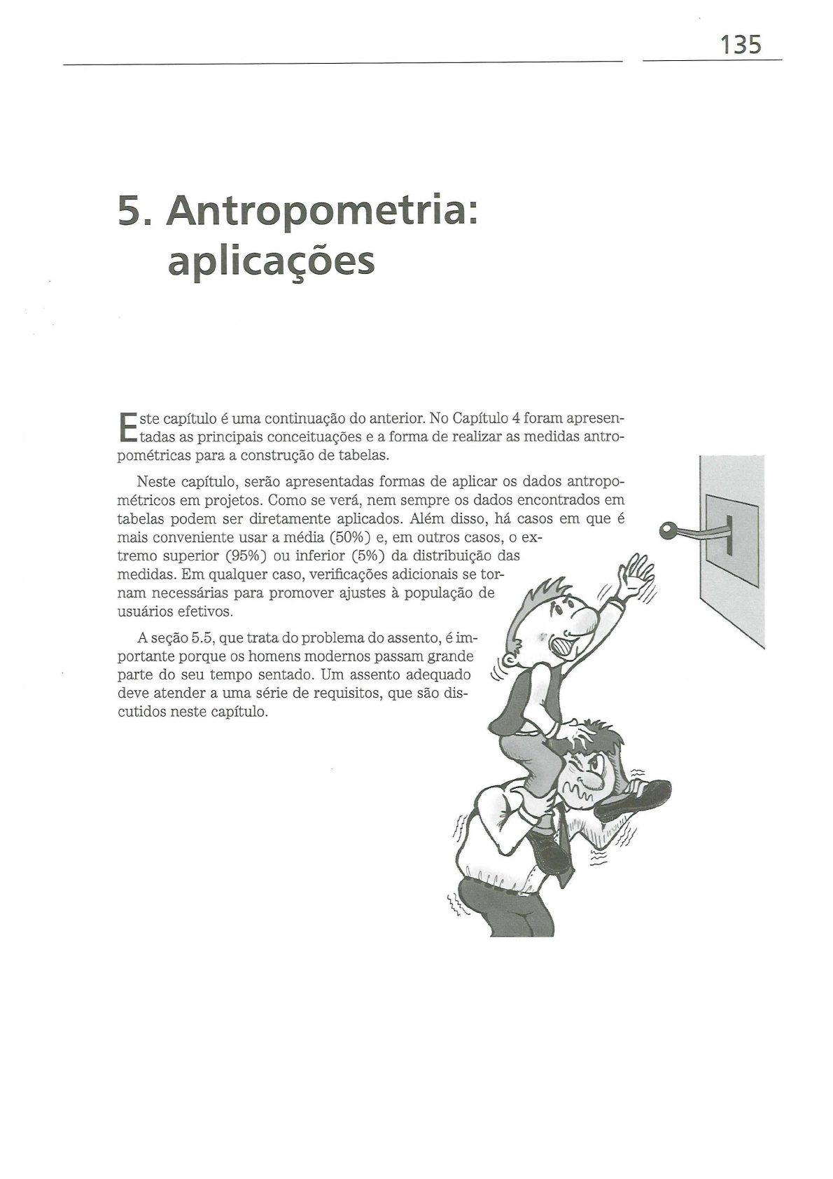 5. Antropometria: aplicações Este capítulo é uma continuação do anterior. No Capítulo 4 foram apresen tadas as principais conceituações e a forma de realizar as medidas antro pométricas para a construção de tabelas. Neste capítulo, serão apresentadas formas de aplicar os dados antropo métricos em projetos. Como se verá, nem sempre os dados encontrados em tabelas podem ser diretamente aplicados. Além disso, há casos em que é mais conveniente usar a média (50%) e, em outros casos, o ex- tremo superior (95%) ou inferior (5%) da distribuição das medidas. Em qualquer caso, verificações adicionais se tor nam necessárias para promover ajustes à população de usuários efetivos. A seção 5.5, que trata do problema do assento, é im portante porque os homens modernos passam grande parte do seu tempo sentado. Um assento adequado deve atender a uma série de requisitos, que são dis cutidos neste capítulo. 135 136 Capítulo 5 - Antropometria: aplicações 5.1 Uso de dados antropométricos Naturalmente, é mais rápido e econômico usar dados antropométricos já disponíveis na bibliografia (veja, por exemplo, os livros do Damon, Stoudt e McFarland, 1971; Croney, 1971; Panero e Zelnik, 1996; e Diffrient, Tilley e Bardagjy, 1974), do que fa zer levantamentos antropométricos próprios. Se isso constitui uma solução prática, por outro lado, deve ser acompanhado de certos cuidados, que serão apresentados a seguir. Uso de tabelas Como já vimos no item 4.3, a maioria das medidas disponíveis foi realizada no exte rior. Portanto, antes de se usar tabelas de medidas antropométricas, é necessário verificar certos fatores que influem nos resultados dessas medidas, tais como: • Etnia - Como já vimos no item 4.1, há diferenças étnicas das medidas antropo métricas, principalmente nas proporções dos diferentes segmentos corporais. • Profissão - Algumas medições foram realizadas no âmbito de certas profissões. Deve-se tomar cuidado especial quando foram realizadas nas forças armadas, de vido ao critério de seleção e a faixa etária dos militares, que se diferenciam da população em geral. • Faixa etária - Como já vimos em 4.1, as medidas e o peso do corpo variam con tinuamente com a idade. • Época - Também já vimos em 4.1 que as medidas antropométricas dos povos evoluem com o tempo. • Condições especiais - Referem-se às condições em que as medidas foram to madas, se as pessoas estavam vestidas, nuas, semi-nuas, com sapatos, descalças e assim por diante. As diferenças antropométricas podem ser facilmente comprovadas com as máqui nas e equipamentos importados que não se adaptam aos operadores brasileiros. No caso das máquinas industriais e postos de trabalho, esse problema pode ser parcial mente resolvido, providenciando-se estrados e banquetas para os operadores, para compensar as diferenças de estaturas. A solução desse problema já fica mais difícil no caso dos alcances horizontais. Um trabalho realizado nessas condições exigirá maiores flexões com o tronco, provocando fadiga. O problema tende a agravar-se no caso das mulheres, porque as diferenças antro pométricas, em relação às populações estrangeiras, costumam ser mais significativas para elas. Portanto, todas essas precauções são necessárias ao usar as tabelas de medidas antropométricas. Na medida do possível, elas deveriam ser usadas apenas para um dimensionamento preliminar do projeto, até a construção de um modelo (mock-up) em tamanho real. Este deveria ser testado com uma população representativa dos usuários efetivos, fazendo-se os ajustes necessários, antes de se passar ao dimensio namento definitivo do projeto. 5.2 - Critério para aplicação dos dados antropométricos Antropometrias estática e dinâmica Outro problema reside na escolha entre antropometrias estática e dinâmica. Para projetos de produtos e equipamentos que exigem relativamente poucos movimen tos, podem ser usados os dados de antropometria estática, inclusive porque são mais facilmente disponíveis. Em equipamentos que exigem maiores movimentos corporais, é conveniente uti lizar os dados da antropometria dinâmica, principalmente para se determinar os al cances e as faixas de movimentos. Antropometria funcional Na antropometria funcional, como o próprio nome sugere, as medidas são associadas à análise da tarefa como já vimos na página 110. Assim, o alcance das mãos pode atingir valores diferentes de acordo com o tipo de ação exercida pela mão, como apertar ou girar um botão, agarrar uma alavanca, colocar um livro na estante, e assim por diante. Os valores das medidas obtidas na antropometria funcional podem apre sentar diferenças em relação à antropometria dinâmica, pois esta última considera cada movimento isoladamente, ou seja, o alcance da mão é medida com o ombro estático. Na prática, os movimentos geralmente aparecem conjugados. Por exemplo, os movimentos dos braços são realizados simultaneamente com os movimentos dos om bros e troncos. Além disso, alguns movimentos são dependentes entre si. Prova disso é que não se consegue erguer o pé direito e girá-lo no sentido horário ao mesmo tem po em que o braço direito faz movimentos anti-horários. Essa conjugação afeta tanto os alcances, como a velocidade e precisão dos movimentos. Portanto, os dados de antropometria estática e dinâmica disponíveis devem ser adaptados às características funcionais de cada posto de trabalho, principalmente no caso em que há diversos movimentos exercidos simultaneamente pelo organis mo. 5.2 Critétrios para aplicação dos dados antropométricos Do ponto de vista industrial, o ideal seria fabricar um único tipo de produto padroni zado, pois isso reduziria os custos. Contudo, do ponto de vista do usuário/consumi dor, isso nem sempre proporciona conforto e segurança. Essa adaptação ao usuário torna-se crítico no caso de produtos de uso individual,