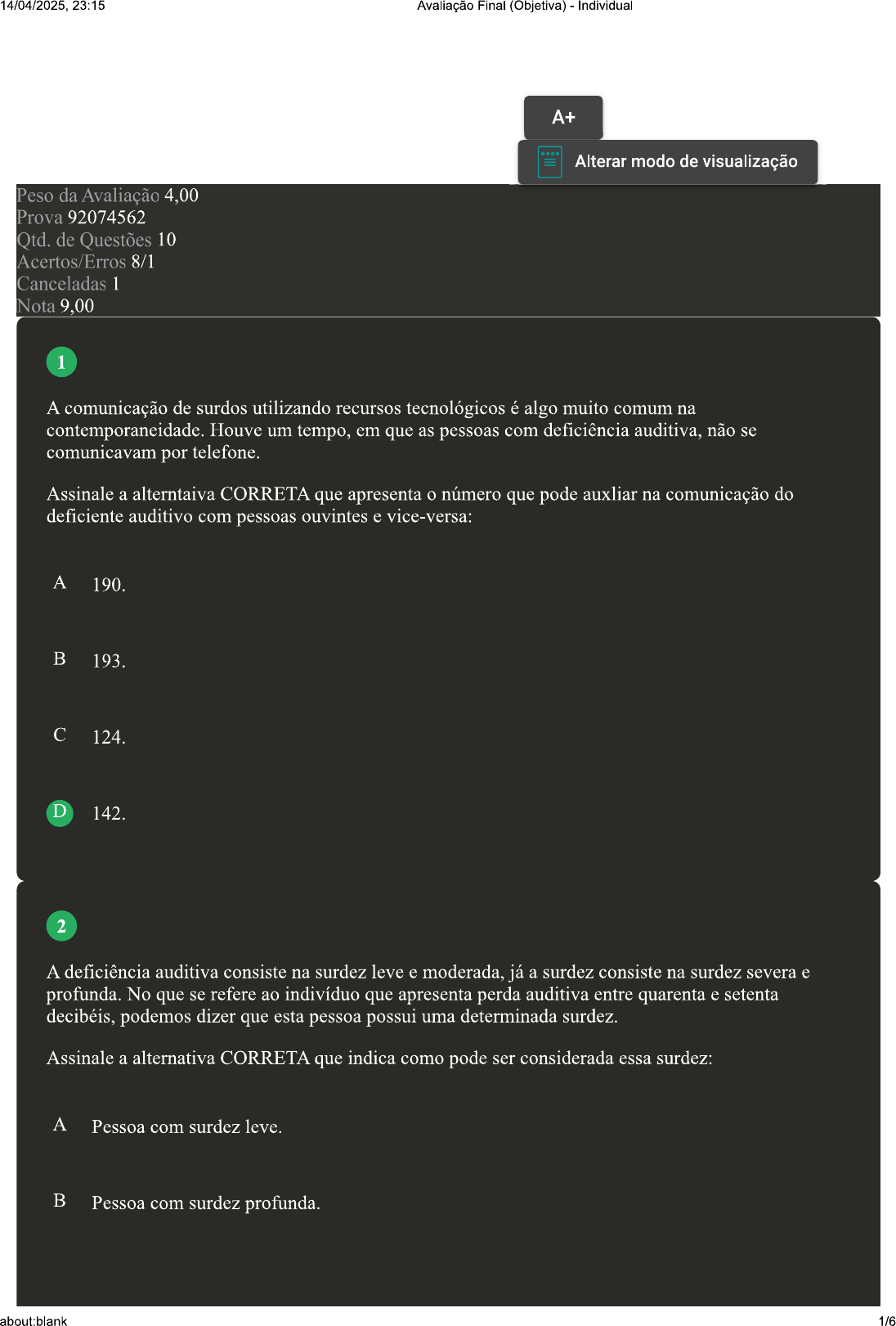 23:15 Avaliação Final (Objetiva) - Individual A+ Alterar modo de visualização Peso da Avaliação 4,00 Prova 92074562 Qtd. de Questões 10 Acertos/Erros 8/1 Canceladas Nota 9,00 1 A comunicação de surdos utilizando recursos tecnológicos é algo muito comum na contemporaneidade. Houve um tempo, em que as pessoas com deficiência auditiva, não se comunicavam por telefone. Assinale a alterntaiva CORRETA que apresenta número que pode auxliar na comunicação do deficiente auditivo com pessoas ouvintes e vice-versa: A 190. B 193. C 124. D 142. 2 A deficiência auditiva consiste na surdez leve e moderada, já a surdez consiste na surdez severa e profunda. No que se refere ao indivíduo que apresenta perda auditiva entre quarenta e setenta decibéis, podemos dizer que esta pessoa possui uma determinada surdez. Assinale a alternativa CORRETA que indica como pode ser considerada essa surdez: A Pessoa com surdez leve. B Pessoa com surdez profunda. about:blank 1/614/04/2025, 23:15 Avaliação Final (Objetiva) - Individual C Pessoa com surdez severa. D Pessoa com surdez moderada. 3 Distante da realidade de outrora, quando indivíduo que nascia com surdez não tinha acesso à educação, seja por opção familiar, rejeição social, falta de investimento governamental para atender essa demanda, atualmente, educandos com essa necessidade educativa, podem e devem ter acesso à escola. Nesse sentido, a gestão escolar necessita tomar algumas providências. Assinale a alternativa CORRETA em relação à ação do gestor escolar quando matricula um aluno surdo na escola: A Dispensar intérprete. Exigir dos seus professores, um tratamento diferenciado para aluno e quando possível, oferece B cursos de capacitação onde os docentes mediante avaliação, são considerados aptos a ensinar alunos surdos. C Procurar imediatamente a Secretaria de Educação do Estado ou do Município. D Entrar em contato com a família para desfazer a matrícula. 4 A construção da língua de sinais segue alguns critérios estabelecidos pela linguística, cabe a nós, enquanto profissionais educacionais ou não, usuários de libras ou termos cautela e levarmos em consideração os tipos de sinais quanto ao quanto à forma, quanto à concordância e quanto à composição. Assinale a alternativa CORRETA quanto à composição: A Lugar e localização. B Icônicos e arbitrários. C Gênero e numeral. about:blank 2/614/04/2025, 23:15 Avaliação Final (Objetiva) Individual D Simples e compostos. Revisar Conteúdo do Livro 5 A sign writing é um sistema de escrita para as línguas de sinais, da mesma forma que os sistemas alfabéticos foram construídos a partir das línguas orais. A diferença está na forma que individuo vai grafar seus pensamentos, que diferente das línguas orais segue uma estrutura totalmente visual. "O sign writing, como sistema de escrita das línguas de sinais, é formado por quiremas, da mesma forma que os fonemas formam as palavras das línguas orais" (CAPOVILLA; 2001, p. 55). Sobre a escrita sign writing, analise as sentenças a seguir: I- Aprender essa escrita representa a possibilidade de uma alfabetização e letramento em língua de sinais por meio de um registro gráfico. Esse sistema não apresenta sons, mas sim parâmetros fonológicos e sintáticos da língua de sinais. III- Esse sistema não apresenta importância alguma para a cultura e para fortalecimento linguístico das línguas de sinais. Assinale a alternativa CORRETA: FONTE: CAPOVILLA, F. C.; RAPHAEL, W. D. Dicionário Enciclopédico Ilustrado Trilíngue Língua de Sinais Brasileira. São Paulo: EDUSP, 2001. A As sentenças I e II estão corretas. B Somente a sentença II está correta. C As sentenças I e III estão corretas. D Somente a sentença I está correta. 6 Existe um teste para avaliar a audição dos bebês recém nascidos, chamado de teste da orelhinha. Este teste pode ser realizado por médicos ou fonoaudiólogos, com a finalidade de detectar possíveis alterações auditivas. Diante do exposto, assinale a alternativa CORRETA: A A orientação é para que teste seja realizado nos primeiros meses de vida do bebê, até 4 meses aproximadamente. B A orientação é para que teste seja realizado nos primeiros meses de vida do bebê, até 5 meses aproximadamente. about:blank 3/614/04/2025, 23:15 Avaliação Final (Objetiva) Individual C A orientação é para que teste seja realizado nos primeiros meses de vida do bebê, até 6 meses aproximadamente. A orientação é para que teste seja realizado nos primeiros meses de vida do bebê, até 3 meses aproximadamente, pois quanto mais precoce diagnóstico, melhor. Atenção: Esta questão foi cancelada, porém a pontuação foi considerada. 7 [Laboratório Virtual Numerais] Por meio do alfabeto manual ou datilológico, é possível descrever todos os numerais. Os numerais em libras são representados em uma contextualização. Por exemplo, os numerais ordinais têm a mesma configuração que os cardinais, porém há algumas diferenças. A respeito dos numerais feitos por meio do alfabeto manual em Libras, assinale a alternativa CORRETA: A A partir do numeral DEZ (10), existem muitas diferenças entre os numerais cardinais e ordinais. B A diferença do 1° até 9°, se distinguem dos cardinais pelo movimento. Depois do numeral 10 não existe diferença. Para valores de um mil até vinte mil, na hora de fazer a datilologia, há incorporação da VÍRGULA. D Ao fazer numeral 10° em diante, poderá usar apenas a forma do cardinal, com movimento. Revisar Conteúdo do Livro 8 Para indivíduo surdo, a língua de sinais é uma linguagem primordial para seu convívio em sociedade, no caso brasileiro, a língua de sinais foi consolidada na Libras (Língua Brasileira de Sinais). Assim como em outras línguas, a língua de sinais, não oralizada, expressa-se a partir da cultura em que está inserida. about:blank 4/614/04/2025, 23:15 Avaliação Final (Objetiva) - Individual Acerca do s
