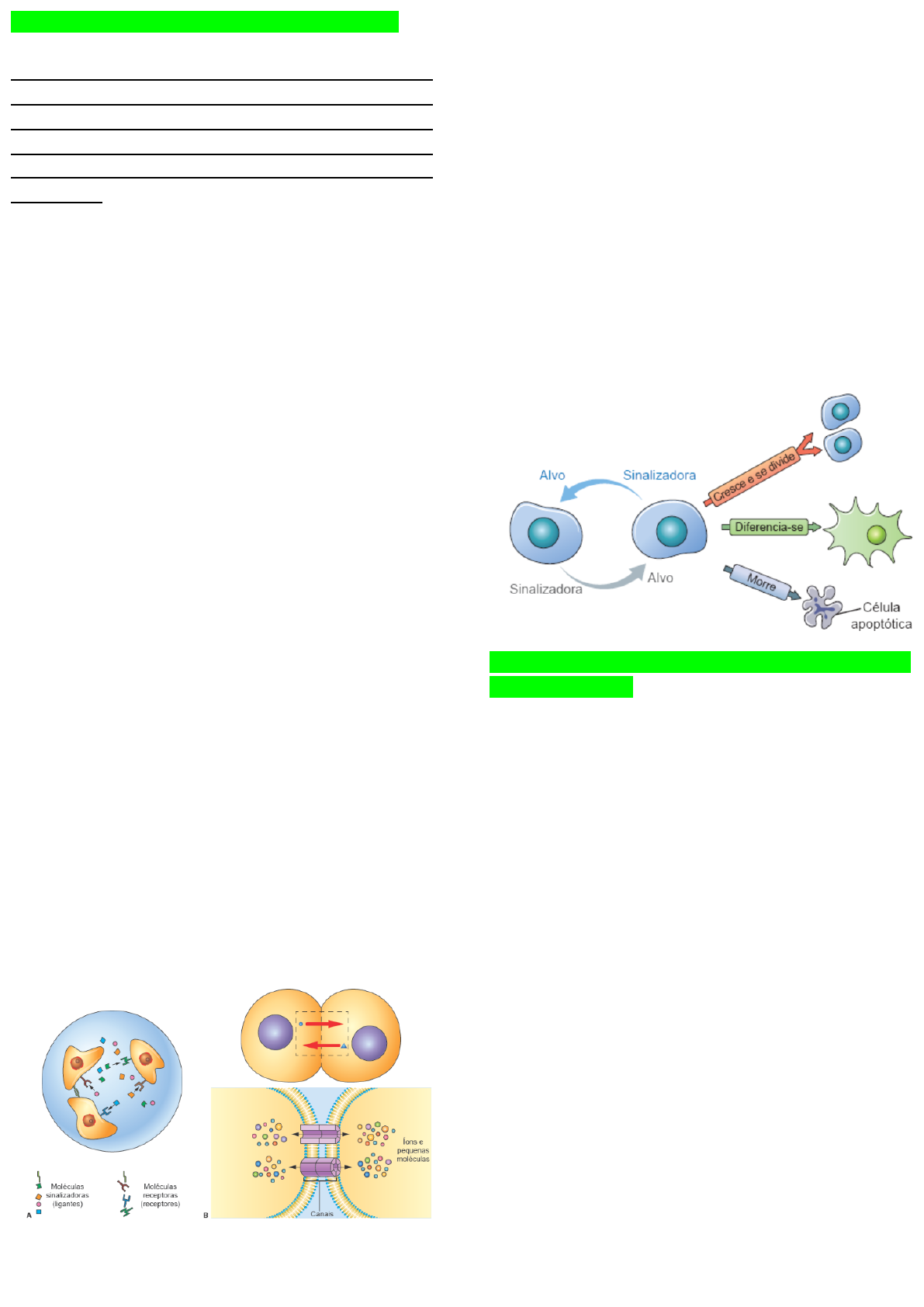 COMUNICAÇÃO E SINALIZAÇÃO CELULAR Comunicação celular é a capacidade que toda célula apresenta de processar as informações provenientes do seu meio ambiente ou de outras células e desenvolver uma atividade ou comportamento específico em resposta a esses estímulos. Toda informação que chega até a célula produz uma sequência específica de eventos intracelulares que induz uma resposta àquele dado inicial. Essa cascata de eventos intracelulares também é conhecida como sinalização celular. Por meio da comunicação e da sinalização celular, as células interagem com o meio ambiente e as outras células, modulando suas funções. A falta da comunicação celular é um sinal para as células saudáveis ativarem o mecanismo interno de morte celular programada (apoptose). A troca de informação entre as células pode ocorrer por meio de moléculas que se conectam com proteínas receptoras ou que atravessam canais existentes entre duas células. A forma mais comum de comunicação ocorre por meio de moléculas que se ligam aos receptores, também chamadas “moléculas sinalizadoras ou ligantes”, produzidas por células que enviarão a mensagem para outras células. Essas moléculas sinalizadoras poderão ser secretadas para o meio extracelular, agindo nas células-alvo próximas ou distantes, ou ainda, ser mantidas na superfície celular da célula sinalizadora, influenciando apenas as células adjacentes. Além dos processos que envolvem ligantes e receptores, algumas células comunicam-se diretamente por meio de moléculas que atravessam canais existentes entre células contíguas. Esses canais são constituídos por moléculas proteicas das membranas de duas células, em regiões intituladas junções comunicantes ou gap junctions. A comunicação entre as células ocorre nos dois sentidos, ou seja, as células que emitem sinais (células sinalizadoras) produzem os ligantes para as células que receberão os sinais (células-alvo), mas podem ser também alvo de sinais e vice-versa. A resposta da célula depende da integração de dois componentes: (1) dos sinais extracelulares recebidos em um momento específico, pois em um organismo multicelular uma célula individual pode receber múltiplos sinais simultaneamente; (2) do repertório de moléculas presentes na célula-alvo, incluindo os receptores e as moléculas sinalizadoras intracelulares. COMPONENTES BÁSICOS E ETAPAS DA COMUNICAÇÃO A comunicação celular que se inicia por meio de uma molécula sinalizadora apresenta alguns componentes fundamentais para que essa interação aconteça, como a presença de um ligante (um hormônio, um feromônio ou um neurotransmissor, por exemplo), produzido por uma célula sinalizadora e que encontrará uma célula-alvo. O ligante interage com um receptor específico localizado na célula-alvo, que pode estar na superfície da célula (na membrana plasmática) ou em seu interior (citoplasma ou núcleo). Toda informação que chega até a célula constitui uma sequência específica de eventos que acaba produzindo um resultado final, que é a resposta da célula àquele estímulo inicial. Essa cascata de eventos também é conhecida como sinalização celular, pois cada passo desse processo é um agente sinalizador para o início da próxima etapa. A comunicação celular, ou sinalização celular, produzida por um sinal extracelular envolve sete passos: (1) síntese da molécula sinalizadora; (2) liberação ou externalização da molécula sinalizadora; (3) transporte da molécula sinalizadora até a célula-alvo; (4) detecção do sinal por um receptor específico na célula-alvo; (5) ativação de uma cascata de sinalização intracelular; (6) resposta celular ao sinal recebido, podendo ser proliferação, alteração do metabolismo celular, síntese proteica, secreção, migração, diferenciação etc; (7) remoção do sinal e desligamento da sinalização, o que, geralmente, implica encerramento da resposta celular. A resposta da célula a um sinal depende da ligação da molécula ligante com um receptor proteico específico. A molécula sinalizadora encaixa-se em um sítio deste receptor e essa interação induz uma alteração conformacional no receptor, denominada “ativação do receptor”, que iniciará uma sequência de reações em cascata e resultará em uma resposta celular. A primeira molécula a sofrer essa alteração (o receptor) interage com uma segunda molécula, que se comunica com a molécula seguinte e assim por diante. Essa ativação atua amplificando o sinal. No fim dessa via de sinalização esse sinal alcançará moléculas encarregadas de executar a resposta celular final, por isso nomeadas “moléculas (ou proteínas) efetoras”. Como exemplo de moléculas efetoras, há os fatores de transcrição (que alterarão a expressão gênica), as proteínas do citoesqueleto (que mudarão a arquitetura e o padrão de adesão e migração celular. FOSFORILAÇÃO E ATIVAÇÃO DA CASCATA DE SINALIZAÇÃO Após a ativação do receptor pelo ligante, as proteínas sinalizadoras intracelulares e as efetoras são ativadas e/ou inativadas como se fossem “interruptores” que ligam ou desligam a sinalização iniciada. Esses interruptores são acionados processos de fosforilação–desfosforilação, que consistem na adição de um grupo fosfato a uma molécula e sua remoção, respectivamente. A adição de um grupo fosfato à cadeia lateral de uma proteína pode causar a alteração conformacional da proteína, promovendo sua ligação com outras moléculas intracelulares, e também pode tornar essa proteína reconhecível para outras proteínas, estimulando a interação e ativação. Na maioria das vezes, a fosforilação ocorre em resíduos de serina, treonina ou tirosina das proteínas, sendo, portanto, uma alteração pós-traducional, por ocorrer após a tradução (síntese) proteica. Nas vias de sinalização intracelulares, a fosforilação p